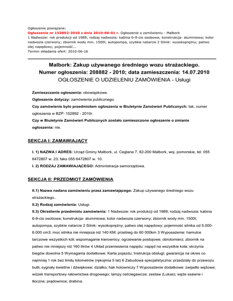 Ogłoszenie powiązane: Ogłoszenie nr 152892-2010 z dnia 2010-06-01 r. Ogłoszenie o zamówieniu - Malbork 1 Nadwozie: rok produkcji od 1989; rodzaj nadwozia: kabina 6-9-cio osobowa; konstrukcja- aluminiowa; kolor nadwozia czerwony; zbiornik wody min. 1500l; autopompa, szybkie natarcie 2 Silnik: wysokoprężny; paliwo olej napędowy; pojemność... Termin składania ofert: 2010-06-16 Malbork: Zakup używanego średniego wozu strażackiego. Numer ogłoszenia: 208882 - 2010; data zamieszczenia: 14.07.2010 OGŁOSZENIE O UDZIELENIU ZAMÓWIENIA - Usługi Zamieszczanie ogłoszenia: obowiązkowe. Ogłoszenie dotyczy: zamówienia publicznego. Czy zamówienie było przedmiotem ogłoszenia w Biuletynie Zamówień Publicznych: tak, numer ogłoszenia w BZP: 152892 - 2010r. Czy w Biuletynie Zamówień Publicznych zostało zamieszczone ogłoszenie o zmianie ogłoszenia: nie. SEKCJA I: ZAMAWIAJĄCY I. 1) NAZWA I ADRES: Urząd Gminy Malbork, ul. Ceglana 7, 82-200 Malbork, woj. pomorskie, tel. 055 6472807 w. 23, faks 055 6472807 w. 10. I. 2) RODZAJ ZAMAWIAJĄCEGO: Administracja samorządowa. SEKCJA II: PRZEDMIOT ZAMÓWIENIA II.1) Nazwa nadana zamówieniu przez zamawiającego: Zakup używanego średniego wozu strażackiego.. II.2) Rodzaj zamówienia: Usługi. II.3) Określenie przedmiotu zamówienia: 1 Nadwozie: rok produkcji od 1989; rodzaj nadwozia: kabina 6-9-cio osobowa; konstrukcja- aluminiowa; kolor nadwozia czerwony; zbiornik wody min. 1500l; autopompa, szybkie natarcie 2 Silnik: wysokoprężny; paliwo olej napędowy; pojemność silnika od 5.0006.000 cm3; moc silnika nie mniejsza niż 140 KM; przebieg do 60 000km 3 Wyposażenie: hamulce tarczowe wszystkich kół; wspomaganie kierownicy; ogrzewanie postojowe; obrotomierz; zbiornik na paliwo nie mniejszy niż 160 litrów 4 Układ przeniesienia napędu: napęd na wszystkie koła; skrzynia biegów dowolna 5 Wymagania dodatkowe: Karta pojazdu; Instrukcja obsługi; gwarancja na okres co najmniej 1 rok bez limitu kilometrów (rękojmia 5 lat) 6 Zabudowa specjalistyczna: przedziały do przewozu butli; sygnały świetlne i dźwiękowe; działko; hak holowniczy 7 Wyposażenie dodatkowe: zwijadło wężowe; wózek transportowy ratownictwa drogowego; lampy ostrzegawcze; zestaw (Lukas); węże ssawne i tłoczne; prądownice; drabina. II.4) Wspólny Słownik Zamówień (CPV): 34.14.42.10-0. SEKCJA III: PROCEDURA III.1) TRYB UDZIELENIA ZAMÓWIENIA: Przetarg nieograniczony III.2) INFORMACJE ADMINISTRACYJNE • Zamówienie dotyczy projektu/programu finansowanego ze środków Unii Europejskiej: nie SEKCJA IV: UDZIELENIE ZAMÓWIENIA IV.1) DATA UDZIELENIA ZAMÓWIENIA: 05.07.2010. IV.2) LICZBA OTRZYMANYCH OFERT: 1. IV.3) LICZBA ODRZUCONYCH OFERT: 0. IV.4) NAZWA I ADRES WYKONAWCY, KTÓREMU UDZIELONO ZAMÓWIENIA: • Joanna Dachowska,, Baumschulenstr. 17,, Berlin, kraj/woj. Niemcy. IV.5) Szacunkowa wartość zamówienia (bez VAT): 81967,00 PLN. IV.6) INFORMACJA O CENIE WYBRANEJ OFERTY ORAZ O OFERTACH Z NAJNIŻSZĄ I NAJWYŻSZĄ CENĄ • Cena wybranej oferty: 100000,00 • Oferta z najniższą ceną: 100000,00 / Oferta z najwyższą ceną: 100000,00 • Waluta: PLN.