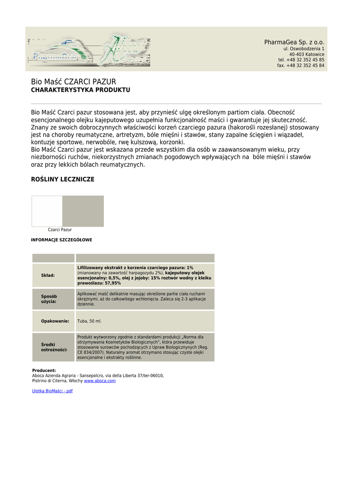 PharmaGea Sp. z o.o. ul. Oswobodzenia 1 40-403 Katowice tel. +48 32 352 45 85 fax. +48 32 352 45 84 Bio Maść CZARCI PAZUR CHARAKTERYSTYKA PRODUKTU Bio Maść Czarci pazur stosowana jest, aby przynieść ulgę określonym partiom ciała. Obecność esencjonalnego olejku kajeputowego uzupełnia funkcjonalność maści i gwarantuje jej skuteczność. Znany ze swoich dobroczynnych właściwości korzeń czarciego pazura (hakorośli rozesłanej) stosowany jest na choroby reumatyczne, artretyzm, bóle mięśni i stawów, stany zapalne ścięgien i wiązadeł, kontuzje sportowe, nerwobóle, rwę kulszową, korzonki. Bio Maść Czarci pazur jest wskazana przede wszystkim dla osób w zaawansowanym wieku, przy niezborności ruchów, niekorzystnych zmianach pogodowych wpływających na bóle mięśni i stawów oraz przy lekkich bólach reumatycznych. ROŚLINY LECZNICZE Czarci Pazur INFORMACJE SZCZEGÓŁOWE Skład: Lifilizowany ekstrakt z korzenia czarciego pazura: 1% (mianowany na zawartość harpagozydu 2%), kajeputowy olejek esencjonalny: 0,5%, olej z jojoby: 15% roztwór wodny z kleiku prawoślazu: 57,95% Sposób użycia: Aplikować maść delikatnie masując określone partie ciała ruchami okrężnymi, aż do całkowitego wchłonięcia. Zaleca się 2-3 aplikacje dziennie. Opakowanie: Tuba, 50 ml. Środki ostrożności: Produkt wytworzony zgodnie z standardami produkcji „Norma dla otrzymywania Kosmetyków Biologicznych”, która przewiduje stosowanie surowców pochodzących z Upraw Biologicznynych (Reg. CE 834/2007). Naturalny aromat otrzymano stosując czyste olejki esencjonalne i ekstrakty roślinne. Producent: Aboca Azienda Agraria - Sansepolcro, via della Liberta 37/ter-06010, Pistrino di Citerna, Włochy www.aboca.com Ulotka BioMaści - pdf