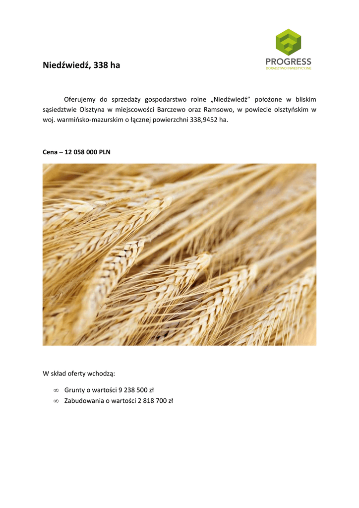 Niedźwiedź, 338 ha Oferujemy do sprzedaży gospodarstwo rolne „Niedźwiedź” położone w bliskim sąsiedztwie Olsztyna w miejscowości Barczewo oraz Ramsowo, w powiecie olsztyńskim w woj. warmińsko-mazurskim o łącznej powierzchni 338,9452 ha. Cena – 12 058 000 PLN W skład oferty wchodzą: • • Grunty o wartości 9 238 500 zł Zabudowania o wartości 2 818 700 zł Grunty są położone na pofałdowanym terenie umożliwiajacym bezproblemową ich uprawę. W ostatnim czasie na terenie gospodarstwa była prowadzona produkcja roślinna a struktura zasiewów kształtowała się następująco: • • • • • żyto – 50 ha, pszenica – 50 ha, jęczmień – 50 ha, użytki zielone – 100 ha, odłogowanie – 90 ha. Do gruntów zostały przyznane dopłaty bezpośrednie w wysokości około 300 tys. zł Bonitacja gruntów: RIII b 18,7675 RIV a 126,1185 RIV b 54,3203 RV 3,5700 RVI 0,7700 Ł IV 9,2500 ŁV 5,4100 Ł VI 2,4300 Ps III 6,2500 Ps IV 45,7543 Ps V 4,2600 Lz IV 2,0200 Lz V 7,4300 Lz VI 3,4400 N 16,8317 W 1,7800 Ls IV 10,6465 Ls V 8,9145 dr 1,1544 pozostałe 9,5075 (dr RIVa, dr PsIV, B-Ps IV, Bp PsIV S-R IVa) Budynki i budowle wchodzące w skład gospodarstwa: 1. stodoła - magazyn zbożowy, 344 m² powierzchni użytkowej; 2. chlewnia porodowa, 1892 m² powierzchni użytkowej; 3. obora, 1419 m² powierzchni użytkowej; 4. warsztat, 401m² powierzchni użytkowej; 5. garaż, 216 m² powierzchni użytkowej; 6. szopogaraż, 498 m² powierzchni użytkowej; 7. szopogaraż, 415 m² powierzchni użytkowej; 8. tuczarnia, 1080 m² powierzchni użytkowej; 9. tuczarnia, 1080 m² powierzchni użytkowej; 10. warchlakarnia, 926 m² powierzchni użytkowej; 11. tuczarnia, 1080 m² powierzchni użytkowej; 12. paszarnia, 468 m² powierzchni użytkowej; 13. budynek administracyjny, 287 m² powierzchni użytkowej; 14. budynek wielofunkcyjny, 271 m² powierzchni użytkowej; 15. budynek magazynu zbożowego nowy, 134 m² powierzchni użytkowej; 16. waga wozowa, 14 m² powierzchni użytkowej; 17. skład opału, 24 m² powierzchni użytkowej; 18. rampa warsztat, 62 m² powierzchni użytkowej; 19. utwardzenie placu warsztatu, 2039 m² powierzchni użytkowej; 20. ogrodzenie chlewnia, 321 m² powierzchni użytkowej; 21. drogi i place – fermy, 3509 m² powierzchni użytkowej; 22. linia energii i SN na fermie, 735 m² powierzchni użytkowej; 23. silos na kiszonkę, 888 m² powierzchni użytkowej; 24. budka z rampą, 12,7 m² powierzchni użytkowej; 25. zewnętrzna sieć kanalizacji fermy, 180 m² powierzchni użytkowej; 26. ogrodzenie fermy, 1180 m² powierzchni użytkowej; 27. zadaszenie wsypu zboża, 57 m² powierzchni użytkowej; 28. droga asfaltowa, 1480 m² powierzchni użytkowej. Gospodarstwo jest własnością spółki z o.o. Szczegóły oferty: ul. Krzywa 2, 11-015 Olsztynek e-mail: [email protected] tel. 501 07 57 57, 608 000 009