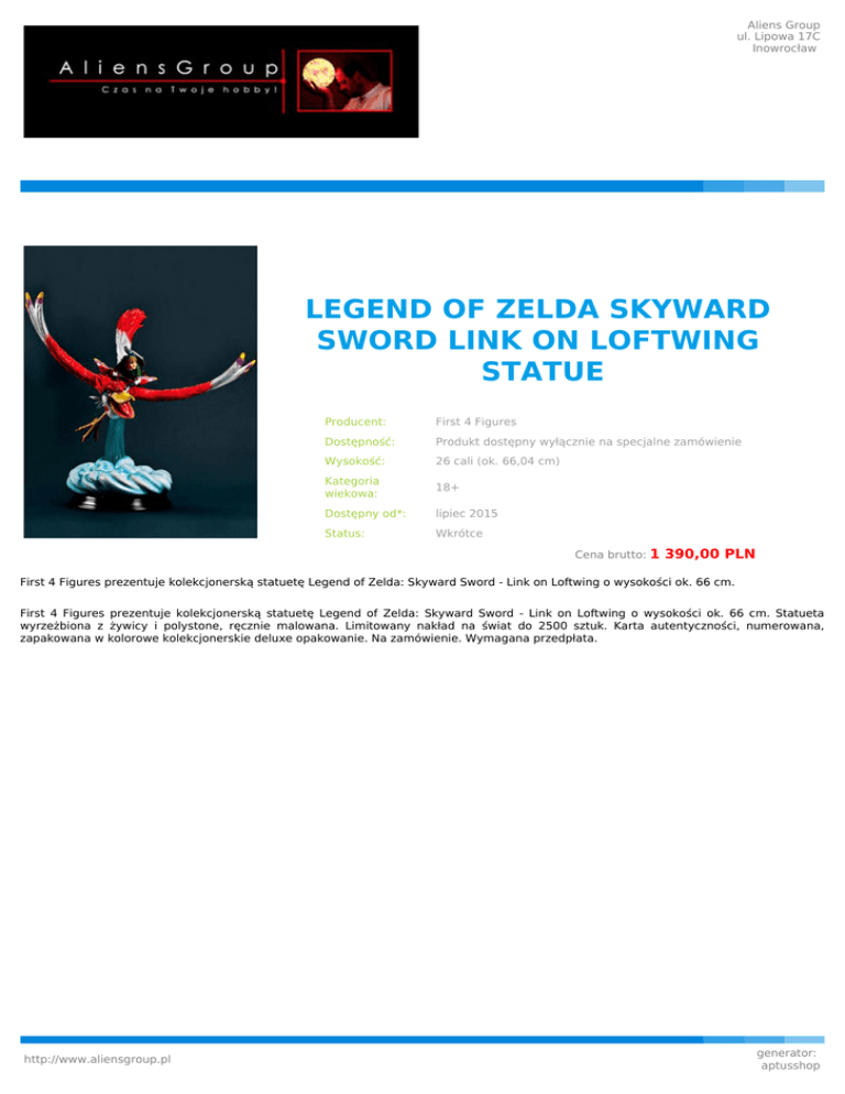 Aliens Group ul. Lipowa 17C Inowrocław LEGEND OF ZELDA SKYWARD SWORD LINK ON LOFTWING STATUE Producent: First 4 Figures Dostępność: Produkt dostępny wyłącznie na specjalne zamówienie Wysokość: 26 cali (ok. 66,04 cm) Kategoria wiekowa: 18+ Dostępny od*: lipiec 2015 Status: Wkrótce Cena brutto: 1 390,00 PLN First 4 Figures prezentuje kolekcjonerską statuetę Legend of Zelda: Skyward Sword - Link on Loftwing o wysokości ok. 66 cm. First 4 Figures prezentuje kolekcjonerską statuetę Legend of Zelda: Skyward Sword - Link on Loftwing o wysokości ok. 66 cm. Statueta wyrzeżbiona z żywicy i polystone, ręcznie malowana. Limitowany nakład na świat do 2500 sztuk. Karta autentyczności, numerowana, zapakowana w kolorowe kolekcjonerskie deluxe opakowanie. Na zamówienie. Wymagana przedpłata. http://www.aliensgroup.pl generator: aptusshop