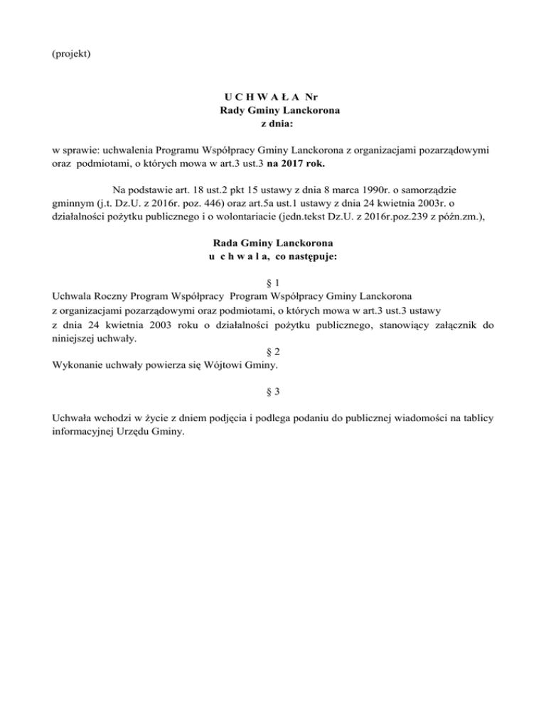 (projekt) U C H W A Ł A Nr Rady Gminy Lanckorona z dnia: w sprawie: uchwalenia Programu Współpracy Gminy Lanckorona z organizacjami pozarządowymi oraz podmiotami, o których mowa w art.3 ust.3 na 2017 rok. Na podstawie art. 18 ust.2 pkt 15 ustawy z dnia 8 marca 1990r. o samorządzie gminnym (j.t. Dz.U. z 2016r. poz. 446) oraz art.5a ust.1 ustawy z dnia 24 kwietnia 2003r. o działalności pożytku publicznego i o wolontariacie (jedn.tekst Dz.U. z 2016r.poz.239 z późn.zm.), Rada Gminy Lanckorona u c h w a l a, co następuje: §1 Uchwala Roczny Program Współpracy Program Współpracy Gminy Lanckorona z organizacjami pozarządowymi oraz podmiotami, o których mowa w art.3 ust.3 ustawy z dnia 24 kwietnia 2003 roku o działalności pożytku publicznego, stanowiący załącznik do niniejszej uchwały. §2 Wykonanie uchwały powierza się Wójtowi Gminy. §3 Uchwała wchodzi w życie z dniem podjęcia i podlega podaniu do publicznej wiadomości na tablicy informacyjnej Urzędu Gminy. Załącznik do Uchwały nr Rady Gminy w Lanckoronie z dnia : Program współpracy Gminy Lanckorona z organizacjami pozarządowymi oraz podmiotami, o których mowa w art.3 ust.3ustawy z dnia 24 kwietnia 2003 roku o działalności pożytku publicznego na 2017 rok I. Postanowienia ogólne § 1.Ilekroć w programie jest mowa o : 1) ustawie – rozumie się przez to ustawę z dnia 24 kwietnia 2003 roku o działalności pożytku publicznego i o wolontariacie ( jedn.tekst Dz.U. z 2016r.poz.239 z późn.zm.), 2) uczestnikach programu –rozumie się przez to organizacje pozarządowe oraz podmioty prowadzące działalność pożytku publicznego, o których mowa w art.3 ust.3, 3) programie- rozumie się przez to Program współpracy Gminy Lanckorona z organizacjami pozarządowymi oraz podmiotami, o których mowa w art.3 ust.3 Ustawy z dnia 24 kwietnia 2003 roku o działalności pożytku publicznego i o wolontariacie na rok 2017, 4) konkursie- rozumie się przez to otwarty konkurs ofert, o którym mowa w art.11 ust.2 i w art.13 ustawy. II. Cel główny i cele szczegółowe programu § 2. Celem głównym Programu jest zwiększenie i wzmocnienie udziału mieszkańców gminy oraz organizacji pozarządowych i innych podmiotów pożytku publicznego, we współpracy z samorządem gminy w kreowaniu i realizacji usług publicznych zmierzających do podniesienia jakości życia mieszkańców. § 3. Cele szczegółowe obejmują: 1)podniesienie skuteczności i efektywności działań podejmowanych w sferze zadań publicznych, 2) określenie obszarów, kierunków i form wzajemnej współpracy oraz udzielania pomocy organizacjom pozarządowym przez samorząd gminy, 3) budowanie lokalnego społeczeństwa obywatelskiego i wspomaganie rozwoju społeczności lokalnej, w tym: a) wykorzystanie potencjału mieszkańców Gminy poprzez wspieranie działań i inicjatyw obywatelskich podejmowanych na rzecz wspólnego dobra; b) promocja postaw obywatelskich i prospołecznych poprzez popularyzacje dobrych praktyk; c) rozwijanie i umacnianie poczucia przynależności do lokalnej społeczności a więc odpowiedzialności za siebie, swoje otoczenie, wspólnotę lokalną oraz jej tradycję; d) zwiększenie udziału mieszkańców Gminy w definiowaniu i rozwiązywaniu lokalnych problemów, e) prowadzenie nowatorskich i efektywnych działań na rzecz mieszkańców, f) wspieranie i upowszechnianie wolontariatu. III. Zasady współpracy § 4 Współpraca przy realizacji zadań publicznych pomiędzy organizacjami pozarządowymi i innymi podmiotami a gminą odbywa się na zasadach: partnerstwa- zgodnie z którą obie strony, jako równoprawni partnerzy współdziałają na rzecz Gminy Lanckorona i jej mieszkańców, wspólnie identyfikują i definiują problemy społeczne oraz zadania publiczne – celem wypracowania sposobów ich rozwiązywania oraz wykonywania zadań publicznych i ponoszą odpowiedzialność za ich realizację, pomocniczości – w świetle której gmina respektując odrębność i suwerenność zorganizowanych wspólnot obywateli, uznając ich prawo do samodzielnego definiowania i rozwiązywania problemów, będzie współpracować z organizacjami, wspierać ich działalność oraz umożliwi realizację zadań publicznych na zasadach określonych w ustawie, efektywności – w myśl której obie strony wspólnie dbają o to, żeby poniesione nakłady na realizowane zadania przynosiły jak najlepsze rezultaty oraz na racjonalnym, czyli dokonywanym w sposób celowy, oszczędny i terminowy wydatkowaniu środków publicznych, suwerenności stron – polegającą na poszanowaniu i respektowaniu niezależności i odrębności współpracujących podmiotów we wzajemnych relacjach, uczciwej konkurencji – w świetle której wszystkie podmioty mają takie same szanse w dostępie do realizacji zadań publicznych, udostępniają sobie pełną i prawdziwą informację na temat obszarów swojego działania, które są istotne z punktu widzenia wspólnej realizacji zadań publicznych na rzecz gminy i jej mieszkańców, jawności- polegającej na kształtowaniu przejrzystych zasad współpracy, opartych na jednolitych dla wszystkich podmiotów, równych i jawnych kryteriach i warunkach wyboru realizatorów zadań publicznych. IV. Zakres przedmiotowy § 5. Współpraca Samorządu Gminy z podmiotami Programu dotyczy zadań określonych w art. 4 ustawy, w szczególności ustawowych zadań własnych gminy, realizowanych odpowiednio do terytorialnego zakresu działania gminy, w następujących obszarach: 1) pomocy społecznej, w tym pomocy rodzinom i osobom w trudnej sytuacji życiowej oraz wyrównywania szans tych rodzin i osób, 2) działalności wspomagającej rozwój wspólnot i społeczności lokalnych, 3) kultury, sztuki, ochrony dóbr kultury i dziedzictwa narodowego, 4) wypoczynku dzieci i młodzieży, 5) wspierania i upowszechniania kultury fizycznej, 6) ochrony i promocji zdrowia, 7) przeciwdziałania uzależnieniom i patologiom społecznym. V