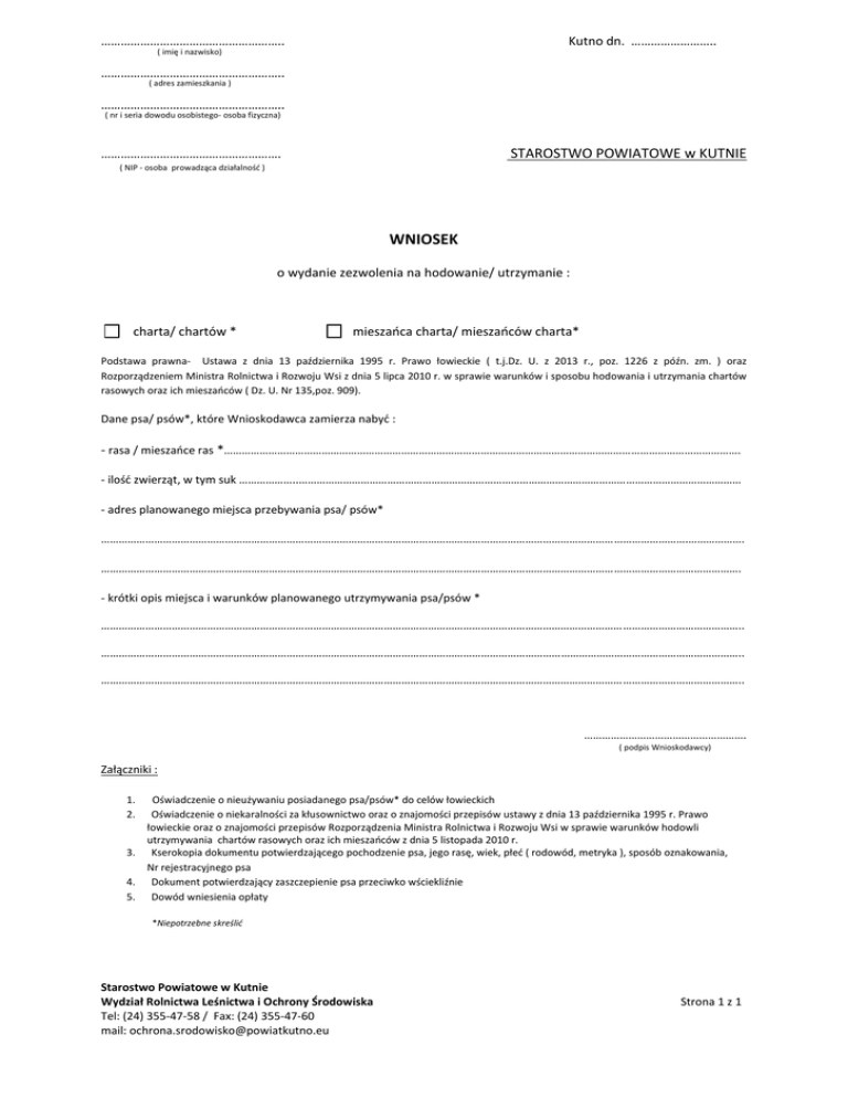 ……………………………………………….. Kutno dn. …………………….. ( imię i nazwisko) ……………………………………………….. ( adres zamieszkania ) ……………………………………………….. ( nr i seria dowodu osobistego- osoba fizyczna) STAROSTWO POWIATOWE w KUTNIE ………………………………………………. ( NIP - osoba prowadząca działalność ) WNIOSEK o wydanie zezwolenia na hodowanie/ utrzymanie : charta/ chartów * mieszańca charta/ mieszańców charta* Podstawa prawna- Ustawa z dnia 13 października 1995 r. Prawo łowieckie ( t.j.Dz. U. z 2013 r., poz. 1226 z późn. zm. ) oraz Rozporządzeniem Ministra Rolnictwa i Rozwoju Wsi z dnia 5 lipca 2010 r. w sprawie warunków i sposobu hodowania i utrzymania chartów rasowych oraz ich mieszańców ( Dz. U. Nr 135,poz. 909). Dane psa/ psów*, które Wnioskodawca zamierza nabyć : - rasa / mieszańce ras *…………………………………………………………………………………………………………………………………………………………. - ilość zwierząt, w tym suk ………………..…………………………………………………………………………………………………………………………………… - adres planowanego miejsca przebywania psa/ psów* ……………………………………………………………………………………………………………………………………………………………………………….………………. ………………………………………………………………………………………………………………………………………………………………………………………………. - krótki opis miejsca i warunków planowanego utrzymywania psa/psów * ……………………………………………………………………………………………………………………………………………………………………………………………….. ……………………………………………………………………………………………………………………………………………………………………………………………….. ……………………………………………………………………………………………………………………………………………………………………………………………….. ………………………………………………. ( podpis Wnioskodawcy) Załączniki : 1. 2. 3. 4. 5. Oświadczenie o nieużywaniu posiadanego psa/psów* do celów łowieckich Oświadczenie o niekaralności za kłusownictwo oraz o znajomości przepisów ustawy z dnia 13 października 1995 r. Prawo łowieckie oraz o znajomości przepisów Rozporządzenia Ministra Rolnictwa i Rozwoju Wsi w sprawie warunków hodowli utrzymywania chartów rasowych oraz ich mieszańców z dnia 5 listopada 2010 r. Kserokopia dokumentu potwierdzającego pochodzenie psa, jego rasę, wiek, płeć ( rodowód, metryka ), sposób oznakowania, Nr rejestracyjnego psa Dokument potwierdzający zaszczepienie psa przeciwko wściekliźnie Dowód wniesienia opłaty *Niepotrzebne skreślić Starostwo Powiatowe w Kutnie Wydział Rolnictwa Leśnictwa i Ochrony Środowiska Tel: (24) 355-47-58 / Fax: (24) 355-47-60 mail: [email protected] Strona 1 z 1