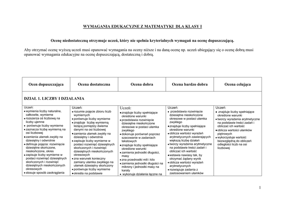 WYMAGANIA EDUKACYJNE Z MATEMATYKI DLA KLASY I Ocenę niedostateczną otrzymuje uczeń, który nie spełnia kryterialnych wymagań na ocenę dopuszczającą. Aby otrzymać ocenę wyższą uczeń musi opanować wymagania na oceny niższe i na daną ocenę np. uczeń ubiegający się o ocenę dobrą musi opanować wymagania edukacyjne na ocenę dopuszczającą, dostateczną i dobrą. Ocen dopuszczająca Ocena dostateczna Ocena dobra Ocena bardzo dobra Ocena celująca DZIAŁ 1. LICZBY I DZIAŁANIA Uczeń: wymienia liczby naturalne, całkowite, wymierne rozszerza oś liczbową na liczby ujemne porównuje liczby wymierne zaznacza liczbę wymierną na osi liczbowej zamienia ułamek zwykły na dziesiętny i odwrotnie definiuje pojęcia: rozwinięcie dziesiętne skończone, nieskończone, okres zapisuje liczby wymierne w postaci rozwinięć dziesiętnych skończonych i rozwinięć dziesiętnych nieskończonych okresowych stosuje sposób zaokrąglania Uczeń: rozumie pojęcie zbioru liczb wymiernych porównuje liczby wymierne znajduje liczbę wymierną leżącą pomiędzy dwiema danymi na osi liczbowej zamienia ułamek zwykły na dziesiętny i odwrotnie zapisuje liczby wymierne w postaci rozwinięć dziesiętnych skończonych i rozwinięć dziesiętnych nieskończonych okresowych zna warunek konieczny zamiany ułamka zwykłego na ułamek dziesiętny skończony porównuje liczby wymierne określa na podstawie Uczeń: znajduje liczby spełniające określone warunki przedstawia rozwinięcie dziesiętne nieskończone okresowe w postaci ułamka zwykłego dokonuje porównań poprzez szacowanie w zadaniach tekstowych znajduje liczby spełniające określone warunki zamienia jednostki długości, masy zna przedrostki mili i kilo zamienia jednostki długości na mikrony i jednostki masy na karaty wykonuje działania łączne na Uczeń: przedstawia rozwinięcie dziesiętne nieskończone okresowe w postaci ułamka zwykłego znajduje liczby spełniające określone warunki oblicza wartości wyrażeń arytmetycznych zawierających większą liczbę działań tworzy wyrażenia arytmetyczne na podstawie treści zadań i obliczać ich wartość wstawia nawiasy tak, by otrzymać żądany wynik oblicza wartości wyrażeń arytmetycznych rozwiązuje zadania z zastosowaniem ułamków Uczeń: znajduje liczby spełniające określone warunki tworzy wyrażenia arytmetyczne na podstawie treści zadań i obliczać ich wartość oblicza wartości ułamków piętrowych wykorzystuje wartość bezwzględną do obliczeń odległości liczb na osi liczbowej 1 liczb rozumie potrzebę zaokrąglania liczb zaokrągla liczbę do danego rzędu szacuje wyniki działań dodaje i odejmuje liczby wymierne dodatnie zapisane w jednakowej postaci podaje liczbę odwrotną do danej mnoży i dzieli przez liczbę naturalną oblicza ułamek danej liczby naturalnej zna kolejność wykonywania działań dodaje, odejmuje, mnoży i dzieli dwie liczby ujemne oraz o różnych znakach definiuje pojęcie liczb przeciwnych odczytuje z osi liczbowej liczby spełniające określony warunek opisuje zbiór liczb za pomocą nierówności zaznacza na osi liczbowej liczby spełniające określoną nierówność definiuje pojęcie odległości między dwiema liczbami na osi liczbowej na podstawie rysunku osi liczbowej określa odległość między liczbami rozwinięcia dziesiętnego, czy dana liczba jest liczbą wymierną rozumie potrzebę zaokrąglania liczb zaokrągla liczbę do danego rzędu zaokrągla liczbę o rozwinięciu dziesiętnym nieskończonym okresowym do danego rzędu szacuje wyniki działań dodaje i odejmuje liczby wymierne dodatnie zapisane w różnych postaciach mnoży i dzieli liczby wymierne dodatnie oblicza liczbę na podstawie danego jej ułamka wykonuje działania łączne na liczbach wymiernych dodatnich oblicza potęgi liczb wymiernych stosuje prawa działań zaznacza na osi liczbowej liczby spełniające określoną nierówność zapisuje nierówność, jaką spełniają liczby z zaznaczonego na osi liczbowej zbioru oblicza odległość między liczbami na osi liczbowej liczbach wymiernych dodatnich oblicza wartości wyrażeń arytmetycznych zawierających większą liczbę działań zapisuje podane słownie wyrażenia arytmetyczne i obliczać jego wartość (R) tworzy wyrażenia arytmetyczne na podstawie treści zadań i obliczać ich wartość wykorzystuje kalkulator uzupełnia brakujące liczby w dodawaniu, odejmowaniu, mnożeniu i dzieleniu tak, by otrzymać ustalony wynik (R) oblicza wartości wyrażeń arytmetycznych zawierających wartość bezwzględną stosuje prawa działań oblicza wartości wyrażeń arytmetycznych rozwiązuje zadania z zastosowaniem ułamków zaznacza na osi liczbowej zbiór liczb, które spełniają jednocześnie dwie nierówności znajduje zbiór liczb spełniających kilka warunków znajduje liczby znajdujące się w określonej odległości na osi liczbowej od danej liczby wykorzystuje wartość bezwzględną do obliczeń odległości liczb na osi liczbowej zaznacza na osi liczbowej zbiór liczb, które spełniają jednocześnie dwie nierówności znajduje zbiór liczb spełniających kilka warunków znajduje liczby znajdujące się w określonej odległości na osi liczbowej od danej liczby wykorzystuje wartość bezwzględną do obliczeń odległości liczb na osi liczbowej DZIAŁ 2. PROCENTY 2 definiuje pojęcie procentu wskazuje przykłady zastosowań procentów w życiu codziennym zamienia procent na ułamek zamienia ułamek na procent określa procentowo zaznaczoną część figury i zaznaczyć procent danej figury definiuje pojęcie diagramu procentowego rozumie potrzebę stosowania diagramów do wizualizacji informacji odczytuje z diagramów potrzebne informacje oblicza jakim procentem jednej liczby jest druga liczba oblicza procent danej liczby rozumie pojęcia podwyżka (obniżka) o pewien procent oblicza podwyżkę (obniżkę) o pewien procent oblicza podwyżkę (obniżkę) o pewien procent 