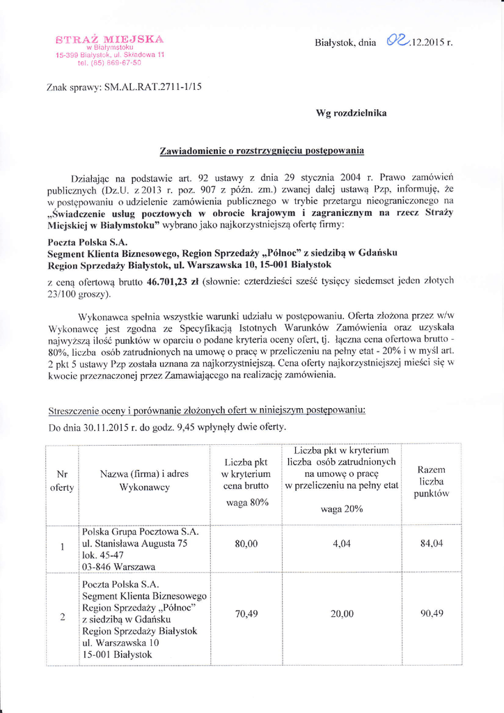 MIF-IJSKA sTRAżBialymstoku Białystok, W l5-399 Białyslok, Ul, skladowa tel. (85) B69-67 50 dnia ?Ł.n.zots r. 11 Znak sprawy: SM.AL.RAT.271 1-1l15 Wg rozdzielnika zawiadomienie o rozstrzyqnieciu postepowania Działając na podstańe ań. 92 ustawy z dnia 29 stycznia 2004 r. Prawo zamówień publicznych (Dz.lJ. z20l3 t, poz. 907 z późn. zm.) zwanej dalej ustawą Pzp, informuję, że w postępowaniu o udzielenie zamówienia publicznego w trybie przetargu nieograniczonego na ,,Świadczenie usług pocztowych w obrocie krajowym i zagranicznym na rzecz Straą Miejskiej w BiaĘmstoku" wybrano jako najkorzystniej szą ofeńę firmy: Poczta Polska S.A. Segm€nt Klienta Biznesowego, Region Sprzedaży ,,Północ" z siedzibą w Gdańsku 'Warszawska 10, 15-001 BiaĘstok Region SprzedaĘ BiaĘstok, ul. z ceną ofeńową brutto 46.701.23 zł (słownie: cńetdzięści sześó tysięcy siedemset jeden złotych 231100 groszy). Wykonawca spełnia wszystkie warunki udziału w postępowaniu. Oferta ńożona prz.ez, w/w Wykonawcę jest zgodna ze Specyfikacją Istotnych Warunków Zamówienia oraz uzyskńa nalwyższą ilośćpunktów w oparciu o podane kryteria oceny ofert, tj. łączna cena ofeńowa brutto 8Ooń,liczba osób zatrudnionych na umowę o pracę w przeliczeniu na peĘ etat - 20%o i w myślart. 2 pkt 5 ustawy Pzp zastńa lznana za najkorzystniej szą. Cena ofeńy najkorzystniej szej mieŚci się w kwocie przeznac zonej przez Zarnawiaj ącego na realizację zamówienia. Streszczenię oceny i porównanie złożonychofert w ninieiszvm posteoowaniu: Do dnia 30.1 1 .2015 r. do godz.9,45 wpłynęłydwie oferty. Nr ofeńy Nazwa (firma) i adres Wykonawcy Liczba pkt w kryterium cena brutto waga 807o Polska Grupa Pocztowa S.A. ul. Stanisława Augusta 75 lok.45-47 03-846 Warszawa Liczba pkt w kqłeńum liczba osób zatrudnionych na rrmowę o pracę w przeliczeniu na pełny etat Razem liczba punktów waga20%o 80,00 4,04 84,04 70,49 20.00 90,49 Pocża Polska S.A. Segment Klienta Biznesowego ż Region Sprzeda,źy,,Północ" z siedzibą w Gdańsku Region Sprzedaży Białystok ul. Warszawska 10 15-001 Białystok W przedmiotowym postępowaniu udziń wzięło dwóch Wykonawców. Żadęn z Wykonawców nie został wykluc zony. Żadna ofeńa nie została odrzucona. Zgodnie z art. 94 ust 1 pkt 2 ustawy Pzp Zamavńający zunierza zawrzeć umowę w sprawie zamówienia publicznego z wybranym Wykonawcą w terminie nie krótszym niż 5 dni od dnia przesłania niniejszego zańadomienia, nie później jednak niż przed upływem terminu związania ofertą. Rozdzielnik: l . 2. ]. Wykonawcy Biuletyn Informacji Publiczrej Tablica ogłoszeń Zarnawiającego