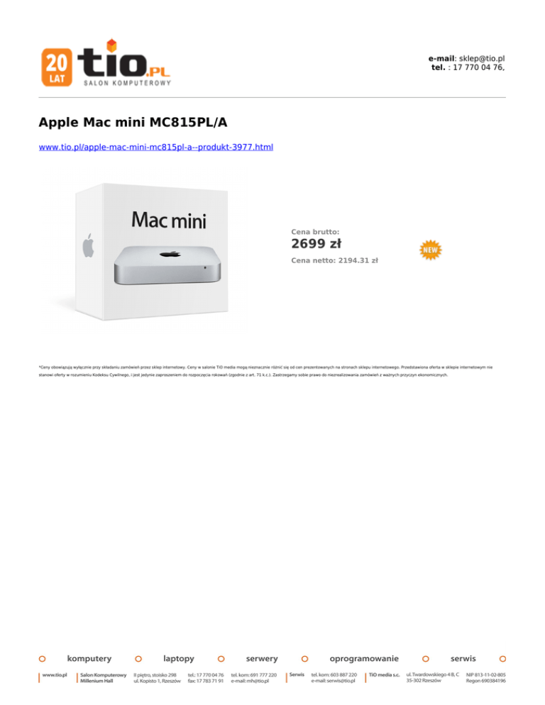 e-mail: [email protected] tel. : 17 770 04 76, Apple Mac mini MC815PL/A www.tio.pl/apple-mac-mini-mc815pl-a--produkt-3977.html Cena brutto: 2699 zł Cena netto: 2194.31 zł *Ceny obowiązują wyłącznie przy składaniu zamówień przez sklep internetowy. Ceny w salonie TiO media mogą nieznacznie różnić się od cen prezentowanych na stronach sklepu internetowego. Przedstawiona oferta w sklepie internetowym nie stanowi oferty w rozumieniu Kodeksu Cywilnego, i jest jedynie zaproszeniem do rozpoczęcia rokowań (zgodnie z art. 71 k.c.). Zastrzegamy sobie prawo do niezrealizowania zamówień z ważnych przyczyn ekonomicznych.