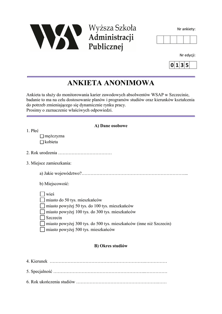 Nr ankiety: Nr edycji: 0135 ANKIETA ANONIMOWA Ankieta ta służy do monitorowania karier zawodowych absolwentów WSAP w Szczecinie, badanie to ma na celu dostosowanie planów i programów studiów oraz kierunków kształcenia do potrzeb zmieniającego się dynamicznie rynku pracy. Prosimy o zaznaczenie właściwych odpowiedzi. A) Dane osobowe 1. Płeć mężczyzna kobieta 2. Rok urodzenia ……………………………… 3. Miejsce zamieszkania: a) Jakie województwo?……………………………………………………………... b) Miejscowość: wieś miasto do 50 tys. mieszkańców miasto powyżej 50 tys. do 100 tys. mieszkańców miasto powyżej 100 tys. do 300 tys. mieszkańców Szczecin miasto powyżej 300 tys. do 500 tys. mieszkańców (inne niż Szczecin) miasto powyżej 500 tys. mieszkańców B) Okres studiów 4. Kierunek ……………………………………………………….…………… 5. Specjalność ……………………………………………………..…………… 6. Rok ukończenia studiów ……………………………………………….…… 2 7. Tryb studiów stacjonarne (dzienne) niestacjonarne (wieczorowe, zaoczne) 8. Zaangażowanie w życie Uczelni w trakcie studiów: działalność w samorządzie studenckim działalność w kole naukowym działalność w innej organizacji studenckiej nie działałem(am) w żadnej z wyżej wymienionych 9. Czy pracował(a) Pan(i) w trakcie studiów? tak nie → przejść do pyt. 11 10. Praca ta była związana z: kierunkiem studiów z wykształceniem zdobytym na poziomie szkoły średniej z zainteresowaniami tylko z celami finansowymi inne (jakie?)…………………………………………………………………. C) Aktualne zatrudnienie 11. Jaki jest Pana(i) status zawodowy? zatrudniony → przejść do pyt. 13 bezrobotny inny (jaki?)……………………………………………………………. 12. Czy nie pracuje Pan(i) ponieważ (pytanie dotyczy osób niezatrudnionych): nie szukam pracy szukam pracy zgodnej z wykształceniem szukam pracy spełniającej moje oczekiwania finansowe kontynuuję edukację nie mogę znaleźć żadnej pracy inne (jakie?)………………………………………………. → przejść do pyt. 19 3 13. Czy jest to zatrudnienie w formie: umowy o pracę umowy cywilnoprawnej samozatrudnienie inne (jakie?)……………………………………………………………. 14. Jakie stanowisko zajmuje Pan(i)? kierownicze specjalistyczne managerskie administracyjne fizyczne inne (jakie?)……………………………………………………………. 15. Jaki jest poziom Pana(i) zarobków? minimum krajowe poniżej średniej krajowej średnia krajowa powyżej średniej krajowej 16. Jaki jest status zatrudniającej Pana(ią) firmy? budżetowa prywatne przedsiębiorstwo własna działalność gospodarcza przedsiębiorstwo zagraniczne inna (jaka?)……………………………………………………………. 17. Jaka branża? ……………………………………………………….………… 18. Czy wykonywana praca jest zgodna z Pana(i) kierunkiem studiów? tak nie 19. Czy zamierza Pan(i) szukać pracy poza granicami kraju? tak nie 4 20. Czy zamierza Pan(i) obecnie lub w przyszłości założyć własną firmę? już założyłem(am) tak, zamierzam nie zamierzam D) Pierwsza praca po ukończeniu studiów 21. Jak długo poszukiwał(a) Pan(i) pracy po ukończeniu studiów? nie dotyczy – dopiero ukończyłem(am) studia → przejść do pyt. 24 do 3 miesięcy od 3 do 6 miesięcy powyżej 6 miesięcy do 1 roku powyżej 1 roku nie szukałem(am) pracy 22. Czy była to (jest) kontynuacja pracy podjętej podczas studiów (przed studiami)? tak nie 23. Gdzie znalazł(a) Pan(i) ofertę pracy? w Biurze Karier Uczelni w Internecie w prasie dzięki praktyce w firmie poprzez krewnych, znajomych gdzie indziej E) Ocena trafności wybranego kierunku studiów w WSAP 24. Czy jest na rynku pracy zapotrzebowanie na zdobytą przez Pana(ią) na studiach wiedzę i umiejętności? tak nie 25. Czy studia we WSAP w Szczecinie spełniły Pana(i) oczekiwania odnośnie przekazanej wiedzy i umiejętności? tak nie 5 26. Które z podanych typów zajęć były najbardziej przydatne w Pana(i) karierze zawodowej? przedmioty ściśle związane z kierunkiem studiów przedmioty społeczno-humanistyczne języki obce F) Ocena trafności wybranego kierunku studiów w WSAP 27. Jestem absolwentem WSAP w Szczecinie, który ukończył(a) studia w bieżącym roku ukończył(a) studia we WSAP w Szczecinie kilka lat temu → przejść do pyt. 35 Pytania dla tegorocznych absolwentów. 28. Czy po ukończeniu studiów ma Pan(i) zamiar kontynuować naukę na studiach II stopnia? tak nie → przejść do pyt. 30 29. Na jakiej uczelni i jaki kierunek zamierza Pan(i) studiować? a) uczelnia……………………………………………………………………………… b) kierunek……………………………………………………………………………… 30. Czy po ukończeniu studiów zamierza Pan(i) uczestniczyć a) w szkoleniach specjalistycznych? tak nie b) studiach podyplomowych? tak nie a) stażach? tak nie 31. Czy jest Pan(i) zainteresowany(a) studiami podyplomowymi w Wyższej Szkole Administracji Publicznej w Szczecinie? tak (jakimi?)………………………………………………………………………………… ………………………………………………………………………………………….. nie 6 32. Czy korzystał(a) Pan(i) z bezpłatnych usług Biura Karier tak nie 33. Czy jest Pan(i) zainteresowany(a) z korzystania z ofert Biura Karier tak nie 34. Czy śledzi) Pan(i) stronę internetową Uczelni (www.wsap.szczecin.pl)? tak nie Dziękujemy za wypełnienie ankiety. Pytania dla absolwentów sprzed roku lub więcej 35. Czy po ukończeniu studiów kontynuował(a) Pan(i) naukę na studiach II stopnia? tak, j