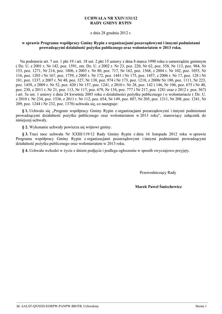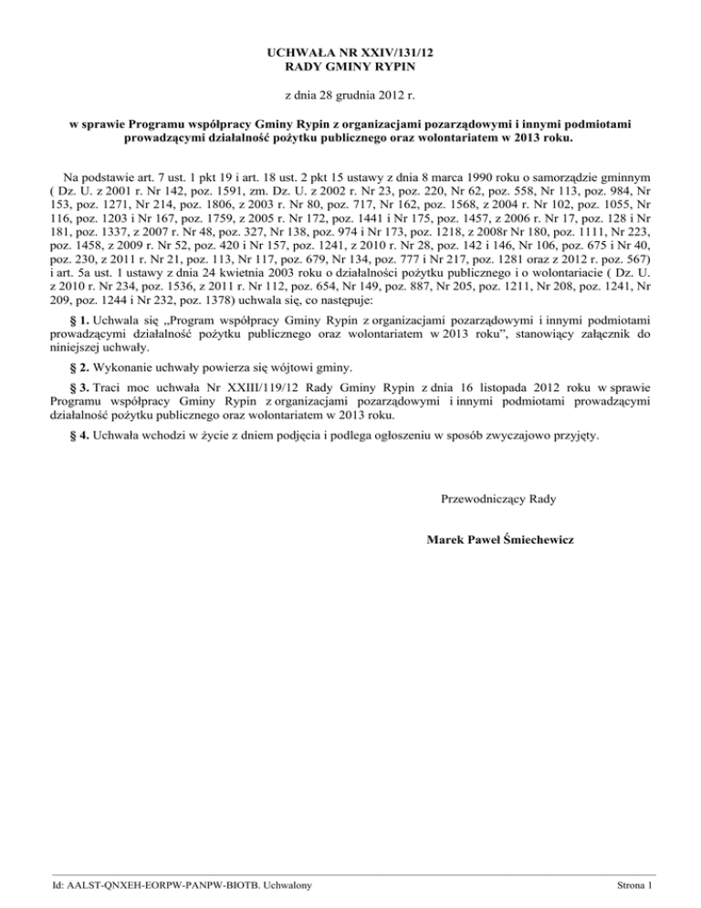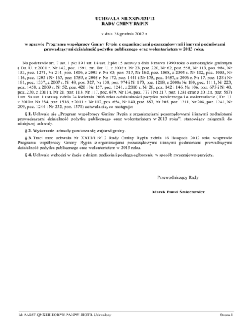 UCHWAŁA NR XXIV/131/12 RADY GMINY RYPIN z dnia 28 grudnia 2012 r. w sprawie Programu współpracy Gminy Rypin z organizacjami pozarządowymi i innymi podmiotami prowadzącymi działalność pożytku publicznego oraz wolontariatem w 2013 roku. Na podstawie art. 7 ust. 1 pkt 19 i art. 18 ust. 2 pkt 15 ustawy z dnia 8 marca 1990 roku o samorządzie gminnym ( Dz. U. z 2001 r. Nr 142, poz. 1591, zm. Dz. U. z 2002 r. Nr 23, poz. 220, Nr 62, poz. 558, Nr 113, poz. 984, Nr 153, poz. 1271, Nr 214, poz. 1806, z 2003 r. Nr 80, poz. 717, Nr 162, poz. 1568, z 2004 r. Nr 102, poz. 1055, Nr 116, poz. 1203 i Nr 167, poz. 1759, z 2005 r. Nr 172, poz. 1441 i Nr 175, poz. 1457, z 2006 r. Nr 17, poz. 128 i Nr 181, poz. 1337, z 2007 r. Nr 48, poz. 327, Nr 138, poz. 974 i Nr 173, poz. 1218, z 2008r Nr 180, poz. 1111, Nr 223, poz. 1458, z 2009 r. Nr 52, poz. 420 i Nr 157, poz. 1241, z 2010 r. Nr 28, poz. 142 i 146, Nr 106, poz. 675 i Nr 40, poz. 230, z 2011 r. Nr 21, poz. 113, Nr 117, poz. 679, Nr 134, poz. 777 i Nr 217, poz. 1281 oraz z 2012 r. poz. 567) i art. 5a ust. 1 ustawy z dnia 24 kwietnia 2003 roku o działalności pożytku publicznego i o wolontariacie ( Dz. U. z 2010 r. Nr 234, poz. 1536, z 2011 r. Nr 112, poz. 654, Nr 149, poz. 887, Nr 205, poz. 1211, Nr 208, poz. 1241, Nr 209, poz. 1244 i Nr 232, poz. 1378) uchwala się, co następuje: § 1. Uchwala się „Program współpracy Gminy Rypin z organizacjami pozarządowymi i innymi podmiotami prowadzącymi działalność pożytku publicznego oraz wolontariatem w 2013 roku”, stanowiący załącznik do niniejszej uchwały. § 2. Wykonanie uchwały powierza się wójtowi gminy. § 3. Traci moc uchwała Nr XXIII/119/12 Rady Gminy Rypin z dnia 16 listopada 2012 roku w sprawie Programu współpracy Gminy Rypin z organizacjami pozarządowymi i innymi podmiotami prowadzącymi działalność pożytku publicznego oraz wolontariatem w 2013 roku. § 4. Uchwała wchodzi w życie z dniem podjęcia i podlega ogłoszeniu w sposób zwyczajowo przyjęty. Przewodniczący Rady Marek Paweł Śmiechewicz ————————————————————————————————————————————————————————— Id: AALST-QNXEH-EORPW-PANPW-BIOTB. Uchwalony Strona 1 Załącznik do Uchwały Nr XXIV/131/12 Rady Gminy Rypin z dnia 28 grudnia 2012 r. Program współpracy Gminy Rypin z organizacjami pozarządowymi i innymi podmiotami prowadzącymi działalność pożytku publicznego oraz wolontariatem w 2013 roku. Rozdział 1. Postanowienia ogólne. 1. Ilekroć w niniejszym „Programie” mowa o: 1) ustawie – rozumie się przez to ustawę z dnia 24 kwietnia 2003 roku o działalności pożytku publicznego i o wolontariacie (Dz. U. z 2010 r. Nr 234, poz. 1536 z późn. zm.); 2) organizacjach pozarządowych – rozumie się przez to osoby prawne i jednostki organizacyjne, o których mowa w art. 3 ust. 2 i 3 ustawy z dnia 24 kwietnia 2003 roku o działalności pożytku publicznego i o wolontariacie; 3) programie - rozumie się przez to Program współpracy Gminy Rypin z organizacjami pozarządowymi i innymi podmiotami prowadzącymi działalność pożytku publicznego oraz wolontariatem w 2013 roku; 4) konkursie – rozumie się przez to otwarty konkurs ofert, o którym mowa w art. 11 ust. 2 i w art. 13 ustawy z dnia 24 kwietnia 2003 roku o działalności pożytku publicznego i o wolontariacie. 2. Obszar współpracy Gminy Rypin i organizacji pozarządowych obejmuje zadania publiczne, o których mowa w art. 4 ustawy. Rozdział 2. Cel główny i cele szczegółowe Programu. 1. Celem głównym programu jest kształtowanie społeczeństwa obywatelskiego i rozwiązywanie problemów społecznych w środowisku lokalnym, poprzez budowanie i umacnianie partnerstwa pomiędzy gminą a organizacjami pozarządowymi. 2. Cele szczegółwe programu to: 1) podniesienie jakości życia i pełniejsze zaspokojenie potrzeb mieszkańców gminy poprzez zwiększenie aktywności organizacji pozarządowych; 2) stworzenie warunków do powstania inicjatyw i struktur funkcjonujących na rzecz społeczności lokalnej; 3) promocja działalności organizacji pozarządowych; 4) wykorzystanie potencjału i możliwości organizacji pozarządowych; 5) otwarcie na innowacyjność i konkurencyjność w wykonywaniu zadań publicznych; 6) integracja organizacji pozarządowych realizujących zadania publiczne; 7) promowanie i wzmacnianie postaw obywatelskich; 8) podnoszenie skuteczności i efektywności działań w sferze zadań publicznych. Rozdział 3. Zasady współpracy. Współpraca Gminy Rypin z organizacjami pozarządowymi odbywa się na zasadach: 1) pomocniczości – polegającej na wspieraniu działalności organizacji pozarządowych oraz umożliwianiu im realizacji zadań publicznych; 2) suwerenności stron – oznaczającej, że gmina i organizacje pozarządowe podejmujące współpracę zachowują wzajemną autonomię i niezależność względem siebie; ————————————————————————————————————————————————————————— Id: AALST-QNXEH-EORPW-PANPW-BIOTB. Uchwalony Strona 1 3) partnerstwa – oznaczającego, że strony ustalają zakres współpracy, uczestniczą w identyfikowaniu i definiowaniu problemów społecznych i zadań, wypracowywaniu najlepszych sposobów ich realizacji, traktując się wzajemnie jako podmioty równoprawne w tych procesach; 4) efektywności – polegającej na wspólnym dążeniu do osiągnięcia możliwie najlepszych efektów w realizacji zadań publicznych; 5) uczciwej konkurencji – oznaczającej równe traktowanie wszystkich podmiotów w zakresie wykonywanych działań; 6) jawności – kreującej jawne dla wszystkich obywateli procedury postępowania przy realizacji zadań publicznych przez organizacje pozarządowe, sposób udzielania oraz wykonywania zadania są jawne. Rozdział 4. Zakres przedmiotowy. 1. Prz
