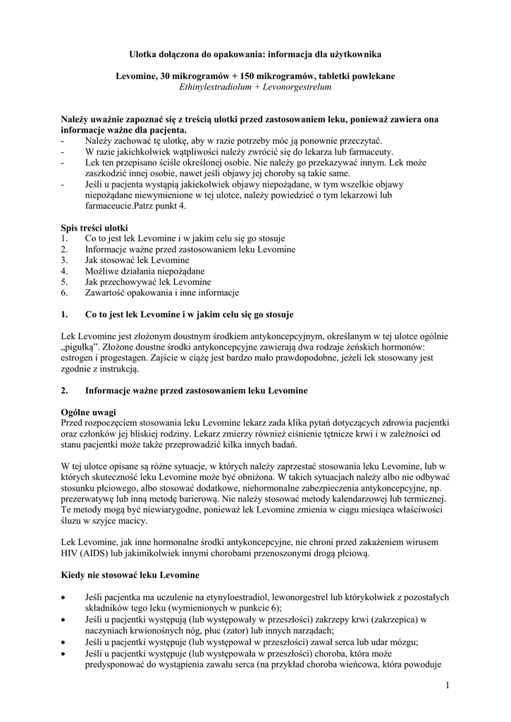 Ulotka dołączona do opakowania: informacja dla użytkownika Levomine, 30 mikrogramów + 150 mikrogramów, tabletki powlekane Ethinylestradiolum + Levonorgestrelum Należy uważnie zapoznać się z treścią ulotki przed zastosowaniem leku, ponieważ zawiera ona informacje ważne dla pacjenta. Należy zachować tę ulotkę, aby w razie potrzeby móc ją ponownie przeczytać. W razie jakichkolwiek wątpliwości należy zwrócić się do lekarza lub farmaceuty. Lek ten przepisano ściśle określonej osobie. Nie należy go przekazywać innym. Lek może zaszkodzić innej osobie, nawet jeśli objawy jej choroby są takie same. Jeśli u pacjenta wystąpią jakiekolwiek objawy niepożądane, w tym wszelkie objawy niepożądane niewymienione w tej ulotce, należy powiedzieć o tym lekarzowi lub farmaceucie.Patrz punkt 4. Spis treści ulotki 1. Co to jest lek Levomine i w jakim celu się go stosuje 2. Informacje ważne przed zastosowaniem leku Levomine 3. Jak stosować lek Levomine 4. Możliwe działania niepożądane 5. Jak przechowywać lek Levomine 6. Zawartość opakowania i inne informacje 1. Co to jest lek Levomine i w jakim celu się go stosuje Lek Levomine jest złożonym doustnym środkiem antykoncepcyjnym, określanym w tej ulotce ogólnie „pigułką”. Złożone doustne środki antykoncepcyjne zawierają dwa rodzaje żeńskich hormonów: estrogen i progestagen. Zajście w ciążę jest bardzo mało prawdopodobne, jeżeli lek stosowany jest zgodnie z instrukcją. 2. Informacje ważne przed zastosowaniem leku Levomine Ogólne uwagi Przed rozpoczęciem stosowania leku Levomine lekarz zada klika pytań dotyczących zdrowia pacjentki oraz członków jej bliskiej rodziny. Lekarz zmierzy również ciśnienie tętnicze krwi i w zależności od stanu pacjentki może także przeprowadzić kilka innych badań. W tej ulotce opisane są różne sytuacje, w których należy zaprzestać stosowania leku Levomine, lub w których skuteczność leku Levomine może być obniżona. W takich sytuacjach należy albo nie odbywać stosunku płciowego, albo stosować dodatkowe, niehormonalne zabezpieczenia antykoncepcyjne, np. prezerwatywę lub inną metodę barierową. Nie należy stosować metody kalendarzowej lub termicznej. Te metody mogą być niewiarygodne, ponieważ lek Levomine zmienia w ciągu miesiąca właściwości śluzu w szyjce macicy. Lek Levomine, jak inne hormonalne środki antykoncepcyjne, nie chroni przed zakażeniem wirusem HIV (AIDS) lub jakimikolwiek innymi chorobami przenoszonymi drogą płciową. Kiedy nie stosować leku Levomine Jeśli pacjentka ma uczulenie na etynyloestradiol, lewonorgestrel lub którykolwiek z pozostałych składników tego leku (wymienionych w punkcie 6); Jeśli u pacjentki występują (lub występowały w przeszłości) zakrzepy krwi (zakrzepica) w naczyniach krwionośnych nóg, płuc (zator) lub innych narządach; Jeśli u pacjentki występuje (lub występował w przeszłości) zawał serca lub udar mózgu; Jeśli u pacjentki występuje (lub występowała w przeszłości) choroba, która może predysponować do wystąpienia zawału serca (na przykład choroba wieńcowa, która powoduje 1 ostry ból w klatce piersiowej) lub udaru mózgu (na przykład przemijający niewielki udar mózgu bez dalszych skutków); Jeśli u pacjentki występuje choroba, która może zwiększać ryzyko zakrzepicy w naczyniach tętniczych. Dotyczy to następujących chorób: - Cukrzyca z uszkodzeniami naczyń krwionośnych, - Bardzo wysokie ciśnienie tętnicze krwi, - Bardzo wysoki poziom tłuszczów we krwi (cholesterol lub triglicerydy); Jeśli u pacjentki występują zaburzenia krzepnięcia krwi (na przykład niedobór białka C); Jeśli u pacjentki występuje (występował) pewien rodzaj migreny (z tak zwanymi ogniskowymi objawami neurologicznymi); Jeśli u pacjentki występuje (występowało) zapalenie trzustki; Jeśli u pacjentki występuje lub występowała w przeszłości choroba wątroby i wątroba nadal nie funkcjonuje prawidłowo; Jeśli u pacjentki występuje lub występował w przeszłości guz wątroby; Jeśli u pacjentki występuje (występował) lub jeśli podejrzewa się występowanie raka piersi lub raka narządów płciowych; Jeśli u pacjentki występuje jakiekolwiek niewyjaśnione krwawienie z pochwy; Jeśli u pacjentki występuje brak miesiączki i nie jest znana tego przyczyna. Ostrzeżenia i środki ostrożności Przed rozpoczęciem przyjmowania leku Levomine należy omówić to z lekarzem lub farmaceutą. W niektórych sytuacjach pacjentka musi zachować szczególną ostrożność podczas stosowania leku Levomine lub jakiegokolwiek innego złożonego hormonalnego środka antykoncepcyjnego, oraz może być konieczna regularna kontrola stanu zdrowia pacjentki przez lekarza. Jeśli którakolwiek z następujących chorób dotyczy pacjentki, należy poinformować o tym lekarza przed rozpoczęciem przyjmowania leku Levomine. Również jeśli którakolwiek z poniższych chorób wystąpi lub nasili się podczas przyjmowania leku Levomine, należy skonsultować się z lekarzem: Jeśli u członków bliskiej rodziny występuje lub występował rak piersi; Jeśli u pacjentki występuje choroba wątroby lub pęcherzyka żółciowego; Jeśli u pacjentki występuje cukrzyca; Jeśli u pacjentki występuje depresja; Jeśli u pacjentki występuje choroba Crohna lub wrzodziejące zapalenie okrężnicy (choroba zapalna jelita); Jeśli u pacjentki występuje hemolityczny zespół mocznicowy (choroba krwi, która powoduje uszkodzenie nerek); Jeśli u pacjentki występuje padaczka (patrz „Lek Levomine a inne leki”); Jeśli u pacjentki występuje toczeń rumieniowaty układowy (choroba układu immunologicznego); Jeśli u pacjentki występuje choroba, która po raz pierwszy pojawiła się w czasie ciąży lub podczas wcześniejszego stosowania hormonów płciowych na przykład utrata słuchu, porfiria (choroba krwi), pemfigoid ciężarnych (wysypka skórna z pęcherzami występu
