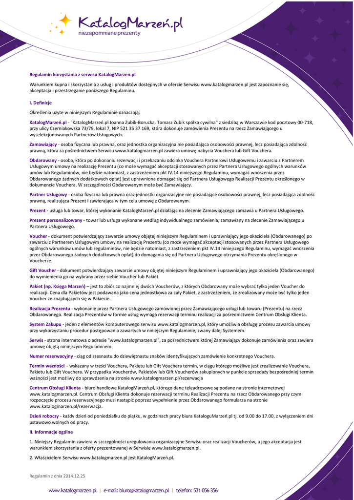Regulamin korzystania z serwisu KatalogMarzen.pl Warunkiem kupna i skorzystania z usług i produktów dostępnych w ofercie Serwisu www.katalogmarzen.pl jest zapoznanie się, akceptacja i przestrzeganie poniższego Regulaminu. I. Definicje Określenia użyte w niniejszym Regulaminie oznaczają: KatalogMarzeń.pl - "KatalogMarzeń.pl Joanna Zubik-Borucka, Tomasz Zubik spółka cywilna" z siedzibą w Warszawie kod pocztowy 00-718, przy ulicy Czerniakowska 73/79, lokal 7, NIP 521 35 37 169, która dokonuje zamówienia Prezentu na rzecz Zamawiającego u wyselekcjonowanych Partnerów Usługowych. Zamawiający - osoba fizyczna lub prawna, oraz jednostka organizacyjna nie posiadająca osobowości prawnej, lecz posiadająca zdolność prawną, która za pośrednictwem Serwisu www.katalogmarzen.pl zawiera umowę nabycia Vouchera lub Gift Vouchera. Obdarowany - osoba, która po dokonaniu rezerwacji i przekazaniu odcinka Vouchera Partnerowi Usługowemu i zawarciu z Partnerem Usługowym umowy na realizację Prezentu (co może wymagać akceptacji stosowanych przez Partnera Usługowego ogólnych warunków umów lub Regulaminów, nie będzie natomiast, z zastrzeżeniem pkt IV.14 niniejszego Regulaminu, wymagać wnoszenia przez Obdarowanego żadnych dodatkowych opłat) jest uprawniona domagać się od Partnera Usługowego Realizacji Prezentu określonego w dokumencie Vouchera. W szczególności Obdarowanym może być Zamawiający. Partner Usługowy - osoba fizyczna lub prawna oraz jednostki organizacyjne nie posiadające osobowości prawnej, lecz posiadająca zdolność prawną, realizująca Prezent i zawierająca w tym celu umowę z Obdarowanym. Prezent - usługa lub towar, której wykonanie KatalogMarzeń.pl działając na zlecenie Zamawiającego zamawia u Partnera Usługowego. Prezent personalizowany - towar lub usługa wykonane według indywidualnego zamówienia, zamawiany na zlecenie Zamawiającego u Partnera Usługowego. Voucher - dokument potwierdzający zawarcie umowy objętej niniejszym Regulaminem i uprawniający jego okaziciela (Obdarowanego) po zawarciu z Partnerem Usługowym umowy na realizację Prezentu (co może wymagać akceptacji stosowanych przez Partnera Usługowego ogólnych warunków umów lub regulaminów, nie będzie natomiast, z zastrzeżeniem pkt IV.14 niniejszego Regulaminu, wymagać wnoszenia przez Obdarowanego żadnych dodatkowych opłat) do domagania się od Partnera Usługowego otrzymania Prezentu określonego w Voucherze. Gift Voucher - dokument potwierdzający zawarcie umowy objętej niniejszym Regulaminem i uprawniający jego okaziciela (Obdarowanego) do wymienienia go na wybrany przez siebie Voucher lub Pakiet. Pakiet (np. Księga Marzeń) – jest to zbiór co najmniej dwóch Voucherów, z których Obdarowany może wybrać tylko jeden Voucher do realizacji. Cena dla Pakietów jest podawana jako cena jednostkowa za cały Pakiet, z zastrzeżeniem, że zrealizowany może być tylko jeden Voucher ze znajdujących się w Pakiecie. Realizacja Prezentu - wykonanie przez Partnera Usługowego zamówionej przez Zamawiającego usługi lub towaru (Prezentu) na rzecz Obdarowanego. Realizacja Prezentów w formie usług wymaga rezerwacji terminu realizacji za pośrednictwem Centrum Obsługi Klienta. System Zakupu - jeden z elementów komputerowego serwisu www.katalogmarzen.pl, który umożliwia obsługę procesu zawarcia umowy przy wykorzystaniu procedur postępowania zawartych w niniejszym Regulaminie, zwany dalej Systemem. Serwis - strona internetowa o adresie "www.katalogmarzen.pl", za pośrednictwem której Zamawiający dokonuje zamówienia oraz zawiera umowę objętą niniejszym Regulaminem. Numer rezerwacyjny - ciąg od szesnastu do dziewiętnastu znaków identyfikujących zamówienie konkretnego Vouchera. Termin ważności – wskazany w treści Vouchera, Pakietu lub Gift Vouchera termin, w ciągu którego możliwe jest zrealizowanie Vouchera, Pakietu lub Gift Vouchera. W przypadku Voucherów, Pakietów lub Gift Voucherów zakupionych w punkcie sprzedaży bezpośredniej termin ważności jest możliwy do sprawdzenia na stronie www.katalogmarzen.pl/rezerwacja Centrum Obsługi Klienta - biuro handlowe KatalogMarzeń.pl, którego dane teleadresowe są podane na stronie internetowej www.katalogmarzen.pl. Centrum Obsługi Klienta dokonuje rezerwacji terminu Realizacji Prezentu na rzecz Obdarowanego przy czym rozpoczęcie procesu rezerwacyjnego musi nastąpić poprzez wypełnienie przez Obdarowanego formularza na stronie www.katalogmarzen.pl/rezerwacja. Dzień roboczy - każdy dzień od poniedziałku do piątku, w godzinach pracy biura KataloguMarzeń.pl tj. od 9.00 do 17.00, z wyłączeniem dni ustawowo wolnych od pracy. II. Informacje ogólne 1. Niniejszy Regulamin zawiera w szczególności uregulowania organizacyjne Serwisu oraz realizacji Voucherów, a jego akceptacja jest warunkiem skorzystania z oferty prezentowanej w Serwisie www.katalogmarzen.pl. 2. Właścicielem Serwisu www.katalogmarzen.pl jest KatalogMarzeń.pl. Regulamin z dnia 2014.12.25 3. Bezpośrednimi usługodawcami realizującymi Prezenty są Partnerzy Usługowi. Realizacja Prezentu następuje po zawarciu pomiędzy Partnerem Usługowym a Obdarowanym odpowiedniej umowy na realizację Prezentu (co może wymagać akceptacji stosowanych przez Partnera Usługowego ogólnych warunków umów i regulaminów, nie będzie natomiast, z zastrzeżeniem pkt IV.14 niniejszego Regulaminu, wymagać wnoszenia przez Obdarowanego żadnych dodatkowych opłat). Odmowa Partnera Usługowego zawarcia wskazanej w niniejszym punkcie umowy stanowi podstawę do zwrotu ceny Vouchera Zamawiającemu przez KatalogMarzeń.pl. 4. Voucher może być zrealizowany tylko przez osobę, której dane zostaną podane w trakcie rezerwacji terminu Realizacji Prezentu. 5. KatalogMarzeń.pl przyjmuje, że każdy Zamawiający oraz Obdarowany, we własnym interesie podaje wszelkie informacje w sposób prawidłowy i w zgodzie ze stanem faktycznym; w związku z cz