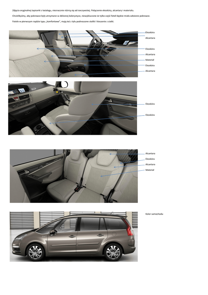 Zdjęcia oryginalnej tapicerki z katalogu, nieznacznie różnią się od rzeczywistej. Połączenie ekoskóry, alcantary i materiału. Chcielibyśmy, aby pokrowce były utrzymane w zbliżonej kolorystyce, niewykluczone że tylko część foteli będzie miała założone pokrowce. Fotele w pierwszym rzędzie typu „komfortowe”, mają też z tyłu podnoszone stoliki i kieszenie z siatki. Ekoskóra Alcantara Ekoskóra Alcantara Materiał Ekoskóra Alcantara Ekoskóra Ekoskóra Alcantara Ekoskóra Alcantara Materiał Kolor samochodu
