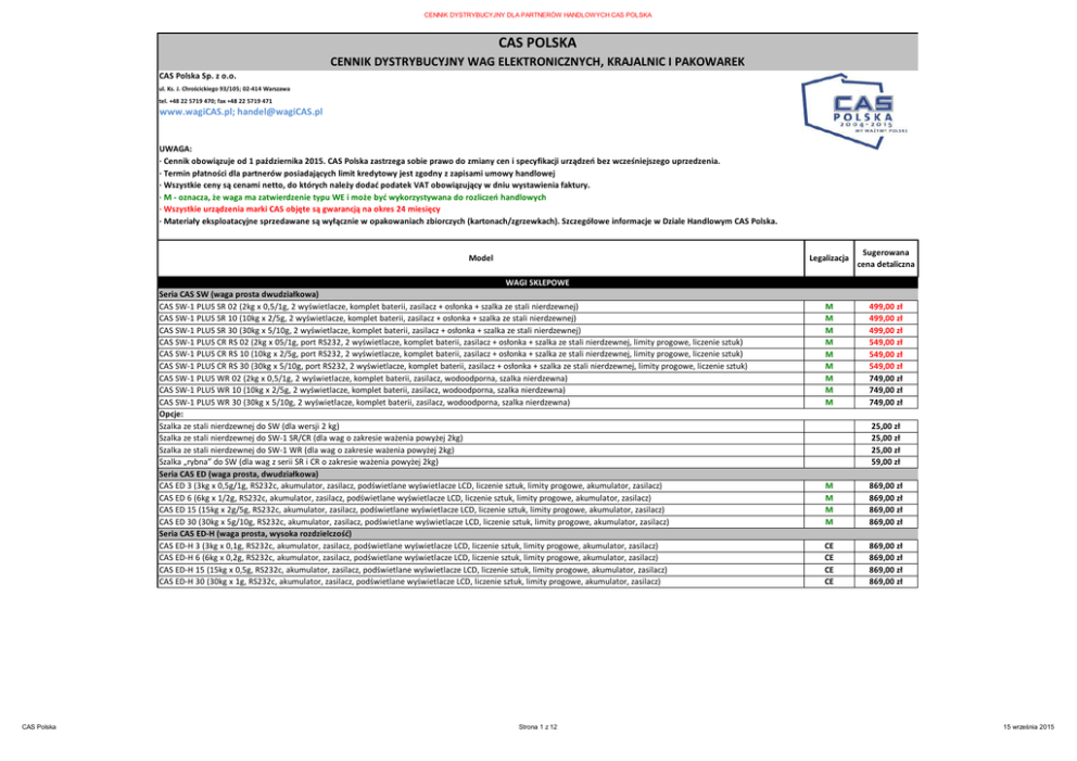 CENNIK DYSTRYBUCYJNY DLA PARTNERÓW HANDLOWYCH CAS POLSKA CAS POLSKA CENNIK DYSTRYBUCYJNY WAG ELEKTRONICZNYCH, KRAJALNIC I PAKOWAREK CAS Polska Sp. z o.o. ul. Ks. J. Chrościckiego 93/105; 02-414 Warszawa tel. +48 22 5719 470; fax +48 22 5719 471 www.wagiCAS.pl; [email protected] UWAGA: · Cennik obowiązuje od 1 października 2015. CAS Polska zastrzega sobie prawo do zmiany cen i specyfikacji urządzeń bez wcześniejszego uprzedzenia. · Termin płatności dla partnerów posiadających limit kredytowy jest zgodny z zapisami umowy handlowej · Wszystkie ceny są cenami netto, do których należy dodać podatek VAT obowiązujący w dniu wystawienia faktury. · M - oznacza, że waga ma zatwierdzenie typu WE i może być wykorzystywana do rozliczeń handlowych · Wszystkie urządzenia marki CAS objęte są gwarancją na okres 24 miesięcy · Materiały eksploatacyjne sprzedawane są wyłącznie w opakowaniach zbiorczych (kartonach/zgrzewkach). Szczegółowe informacje w Dziale Handlowym CAS Polska. Model WAGI SKLEPOWE Seria CAS SW (waga prosta dwudziałkowa) CAS SW-1 PLUS SR 02 (2kg x 0,5/1g, 2 wyświetlacze, komplet baterii, zasilacz + osłonka + szalka ze stali nierdzewnej) CAS SW-1 PLUS SR 10 (10kg x 2/5g, 2 wyświetlacze, komplet baterii, zasilacz + osłonka + szalka ze stali nierdzewnej) CAS SW-1 PLUS SR 30 (30kg x 5/10g, 2 wyświetlacze, komplet baterii, zasilacz + osłonka + szalka ze stali nierdzewnej) CAS SW-1 PLUS CR RS 02 (2kg x 05/1g, port RS232, 2 wyświetlacze, komplet baterii, zasilacz + osłonka + szalka ze stali nierdzewnej, limity progowe, liczenie sztuk) CAS SW-1 PLUS CR RS 10 (10kg x 2/5g, port RS232, 2 wyświetlacze, komplet baterii, zasilacz + osłonka + szalka ze stali nierdzewnej, limity progowe, liczenie sztuk) CAS SW-1 PLUS CR RS 30 (30kg x 5/10g, port RS232, 2 wyświetlacze, komplet baterii, zasilacz + osłonka + szalka ze stali nierdzewnej, limity progowe, liczenie sztuk) CAS SW-1 PLUS WR 02 (2kg x 0,5/1g, 2 wyświetlacze, komplet baterii, zasilacz, wodoodporna, szalka nierdzewna) CAS SW-1 PLUS WR 10 (10kg x 2/5g, 2 wyświetlacze, komplet baterii, zasilacz, wodoodporna, szalka nierdzewna) CAS SW-1 PLUS WR 30 (30kg x 5/10g, 2 wyświetlacze, komplet baterii, zasilacz, wodoodporna, szalka nierdzewna) Opcje: Szalka ze stali nierdzewnej do SW (dla wersji 2 kg) Szalka ze stali nierdzewnej do SW-1 SR/CR (dla wag o zakresie ważenia powyżej 2kg) Szalka ze stali nierdzewnej do SW-1 WR (dla wag o zakresie ważenia powyżej 2kg) Szalka „rybna” do SW (dla wag z serii SR i CR o zakresie ważenia powyżej 2kg) Seria CAS ED (waga prosta, dwudziałkowa) CAS ED 3 (3kg x 0,5g/1g, RS232c, akumulator, zasilacz, podświetlane wyświetlacze LCD, liczenie sztuk, limity progowe, akumulator, zasilacz) CAS ED 6 (6kg x 1/2g, RS232c, akumulator, zasilacz, podświetlane wyświetlacze LCD, liczenie sztuk, limity progowe, akumulator, zasilacz) CAS ED 15 (15kg x 2g/5g, RS232c, akumulator, zasilacz, podświetlane wyświetlacze LCD, liczenie sztuk, limity progowe, akumulator, zasilacz) CAS ED 30 (30kg x 5g/10g, RS232c, akumulator, zasilacz, podświetlane wyświetlacze LCD, liczenie sztuk, limity progowe, akumulator, zasilacz) Seria CAS ED-H (waga prosta, wysoka rozdzielczość) CAS ED-H 3 (3kg x 0,1g, RS232c, akumulator, zasilacz, podświetlane wyświetlacze LCD, liczenie sztuk, limity progowe, akumulator, zasilacz) CAS ED-H 6 (6kg x 0,2g, RS232c, akumulator, zasilacz, podświetlane wyświetlacze LCD, liczenie sztuk, limity progowe, akumulator, zasilacz) CAS ED-H 15 (15kg x 0,5g, RS232c, akumulator, zasilacz, podświetlane wyświetlacze LCD, liczenie sztuk, limity progowe, akumulator, zasilacz) CAS ED-H 30 (30kg x 1g, RS232c, akumulator, zasilacz, podświetlane wyświetlacze LCD, liczenie sztuk, limity progowe, akumulator, zasilacz) CAS Polska Strona 1 z 12 Legalizacja Sugerowana cena detaliczna M M M M M M M M M 499,00 zł 499,00 zł 499,00 zł 549,00 zł 549,00 zł 549,00 zł 749,00 zł 749,00 zł 749,00 zł 25,00 zł 25,00 zł 25,00 zł 59,00 zł M M M M 869,00 zł 869,00 zł 869,00 zł 869,00 zł CE CE CE CE 869,00 zł 869,00 zł 869,00 zł 869,00 zł 15 września 2015 CENNIK DYSTRYBUCYJNY DLA PARTNERÓW HANDLOWYCH CAS POLSKA Model WAGI SKLEPOWE Seria CAS PW-II (waga prosta dwudziałkowa ze stali nierdzewnej) CAS PW-II 02 (2kg x 0,5/1g, 1 wyświetlacz, komplet baterii, szalka i obudowa ze stali nierdzewnej) CAS PW-II 05 (5kg x 1/2g, 1 wyświetlacz, komplet baterii, szalka i obudowa ze stali nierdzewnej) CAS PW-II 10 (10kg x 2/5g, 1 wyświetlacz, komplet baterii, szalka i obudowa ze stali nierdzewnej) Seria CAS AD (waga prosta) CAS AD 15 Seria CAS PR PLUS (waga kalkulacyjna dwudziałkowa) - NOWOŚĆ! CAS PR PLUS 15B (15kg x 2/5g, duże wyświetlacze LED, szalka ze stali nierdzewnej, akumulator) CAS PR PLUS 15P (15kg x 2/5g, duże wyświetlacze LED na słupku, szalka ze stali nierdzewnej, akumulator) Seria CAS ER (waga kalkulacyjna dwudziałkowa) CAS ER JUNIOR 15B (15kg x 2/5g. akumulator, podświetlane wyświetlacze LCD w obudowie) CAS ER JUNIOR 15B RS (15kg x 2/5g. port RS232, akumulator, podświetlane wyświetlacze LCD w obudowie) CAS ER JUNIOR 15PB RS (15kg x 2/5g. Port RS232, akumulator, podświetlane wyświetlacze LCD na słupku) CAS ER PLUS 15C (15 kg x 2/5g, akumulator, RS232c, podświetlane wyświetlacze LCD w obudowie) CAS ER PLUS 30C (30 kg x 5/10g, akumulator, RS232c, podświetlane wyświetlacze LCD w obudowie) CAS ER PLUS 15CP (15 kg x 2/5g, akumulator, RS232c, podświetlane wyświetlacze LCD w obudowie i na słupku) Opcje: Przezroczysta osłonka plastikowa zabezpieczająca obudowę przed zabrudzeniem do ER PLUS/ED/EC Duża szalka ze stali nierdzewnej Seria CAS AP-1 (waga kalkulacyjna dwudziałkowa) CAS AP-1 15 MX (15kg x 2/5g, duże wyświetlacze VFD, szalka ze stali nierdzewnej, RS232) CAS AP-1 15 EX (15kg x 2/5g, duże wyświetlacze VFD, szalka ze stali nierdzewnej, RS232) Seria CAS HS-1 (waga kalkulacyjna wisząca) CAS HS-1 15 (waga wisząca, z klawiaturą numeryczną na 