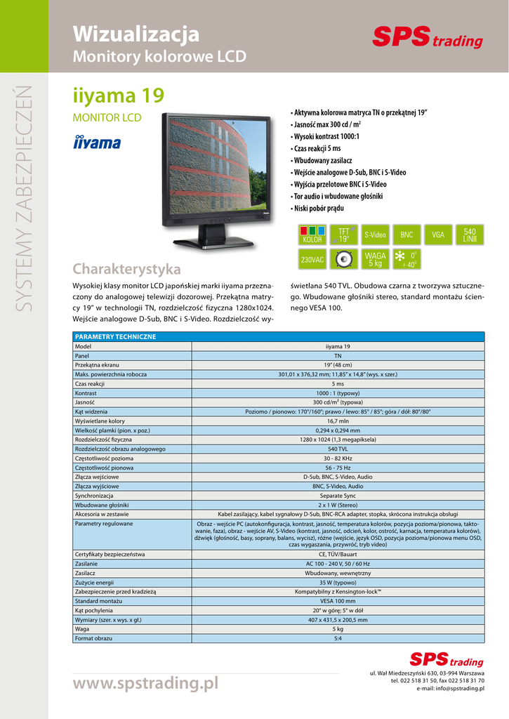 Wizualizacja SYSTEMY ZABEZPIECZEŃ Monitory kolorowe LCD iiyama 19 • Aktywna kolorowa matryca TN o przekątnej 19” • Jasność max 300 cd / m2 • Wysoki kontrast 1000:1 • Czas reakcji 5 ms • Wbudowany zasilacz • Wejście analogowe D-Sub, BNC i S-Video • Wyjścia przelotowe BNC i S-Video • Tor audio i wbudowane głośniki • Niski pobór prądu MONITOR LCD Charakterystyka Wysokiej klasy monitor LCD japońskiej marki iiyama przeznaczony do analogowej telewizji dozorowej. Przekątna matrycy 19” w technologii TN, rozdzielczość fizyczna 1280x1024. Wejście analogowe D-Sub, BNC i S-Video. Rozdzielczość wy- świetlana 540 TVL. Obudowa czarna z tworzywa sztucznego. Wbudowane głośniki stereo, standard montażu ściennego VESA 100. PARAMETRY TECHNICZNE Model iiyama 19 Panel TN Przekątna ekranu 19” (48 cm) Maks. powierzchnia robocza 301,01 x 376,32 mm; 11,85” x 14,8” (wys. x szer.) Czas reakcji 5 ms Kontrast 1000 : 1 (typowy) Jasność 300 cd/m2 (typowa) Kąt widzenia Poziomo / pionowo: 170°/160°; prawo / lewo: 85° / 85°; góra / dół: 80°/80° Wyświetlane kolory 16,7 mln Wielkość plamki (pion. x poz.) 0,294 x 0,294 mm Rozdzielczość fizyczna 1280 x 1024 (1,3 megapiksela) Rozdzielczość obrazu analogowego 540 TVL Częstotliwość pozioma 30 - 82 KHz Częstotliwość pionowa 56 - 75 Hz Złącza wejściowe D-Sub, BNC, S-Video, Audio Złącza wyjściowe BNC, S-Video, Audio Synchronizacja Separate Sync Wbudowane głośniki 2 x 1 W (Stereo) Akcesoria w zestawie Parametry regulowane Kabel zasilający, kabel sygnałowy D-Sub, BNC-RCA adapter, stopka, skrócona instrukcja obsługi Obraz - wejście PC (autokonfiguracja, kontrast, jasność, temperatura kolorów, pozycja pozioma/pionowa, taktowanie, faza), obraz - wejście AV, S-Video (kontrast, jasność, odcień, kolor, ostrość, karnacja, temperatura kolorów), dźwięk (głośność, basy, soprany, balans, wycisz), różne (wejście, język OSD, pozycja pozioma/pionowa menu OSD, czas wygaszania, przywróć, tryb video) Certyfikaty bezpieczeństwa CE, TÜV/Bauart Zasilanie AC 100 - 240 V, 50 / 60 Hz Zasilacz Wbudowany, wewnętrzny Zużycie energii Zabezpieczenie przed kradzieżą Standard montażu Kąt pochylenia Wymiary (szer. x wys. x gł.) 35 W (typowo) Kompatybilny z Kensington-lock™ VESA 100 mm 20° w górę; 5° w dół 407 x 431,5 x 200,5 mm Waga 5 kg Format obrazu 5:4 www.spstrading.pl ul. Wał Miedzeszyński 630, 03-994 Warszawa tel. 022 518 31 50, fax 022 518 31 70 e-mail: [email protected]