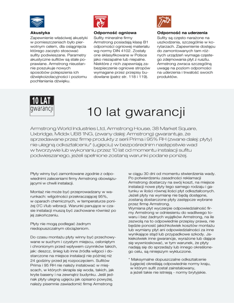 Akustyka Zapewnienie w∏aÊciwej akustyki w pomieszczeniach by∏o pierwotnym celem, dla osiàgni´cia którego zacz´to stosowaç sufity podwieszane. Parametry akustyczne sufitów sà stale poprawiane. Armstrong nieustannie poszukuje nowych sposobów polepszenia ich dêwi´koizolacyjnoÊci i poziomu poch∏aniania dêwi´ku. OdpornoÊç ogniowa Sufity mineralne firmy Armstrong posiadajà klas´ B1 odpornoÊci ogniowej materia∏u wg normy DIN 4102. Zosta∏y one sklasyfikowane w Polsce jako niezapalne lub niepalne. Niektóre z nich zapewniajà zabezpieczenie ogniowe stropów wymagane przez przepisy budowlane (patrz str. 118 i 119). OdpornoÊç na uderzenia Sufity sà cz´sto nara˝one na uszkodzenia, szczególnie w korytarzach. Zapewnienie dost´pu do zamontowanych tam ró˝nych urzàdzeƒ wymaga cz´stego zdejmowania p∏yt z rusztu. Armstrong zwraca szczególnà uwag´ na poziom odpornoÊci na uderzenia i trwa∏oÊç swoich produktów. 10 lat gwarancji Armstrong World Industries Ltd, Armstrong House, 38 Market Square, Uxbridge, Middx UB8 1NG, (zwany dalej: Armstrong) gwarantuje, ˝e sprzedawane przez firm´ produkty z serii Prima i 95% RH (zwane dalej: p∏yty) nie ulegnà odkszta∏ceniu* (ugi´ciu) w bezpoÊrednim nast´pstwie wad w tworzywie lub wykonaniu przez 10 lat od momentu instalacji sufitu podwieszanego, je˝eli spe∏nione zostanà warunki podane poni˝ej. P∏yty winny byç zamontowane zgodnie z odpowiednimi zaleceniami firmy Armstrong obowiàzujàcymi w chwili instalacji. Monta˝ nie mo˝e byç przeprowadzany w warunkach: wilgotnoÊci przekraczajàcej 95%, w oparach chemicznych, w temperaturze poni˝ej 0ºC i/lub wibracji. Warunki panujàce w czasie instalacji muszà byç zachowane równie˝ po jej zakoƒczeniu. P∏yty nie mogà podlegaç ˝adnym niedopuszczalnym obcià˝eniom. Do czasu monta˝u p∏yty winny byç przechowywane w suchym i czystym miejscu, os∏oni´tym i chronionym przed wp∏ywem czynników takich, jak: deszcz, Ênieg lub inne êród∏a wilgoci i dostarczone na miejsce instalacji nie póêniej ni˝ 24 godziny przed jej rozpocz´ciem. Sufitów Prima i 95 RH nie nale˝y instalowaç w miejscach, w których skrapla si´ woda, takich, jak kryte baseny i na zewnàtrz budynku. JeÊli jednak p∏yty ulegnà ugi´ciu jak opisano powy˝ej, nale˝y pisemnie zawiadomiç firm´ Armstrong w ciàgu 30 dni od momentu stwierdzenia wady. Po potwierdzeniu zasadnoÊci reklamacji Armstrong dostarczy na swój koszt, na miejsce instalacji nowe p∏yty tego samego rodzaju i gatunku w iloÊci równej iloÊci p∏yt odkszta∏conych. Je˝eli p∏yty na wymian´ nie b´dà dost´pne, zostanà dostarczone p∏yty zast´pcze wybrane przez firm´ Armstrong. Wymiana p∏yt wyczerpie odpowiedzialnoÊç firmy Armstrong w odniesieniu do wadliwego towaru i bez ˝adnych wyjàtków Armstrong, na ile zezwolà na to odpowiednie przepisy prawa, nie b´dzie ponosiç jakichkolwiek kosztów monta˝u lub wymiany p∏yt ani odpowiedzialnoÊci za inne wynikajàce stàd lub przypadkowe szkody. Jakiekolwiek inne gwarancje, wyra˝one lub dajàce si´ wywnioskowaç, w tym warunek, ˝e p∏yty nadajà si´ do sprzeda˝y lub innego okreÊlonego celu, sà niniejszym wykluczone. * Maksymalne dopuszczalne odkszta∏cenie (ugi´cie) okreÊlajà odpowiednie normy kraju, w którym sufit zosta∏ zainstalowany, a je˝eli takie nie istniejà - normy brytyjskie.