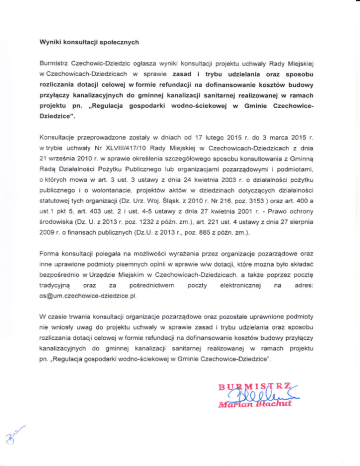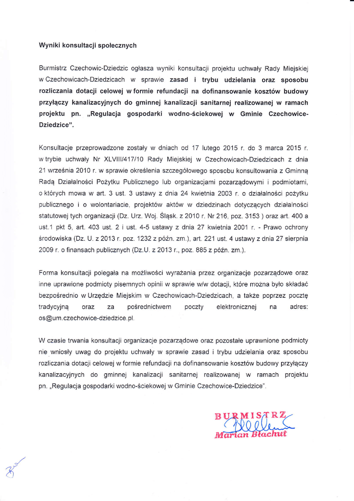 Wyniki konsultacji społecznych Burmistrz Czechowic-Dziedzic ogłasza wyniki konsultacji projektu uchwały Rady Mielskiej w Czechowicach-Dziedzicach w sprawie zasad i trybu udzielania oraz sposobu rozliczania dotacji celowej w formie refundacji na dofinansowanie kosztów budowy przyłączy kanalizacyjnych do gminnej kanalizacji sanitarnej realizowanej W ramach projektu pn, ,,Regulacja gospodarki wodno-ściekowej w Gminie CzechowiceDziedzice". Konsu|tacje przeprowadzone zostały w dniach od 17 lutego 2015 r. do 3 marca 2015 w trybie uchwały Nr XLV|ll/417l10 Rady Miejskiej W czechowicach-Dziedzicach z r. dnia 21 wześnia 2010 r. w sprawie określenia szczegółowego sposobu konsultowania z Gminną Radą DziałalnościPożytku Publicznego lub organizacjami pozarządowymi i podmlotami, o których mowa w ań. 3 ust, 3 ustawy z dnia 24 kwietnia 2003 r. o działalnościpożytku pub|icznego io wolontariacie, projektów aktów w dziedzinach dotyczących działalności statutowej tych organizacji (Dz. Uz. Woj. Ś|ąsk. z2O1O r, Nr 216, poz. 3153 ) oraz ań, 4OO a ust.1 pkt 5, art. 403 ust. 2 i ust, 4-5 ustawy z dnia 27 kwietnia 2001 r. - Prawo ochrony środowiska (Dz.U. z2013f. poz. 1232 z póżn. zm,), ań,221 ust.4 ustawy z dnia 27 sierpnia 2009 r, o finansach publicznych (Dz.U. z2013 l., poz.885 z póżn. zm.). Forma konsu|tacji polegała na mozliwości wyrażania przez oĘanizaąe pozaządowe olaz inne uprawione podmioty pisemnych opinii w sprawie Mw dotacji, które moźna było składać bezpośrednio w Urzędzie Miejskim w Czechowicach-Dziedzicach, a także poprzez pocztę tradycyjną oraz za os@um. czechowice-dziedzice, pośrednictwem poczty elektronicznej na adres: p|, W czasie trwania konsultacji organizacje pozarządowe oraz pozostałe uprawnione podmioty nie , wniosły uwag do projektu uchwały w sprawie zasad i trybu udzielania oraz sposobu rozliczanla dotacji celowej w formie refundacji na dofinansowanie kosztów budowy przyłączy kanalizacy.jnych do gminnej kanalizacji sanitarnej realizowanej w ramach pn. ,,Regulacja gospodarki wodno-ściekowej w Gminie Czechowice-Dziedzice", projektu
