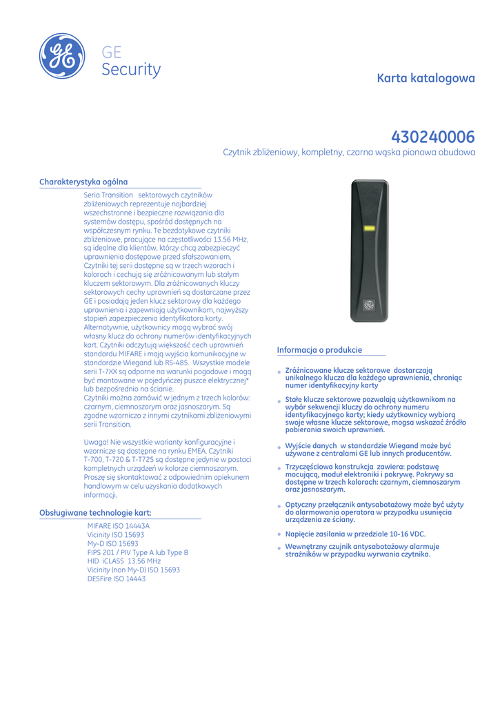 g GE Security Karta katalogowa 430240006 Czytnik zbliżeniowy, kompletny, czarna wąska pionowa obudowa Charakterystyka ogólna Seria Transition sektorowych czytników zbliżeniowych reprezentuje najbardziej wszechstronne i bezpieczne rozwiązania dla systemów dostępu, spośród dostępnych na współczesnym rynku. Te bezdotykowe czytniki zbliżeniowe, pracujące na częstotliwości 13.56 MHz, są idealne dla klientów, którzy chcą zabezpieczyć uprawnienia dostępowe przed sfałszowaniem, Czytniki tej serii dostępne są w trzech wzorach i kolorach i cechują się zróżnicowanym lub stałym kluczem sektorowym. Dla zróżnicowanych kluczy sektorowych cechy uprawnień są dostarczane przez GE i posiadają jeden klucz sektorowy dla każdego uprawnienia i zapewniają użytkownikom, najwyższy stopień zapezpieczenia identyfikatora karty. Alternatywnie, użytkownicy mogą wybrać swój własny klucz do ochrony numerów identyfikacyjnych kart. Czytniki odczytują większość cech uprawnień standardu MIFARE i mają wyjścia komunikacyjne w standardzie Wiegand lub RS-485. Wszystkie modele serii T-7XX są odporne na warunki pogodowe i mogą być montowane w pojedyńczej puszce elektrycznej* lub bezpośrednio na ścianie. Czytniki można zamówić w jednym z trzech kolorów: czarnym, ciemnoszarym oraz jasnoszarym. Są zgodne wzorniczo z innymi czytnikami zbliżeniowymi serii Transition. Uwaga! Nie wszystkie warianty konfiguracyjne i wzornicze są dostępne na rynku EMEA. Czytniki T-700, T-720 & T-T725 są dostępne jedynie w postaci kompletnych urządzeń w kolorze ciemnoszarym. Proszę się skontaktować z odpowiednim opiekunem handlowym w celu uzyskania dodatkowych informacji. Obsługiwane technologie kart: MIFARE ISO 14443A Vicinity ISO 15693 My-D ISO 15693 FIPS 201 / PIV Type A lub Type B HID iCLASS 13.56 MHz Vicinity (non My-D) ISO 15693 DESFire ISO 14443 Informacja o produkcie E Zróżnicowane klucze sektorowe dostarczają unikalnego klucza dla każdego uprawnienia, chroniąc numer identyfikacyjny karty E Stałe klucze sektorowe pozwalają użytkownikom na wybór sekwencji kluczy do ochrony numeru identyfikacyjnego karty; kiedy użytkownicy wybiorą swoje własne klucze sektorowe, mogsa wskazać źródło pobierania swoich uprawnień. E Wyjście danych w standardzie Wiegand może być używane z centralami GE lub innych producentów. E Trzyczęściowa konstrukcja zawiera: podstawę mocującą, moduł elektroniki i pokrywę. Pokrywy sa dostępne w trzech kolorach: czarnym, ciemnoszarym oraz jasnoszarym. E Optyczny przełącznik antysabotażowy może być użyty do alarmowania operatora w przypadku usunięcia urządzenia ze ściany. E Napięcie zasilania w przedziale 10-16 VDC. E Wewnętrzny czujnik antysabotażowy alarmuje strażników w przypadku wyrwania czytnika. 430240006 Czytnik zbliżeniowy, kompletny, czarna wąska pionowa obudowa Specyfikacja Dopasowanie do pracy w każdym środowisku Czarny FCC Part 15 CE UL 294 FIPS 201 (PIV) ETL 294 T-700: 43 x 155 x 28 mm T-720 i T-725: 115 x 155 x 32 mm od -35 do 65°C od 0 do 93%,bez kondensacji przy 32°C RS485 : 4 przewody (min.) Wiegand : 5 przewodów (min.) RS485: 60 m dla 22 AWG, 90 m dla 20 AWG, 152 m dla 18 AWG Wiegand :60 m dla 22 AWG, 152 m dla 18 AWG Kolor Certyfikacje Wymiary (szer.xwys.xgł.) Zakres temperatur pracy Wilgotność względna Podłączenia Zasięg na kablu Zgodność z systemami GE Microkontrolery Direc Door, Micro/5-PX i Micro/5-PXN, Micro/PX-2000 i Micro/PXN-2000 Systemy kontroli dostępu Picture Perfect 1.7 lub nowszy, i microfirmware 1.72 lub nowszy Systemy kontroli dostępu Secure Perfect 5.0 lub nowszy, i microfirmware 5.0.02 lub nowszy Systemy kontroli dostępu FCWnx: każdy Systemy kontroli dostępu obsługujące Wiegand lub OSDP Szczegóły zgodności sa w przewodniku instalacji Mifare (1K/4K) ISO 14443 Uprawnienia Zróżnicowane klucze GE Stałe klucze OESM Mifare (1K/4K) ISO 14443 Zróżnicowane klucze GE My-D (10kBitów) ISO 15693 FIPS 201/PV US Gov (wszystkie) certyfikacje oczekujące i wydane Tylko UID HID iClass (2K) 13.56MHz Tylko UID Vicinity (No My-D) ISO15693 Tylko UID DESFire ISO 1443 Jak zamawiać Kod produktu Opis 430240006 Czytnik zbliżeniowy, kompletny, czarna wąska pionowa obudowa g Dzięki technologii optymalizacji, która pozwala na dopasowanie do szerokiego zakresu środowisk instalacyjnych, czytniki zbliżeniowe Transition nadają się praktycznie do wszystkich zastosowań. Wzornictwo czytników dopasowywuje sie łatwo do instalacji zarówno w środowiskach z zastosowaniem metalu jak i bez. Do czytników dostępne są różnego rodzaju ramki ułatwiające montaż na ścianie lub framudze drzwi, które pozwalają na dostosowanie czytnika do pracy w dowolnych środowiskach i klimacie. Wszechstronne, mocne i długowieczne Czytniki zbliżeniowe serii Transition sa dostępne w wersjach z klawiaturą lub bez, w zwartych obudowach w kolorze czarnym, ciemnoszarym oraz jasnoszarym. Wytrzymały, odporny na prominiowanie UV materiał, jest odporny na odbarwienie wywołane czynnikami środowiskowymi, wewnętrznymi, zewnętrznymi oraz światłem słonecznym. Czytniki posiadają zaawansowaną elektronikę, która jest szczelnie zabezpieczona przed wpływami złej pogody. Wszystkie te zabezpieczenia w połączeniu z dożywotnią gwarancją sprawiają, że każda organizacja może oczekiwać wielu lat, wzorowej i wydajnej pracy czytników Transition . Czytniki zbliżeniowe zawierają zaawansowaną, wydajną elektronikę, która zapewnia duży zasięg odczytu przy współpracy z dowolna technologią. Potrzebują one do zasilania napęcia 10-16 VDC i charakteryzują się niskim poborem prądu. Solidny wygląd i zdumiewająca wszechstronność czytników zbliżeniowych firmy GE sprawiają, że możesz liczyć na wiele lat ich spójnej, wydajnej i niezawodnej pracy. www.gesecurity.pl GE Security zastrzega sobie prawo do zmian specyfikacji produktu bez uprzedzenia. Aktualne specyfikacje produktów mo?na