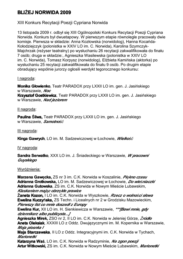 BLIś BLIśEJ NORWIDA 2009 XIII Konkurs Recytacji Poezji Cypriana Norwida 13 listopada 2009 r. odbył się XIII Ogólnopolski Konkurs Recytacji Poezji Cypriana Norwida. Konkurs był dwuetapowy. W pierwszym etapie równolegle pracowały dwie komisje. Pierwsza w składzie: Anna Kozłowska (norwidolog), Hanna KocańdaKołodziejczyk (polonistka w XXIV LO im. C. Norwida), Karolina SzymczykMajchrzak (reŜyser teatralny) po wysłuchaniu 26 recytacji zakwalifikowała do finału 7 osób; druga w składzie:, Agnieszka Wasilewska (polonistka w XXIV LO im. C. Norwida), Tomasz Korpysz (norwidolog), ElŜbieta Kamińska (aktorka) po wysłuchaniu 25 recytacji zakwalifikowała do finału 9 osób. Po drugim etapie obradujący wspólnie jurorzy ogłosili werdykt tegorocznego konkursu: I nagroda: Monika Głowienko, Głowienko Teatr PARADOX przy LXXII LO im. gen. J. Jasińskiego w Warszawie, Noc Krzysztof Gostkiewicz, Gostkiewicz Teatr PARADOX przy LXXII LO im. gen. J. Jasińskiego w Warszawie, Nad jeziorem II nagroda: Paulina Śliwa, Teatr PARADOX przy LXXII LO im. gen. J. Jasińskiego w Warszawie, Samotność III nagroda: Kinga Gawrych, Gawrych LO im. M. Sadzewiczowej w Łochowie, Wielkość IV nagroda: Sandra Serwatko, Serwatko XXX LO im. J. Śniadeckiego w Warszawie, W pracowni Guyskiego WyróŜnienia: Marzena Gawę Gawęcka, ZS nr 3 im. C.K. Norwida w Koszalinie, Piękno czasu Adrianna Grotkowska, LO im. M. Sadzewiczowej w Łochowie, Do wieśniaczki Adrianna Gutowska, Gutowska ZS im. C.K. Norwida w Nowym Mieście Lubawskim, Klaskaniem mając obrzękłe prawice śaneta Kozon, I LO im. C.K. Norwida w Wyszkowie, Rzecz o wolności słowa Ewelina Kuczyń Kuczyńska, ZS Techn. i Licealnych nr 2 w Grodzisku Mazowieckim, Pierwszy list co mnie doszedł z Europy Ewelina Kur, XII LO im. H. Sienkiewicza w Warszawie, ***[Bawi mnie, gdy dziennikarz albo publicysta...] Agnieszka Mirek, ZSO nr 2, II LO im. C.K. Norwida w Jeleniej Górze, Źródło Aneta Oleksiak, Oleksiak XXXIII LO z Oddz. Dwujęzycznymi im. M. Kopernika w Warszawie, Moja piosnka I Maja Starczewska, Starczewska II LO z Oddz. Integracyjnymi im. C.K. Norwida w Tychach, Marionetki Katarzyna Waś Waś, LO im. C.K. Norwida w Radzyminie, Na zgon poezji Artur Witkowski, ZS im. C.K. Norwida w Nowym Mieście Lubawskim, Marionetki
