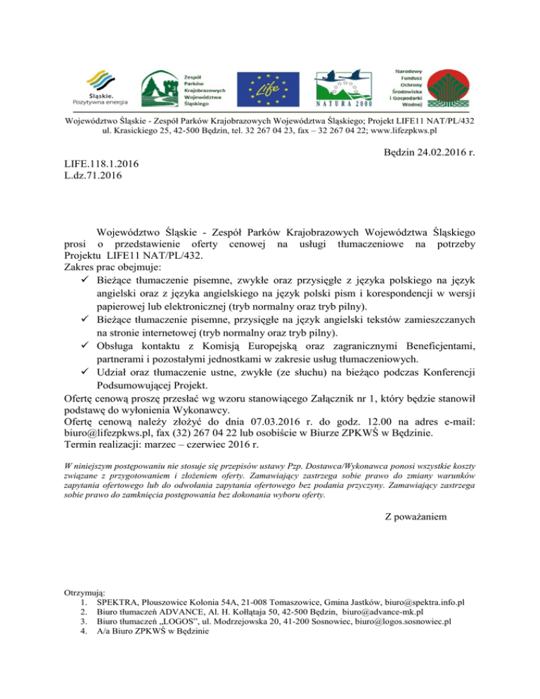 Województwo Śląskie - Zespół Parków Krajobrazowych Województwa Śląskiego; Projekt LIFE11 NAT/PL/432 ul. Krasickiego 25, 42-500 Będzin, tel. 32 267 04 23, fax – 32 267 04 22; www.lifezpkws.pl Będzin 24.02.2016 r. LIFE.118.1.2016 L.dz.71.2016 Województwo Śląskie - Zespół Parków Krajobrazowych Województwa Śląskiego prosi o przedstawienie oferty cenowej na usługi tłumaczeniowe na potrzeby Projektu LIFE11 NAT/PL/432. Zakres prac obejmuje: Bieżące tłumaczenie pisemne, zwykłe oraz przysięgłe z języka polskiego na język angielski oraz z języka angielskiego na język polski pism i korespondencji w wersji papierowej lub elektronicznej (tryb normalny oraz tryb pilny). Bieżące tłumaczenie pisemne, przysięgłe na język angielski tekstów zamieszczanych na stronie internetowej (tryb normalny oraz tryb pilny). Obsługa kontaktu z Komisją Europejską oraz zagranicznymi Beneficjentami, partnerami i pozostałymi jednostkami w zakresie usług tłumaczeniowych. Udział oraz tłumaczenie ustne, zwykłe (ze słuchu) na bieżąco podczas Konferencji Podsumowującej Projekt. Ofertę cenową proszę przesłać wg wzoru stanowiącego Załącznik nr 1, który będzie stanowił podstawę do wyłonienia Wykonawcy. Ofertę cenową należy złożyć do dnia 07.03.2016 r. do godz. 12.00 na adres e-mail: [email protected], fax (32) 267 04 22 lub osobiście w Biurze ZPKWŚ w Będzinie. Termin realizacji: marzec – czerwiec 2016 r. W niniejszym postępowaniu nie stosuje się przepisów ustawy Pzp. Dostawca/Wykonawca ponosi wszystkie koszty związane z przygotowaniem i złożeniem oferty. Zamawiający zastrzega sobie prawo do zmiany warunków zapytania ofertowego lub do odwołania zapytania ofertowego bez podania przyczyny. Zamawiający zastrzega sobie prawo do zamknięcia postępowania bez dokonania wyboru oferty. Z poważaniem Otrzymują: 1. SPEKTRA, Płouszowice Kolonia 54A, 21-008 Tomaszowice, Gmina Jastków, [email protected] 2. Biuro tłumaczeń ADVANCE, Al. H. Kołłątaja 50, 42-500 Będzin, [email protected] 3. Biuro tłumaczeń „LOGOS”, ul. Modrzejowska 20, 41-200 Sosnowiec, [email protected] 4. A/a Biuro ZPKWŚ w Będzinie