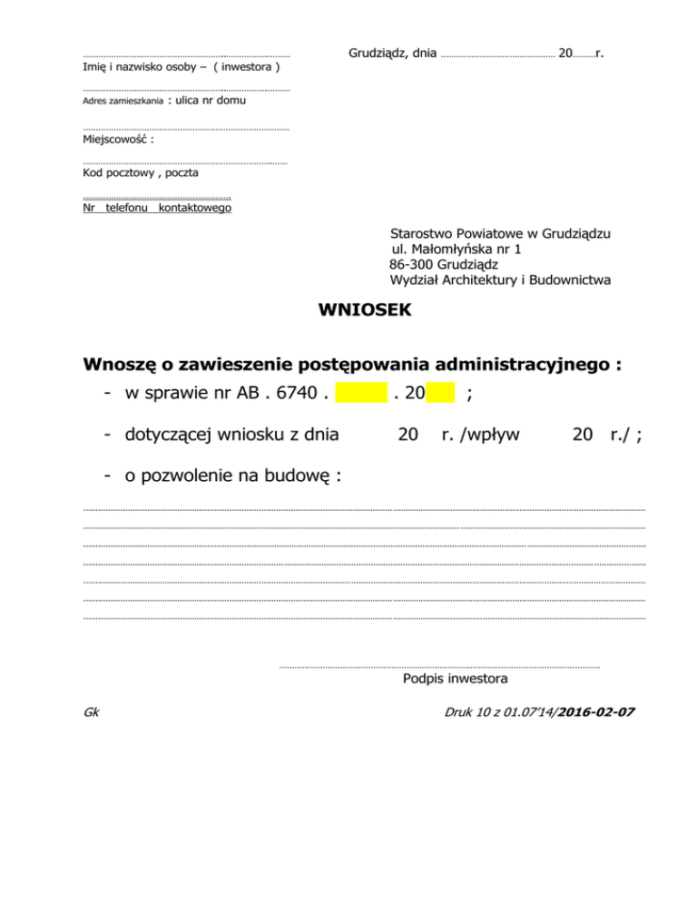 Grudziądz, dnia ………………………………………………..…………….……… Imię i nazwisko osoby – ( inwestora ) ……………………………………… 20………r. ………………………………………………..…………….……… Adres zamieszkania : ulica nr domu ……………………………………………………………………… Miejscowość : ………………………………………………………………..…… Kod pocztowy , poczta …………………………………………………. Nr telefonu kontaktowego Starostwo Powiatowe w Grudziądzu ul. Małomłyńska nr 1 86-300 Grudziądz Wydział Architektury i Budownictwa WNIOSEK Wnoszę o zawieszenie postępowania administracyjnego : - w sprawie nr AB . 6740 . . 20 - dotyczącej wniosku z dnia 20 ; r. /wpływ 20 r./ ; - o pozwolenie na budowę : ............................................................................................................................. ...................................................................................................... ........................................................................................................................................................ ........................................................................... ................................................................................................................................................................................... ................................................ .............................................................................................................................................................................................................. ..................... ................................................................................................................................................................................................................................... ............................................................................................................................. ...................................................................................................... ............................................................................................................................. ...................................................................................................... ……………………………………………………………………………………………………………… Podpis inwestora Gk Druk 10 z 01.07’14/2016-02-07