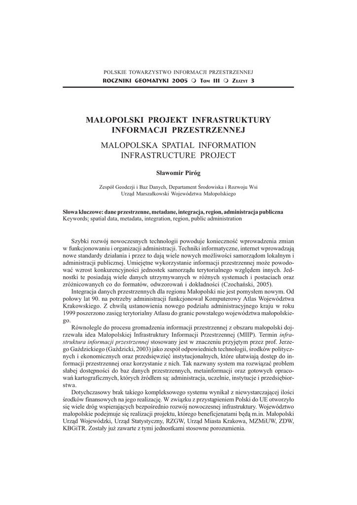 POLSKIE TOWARZYSTWO INFORMACJI PRZESTRZENNEJ Ma³opolski projekt infrastruktury informacji przestrzennej ROCZNIKI GEOMATYKI 2005 m TOM III m Z ESZYT 3 183 MA£OPOLSKI PROJEKT INFRASTRUKTURY INFORMACJI PRZESTRZENNEJ MALOPOLSKA SPATIAL INFORMATION INFRASTRUCTURE PROJECT S³awomir Piróg Zespó³ Geodezji i Baz Danych, Departament rodowiska i Rozwoju Wsi Urz¹d Marsza³kowski Województwa Ma³opolskiego S³owa kluczowe: dane przestrzenne, metadane, integracja, region, administracja publiczna Keywords: spatial data, metadata, integration, region, public administration Szybki rozwój nowoczesnych technologii powoduje koniecznoæ wprowadzenia zmian w funkcjonowaniu i organizacji administracji. Techniki informatyczne, internet wprowadzaj¹ nowe standardy dzia³ania i przez to daj¹ wiele nowych mo¿liwoci samorz¹dom lokalnym i administracji publicznej. Umiejêtne wykorzystanie informacji przestrzennej mo¿e powodowaæ wzrost konkurencyjnoci jednostek samorz¹du terytorialnego wzglêdem innych. Jednostki te posiadaj¹ wiele danych utrzymywanych w ró¿nych systemach i postaciach oraz zró¿nicowanych co do formatów, odwzorowañ i dok³adnoci (Czochañski, 2005). Integracja danych przestrzennych dla regionu Ma³opolski nie jest pomys³em nowym. Od po³owy lat 90. na potrzeby administracji funkcjonowa³ Komputerowy Atlas Województwa Krakowskiego. Z chwil¹ ustanowienia nowego podzia³u administracyjnego kraju w roku 1999 poszerzono zasiêg terytorialny Atlasu do granic powsta³ego województwa ma³opolskiego. Równolegle do procesu gromadzenia informacji przestrzennej z obszaru ma³opolski dojrzewa³a idea Ma³opolskiej Infrastruktury Informacji Przestrzennej (MIIP). Termin infrastruktura informacji przestrzennej stosowany jest w znaczeniu przyjêtym przez prof. Jerzego Gadzickiego (Gadzicki, 2003) jako zespó³ odpowiednich technologii, rodków politycznych i ekonomicznych oraz przedsiêwziêæ instytucjonalnych, które u³atwiaj¹ dostêp do informacji przestrzennej oraz korzystanie z nich. Tak nazwany system ma rozwi¹zaæ problem s³abej dostêpnoci do baz danych przestrzennych, metainformacji oraz gotowych opracowañ kartograficznych, których ród³em s¹: administracja, uczelnie, instytucje i przedsiêbiorstwa. Dotychczasowy brak takiego kompleksowego systemu wynika³ z niewystarczaj¹cej iloci rodków finansowych na jego realizacjê. W zwi¹zku z przyst¹pieniem Polski do UE otworzy³o siê wiele dróg wspieraj¹cych bezporednio rozwój nowoczesnej infrastruktury. Województwo ma³opolskie podejmuje siê realizacji projektu, którego beneficjenatami bêd¹ m.in. Ma³opolski Urz¹d Wojewódzki, Urz¹d Statystyczny, RZGW, Urz¹d Miasta Krakowa, MZMiUW, ZDW, KBGiTR. Zosta³y ju¿ zawarte z tymi jednostkami stosowne porozumienia. 184 S³awomir Piróg Powy¿szy projekt zak³ada otwartoæ systemu, tzn. ¿e mog¹ do niego przystêpowaæ kolejni beneficjencji. Wszyscy w równym stopniu bêd¹ mieli bezp³atny dostêp do GISowych danych przestrzennych oraz metainformacji na temat baz dotycz¹cych obszaru Ma³opolski zgromadzonych na centralnym serwerze (rys. 1). Wszelkiego rodzaju gotowe opracowania kartograficzne bêd¹ gromadzone w standardzie pdf i udostêpniane pozosta³ym beneficjentom. Poprzez zaawansowane wyszukiwania w systemie mo¿liwe bêdzie szybkie odnalezienie najlepszych danych potrzebnych w zarz¹dzaniu regionem i jego dalszym rozwoju. Projekt Ma³opolskiej Infrastruktury Informacji Przestrzennej to przede wszystkim system gromadz¹cy metainformacje na temat wszelkiego rodzaju baz danych przestrzennych dla obszaru województwa ma³opolskiego. O szerokim spektrum zadañ o charakterze przestrzennym jednostek przystêpuj¹cych do wspó³pracy z Urzêdem Marsza³kowskim wiadczy poni¿szy wykaz poszczególnych instytucji, które dysponuj¹ danymi przestrzennymi na temat: m Ma³opolski Zarz¹d Melioracji i Urz¹dzeñ Wodnych w Krakowie rzek ma³opolski zbiorników wodnych i jezior obiektów hydrotechnicznych i gospodarki wodnej planowanych i realizowanych inwestycji hydrologicznych m Krakowskie Biuro Geodezji i Terenów Rolnych w Krakowie warunków glebowo-rolniczych w Ma³opolsce lokalizacji inwestycji na terenach rolnych struktury agrarnej w Ma³opolsce m Zarz¹d Dróg Wojewódzkich w Krakowie przebiegu i charakterystyki dróg wojewódzkich Ma³opolski oznakowania dróg wojewódzkich obiektów in¿ynierskich (mosty, wiadukty, estakady) planowanych i realizowanych inwestycji drogowych m Wydzia³ Zarz¹dzania Kryzysowego Ma³opolskiego Urzêdu Wojewódzkiego zagro¿eñ naturalnych w regionie (powodzie, osuwiska) rozmieszczenia magazynów chemicznych lokalizacji placówek pomocy medycznej i punktów ratunkowych socjoekonomicznych spisów ludnoci budynków i u¿ytków rolnych rozmieszczenia magazynów ¿ywnoci m Wydzia³ rodowiska i Rolnictwa Ma³opolskiego Urzêdu Wojewódzkiego obszarów wiejskich (grunty, tereny rolnicze) punktów geodezyjnych aktualizacji informacji o gruntach rolnych przydatnoci i odpowiednioci gruntów sieci cieków i zbiorników wodnych oraz obiektów hydrologicznych lokalizacji wód powierzchniowych i gruntowych zabudowy obszarów wiejskich specjalistycznych upraw i produkcji rolnej w regionie rozmieszczenia róde³ geotermicznych lokalizacji obszarów zanieczyszczeñ Ma³opolski projekt infrastruktury informacji przestrzennej 185 Regionalny Zarz¹d Gospodarki Wodnej g³ównych rzek Ma³opolski sztucznych zbiorników wodnych i du¿ych jezior obiektów hydrotechnicznych planowanych inwestycji hydrologicznych m Urz¹d Statystyczny w Krakowie podstawowych wskaników statystycznych o województwie w uk³adzie powiatów i gmin informacji statystycznych o województwach w Polsce (Ma³opolska na tle kraju) informacji o podziale administracyjnym m Urz¹d Miasta Krakowa lokalizacji obiektów ró¿nej kategorii na terenie gminy Kraków infrastruktury technicznej na terenie gminy Kraków podzia³u administracyjnego na dzielnice miasta, odnotowywanie zmian planowanych i reali