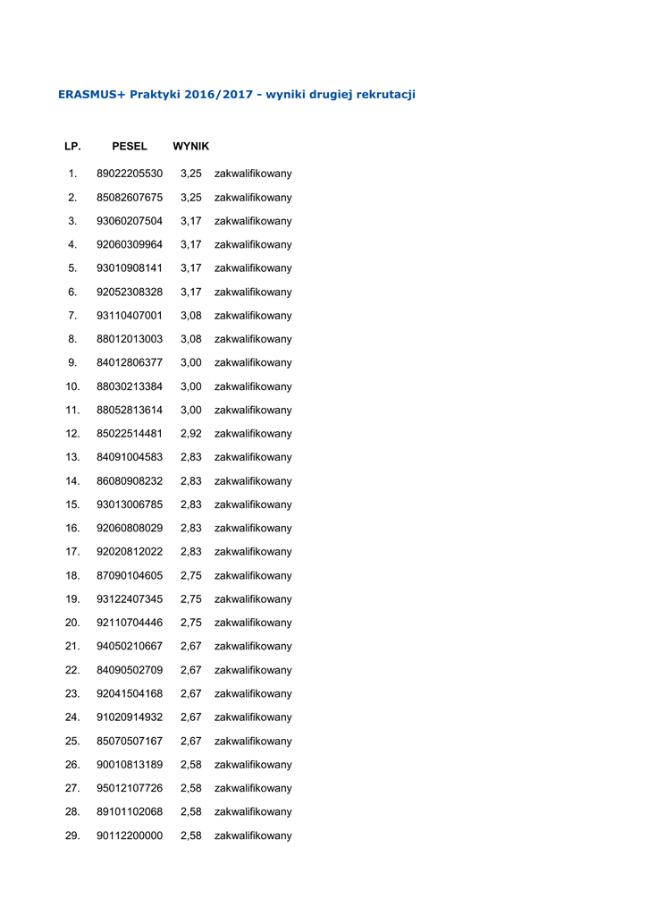 ERASMUS+ Praktyki 2016/2017 - wyniki drugiej rekrutacji LP. PESEL WYNIK 1. 89022205530 3,25 zakwalifikowany 2. 85082607675 3,25 zakwalifikowany 3. 93060207504 3,17 zakwalifikowany 4. 92060309964 3,17 zakwalifikowany 5. 93010908141 3,17 zakwalifikowany 6. 92052308328 3,17 zakwalifikowany 7. 93110407001 3,08 zakwalifikowany 8. 88012013003 3,08 zakwalifikowany 9. 84012806377 3,00 zakwalifikowany 10. 88030213384 3,00 zakwalifikowany 11. 88052813614 3,00 zakwalifikowany 12. 85022514481 2,92 zakwalifikowany 13. 84091004583 2,83 zakwalifikowany 14. 86080908232 2,83 zakwalifikowany 15. 93013006785 2,83 zakwalifikowany 16. 92060808029 2,83 zakwalifikowany 17. 92020812022 2,83 zakwalifikowany 18. 87090104605 2,75 zakwalifikowany 19. 93122407345 2,75 zakwalifikowany 20. 92110704446 2,75 zakwalifikowany 21. 94050210667 2,67 zakwalifikowany 22. 84090502709 2,67 zakwalifikowany 23. 92041504168 2,67 zakwalifikowany 24. 91020914932 2,67 zakwalifikowany 25. 85070507167 2,67 zakwalifikowany 26. 90010813189 2,58 zakwalifikowany 27. 95012107726 2,58 zakwalifikowany 28. 89101102068 2,58 zakwalifikowany 29. 90112200000 2,58 zakwalifikowany 30. 91080801546 2,58 zakwalifikowany 31. 93032316409 2,50 zakwalifikowany 32. 91020412386 2,50 zakwalifikowany 33. 91010416167 2,50 zakwalifikowany 34. 91011403863 2,42 zakwalifikowany 35. 93051308265 2,42 zakwalifikowany 36. 91092317297 2,42 zakwalifikowany 37. 91101606022 2,33 zakwalifikowany 38. 91081111181 2,33 zakwalifikowany 39. 88081101942 2,33 zakwalifikowany 40. 93043012169 2,33 zakwalifikowany 41. 94032913207 2,33 zakwalifikowany 42. 92052404567 2,25 zakwalifikowany 43. 93052709003 2,25 zakwalifikowany 44. 95072209608 2,25 zakwalifikowany 45. 93032507982 2,25 zakwalifikowany 46. 92061609643 2,25 zakwalifikowany 47. 91042514866 2,25 zakwalifikowany 48. 94092013484 2,25 zakwalifikowany 49. 94020214569 2,25 zakwalifikowany 50. 91080212128 2,25 zakwalifikowany 51. 92062803749 2,25 zakwalifikowany 52. 92071110124 2,25 zakwalifikowany 53. 94061312185 2,25 zakwalifikowany 54. 92111309220 2,25 zakwalifikowany 55. 92060507553 2,25 zakwalifikowany 56. 91021708587 2,25 zakwalifikowany warunkowo 57. 92060810901 2,25 zakwalifikowany 58. 92062807637 2,17 zakwalifikowany 59. 91050508754 2,17 zakwalifikowany 60. 89050803566 2,17 zakwalifikowany 61. 90061916183 2,17 zakwalifikowany 62. 90091309092 2,17 zakwalifikowany 63. 93062207069 2,17 zakwalifikowany 64. 93111309005 2,17 zakwalifikowany 65. 92081014924 2,17 zakwalifikowany 66. 92101307678 2,08 zakwalifikowany 67. 92080407527 2,08 zakwalifikowany 68. 91040816991 2,08 zakwalifikowany 69. 95042113483 2,00 zakwalifikowany 70. 93052704169 2,00 zakwalifikowany 71. 92060405028 2,00 zakwalifikowany 72. 91112406929 2,00 zakwalifikowany 73. 93070210426 2,00 zakwalifikowany 74. 91101000505 2,00 zakwalifikowany 75. 90010814869 2,00 zakwalifikowany 76. 93041505685 2,00 zakwalifikowany 77. 93030507281 2,00 zakwalifikowany 78. 90092402220 2,00 zakwalifikowany 79. 94032701406 2,00 zakwalifikowany 80. 62050511740 2,00 zakwalifikowany 81. 92011110388 1,83 niezakwalifikowany 82. 93121608822 1,83 niezakwalifikowany 83. 93030601824 1,75 niezakwalifikowany 84. 92030309282 1,67 niezakwalifikowany 85. 95090411700 1,58 niezakwalifikowany 86. 92122905709 1,50 niezakwalifikowany 87. 90031303229 1,00 niezakwalifikowany 88. 94101604748 0,00 niezakwalifikowany - brak aplikacji on-line, brak wymaganych podpisów 89. 92121702727 0,00 niezakwalifikowany - brak kwestionariusza kandydata 90. 91053010560 0,00 niezakwalifikowany - brak kwestionariusza kandydata 91. 93091210854 0,00 niezakwalifikowany - brak kwestionariusza kandydata 92. 92011505760 0,00 niezakwalifikowany - brak kwestionariusza kandydata 93. 93110110617 0,00 niezakwalifikowany - brak kwestionariusza kandydata 94. 93042013865 0,00 niezakwalifikowany - brak kwestionariusza kandydata 95. 93050811014 0,00 niezakwalifikowany - brak kwestionariusza kandydata 96. 93022711982 0,00 niezakwalifikowany - brak kwestionariusza kandydata 97. 95081411449 0,00 niezakwalifikowany - brak kwestionariusza kandydata 98. 92091704372 0,00 niezakwalifikowany - brak wymaganych podpisów 99. 92061211206 0,00 niezakwalifikowany - brak wymaganych podpisów 100. 94062811508 0,00 niezakwalifikowany - brak wymaganych podpisów
