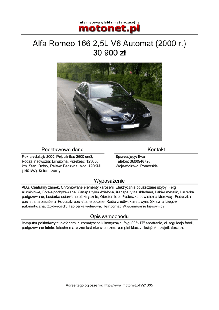 Alfa Romeo 166 2,5L V6 Automat (2000 r.) 30 900 zł