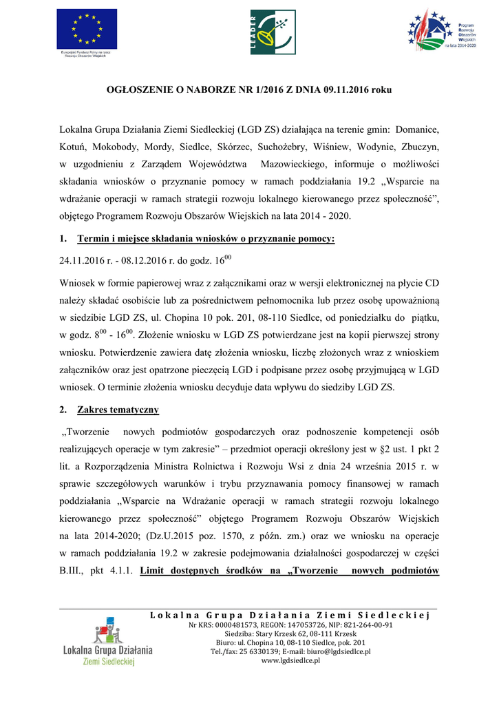 OGŁOSZENIE O NABORZE NR 1/2016 Z DNIA 09.11.2016 roku Lokalna Grupa Działania Ziemi Siedleckiej (LGD ZS) działająca na terenie gmin: Domanice, Kotuń, Mokobody, Mordy, Siedlce, Skórzec, Suchożebry, Wiśniew, Wodynie, Zbuczyn, w uzgodnieniu z Zarządem Województwa Mazowieckiego, informuje o możliwości składania wniosków o przyznanie pomocy w ramach poddziałania 19.2 „Wsparcie na wdrażanie operacji w ramach strategii rozwoju lokalnego kierowanego przez społeczność”, objętego Programem Rozwoju Obszarów Wiejskich na lata 2014 - 2020. 1. Termin i miejsce składania wniosków o przyznanie pomocy: 24.11.2016 r. - 08.12.2016 r. do godz. 1600 Wniosek w formie papierowej wraz z załącznikami oraz w wersji elektronicznej na płycie CD należy składać osobiście lub za pośrednictwem pełnomocnika lub przez osobę upoważnioną w siedzibie LGD ZS, ul. Chopina 10 pok. 201, 08-110 Siedlce, od poniedziałku do piątku, w godz. 800 - 1600. Złożenie wniosku w LGD ZS potwierdzane jest na kopii pierwszej strony wniosku. Potwierdzenie zawiera datę złożenia wniosku, liczbę złożonych wraz z wnioskiem załączników oraz jest opatrzone pieczęcią LGD i podpisane przez osobę przyjmującą w LGD wniosek. O terminie złożenia wniosku decyduje data wpływu do siedziby LGD ZS. 2. Zakres tematyczny „Tworzenie nowych podmiotów gospodarczych oraz podnoszenie kompetencji osób realizujących operacje w tym zakresie” – przedmiot operacji określony jest w §2 ust. 1 pkt 2 lit. a Rozporządzenia Ministra Rolnictwa i Rozwoju Wsi z dnia 24 września 2015 r. w sprawie szczegółowych warunków i trybu przyznawania pomocy finansowej w ramach poddziałania „Wsparcie na Wdrażanie operacji w ramach strategii rozwoju lokalnego kierowanego przez społeczność” objętego Programem Rozwoju Obszarów Wiejskich na lata 2014-2020; (Dz.U.2015 poz. 1570, z późn. zm.) oraz we wniosku na operacje w ramach poddziałania 19.2 w zakresie podejmowania działalności gospodarczej w części B.III., pkt 4.1.1. Limit dostępnych środków na „Tworzenie nowych podmiotów __________________________________________________________________________________ Lokalna Grupa Działania Ziemi Siedleckiej Nr KRS: 0000481573, REGON: 147053726, NIP: 821-264-00-91 Siedziba: Stary Krzesk 62, 08-111 Krzesk Biuro: ul. Chopina 10, 08-110 Siedlce, pok. 201 Tel./fax: 25 6330139; E-mail: [email protected] www.lgdsiedlce.pl gospodarczych oraz podnoszenie kompetencji osób realizujących operacje w tym zakresie” wynosi 420 000 zł. 3. Formy wsparcia: a. Premia wypłacana w formie ryczałtowej b. Wysokość premii dla osób podejmujących działalność gospodarczą wynosi 60 000 zł. 4. Warunki udzielenia wsparcia Aby wniosek mógł zostać wybrany przez LGD do finansowania, musi spełnić warunki określone w Rozporządzeniu Ministra Rolnictwa i Rozwoju Wsi z dnia 24 września 2015 r. w sprawie szczegółowych warunków i trybu przyznawania pomocy finansowej w ramach poddziałania „Wsparcie na Wdrażanie operacji w ramach strategii rozwoju lokalnego kierowanego przez społeczność” objętego Programem Rozwoju Obszarów Wiejskich na lata 2014-2020 (Dz.U.2015 poz. 1570, z późn. zm.), a ponadto: spełnić warunki oceny wstępnej, zostać uznany za zgodny z LSR, w tym zgodny z warunkami przyznania pomocy określonymi w Programie Rozwoju Obszarów Wiejskich na lata 2014-2020, a ponadto operacja musi osiągnąć minimalny próg punktowy, o którym mowa w pkt 5. W przypadku dużej ilości wniosków spełniających warunki wsparcia, mieszczących się w limicie ogłoszonego naboru, o możliwości uzyskania dofinansowania decyduje większa liczba punktów uzyskanych w ramach poszczególnych kryteriów. Jeżeli metoda selekcji opisana powyżej okaże się nieskuteczna o miejscu na liście operacji wybranych decyduje data i godzina złożenia wniosku w Biurze LGD ZS zgodnie z zasadą, im wcześniejsza data, godzina, minuta złożenia wniosku, tym wyższe miejsce na liście. 4.1 Informacja o wymaganych dokumentach potwierdzających spełnienie warunków udzielenia wsparcia Dokumenty potwierdzające spełnienie warunków udzielania wsparcia stanowią: wniosek o przyznanie pomocy wraz z załącznikami. __________________________________________________________________________________ Lokalna Grupa Działania Ziemi Siedleckiej Nr KRS: 0000481573, REGON: 147053726, NIP: 821-264-00-91 Siedziba: Stary Krzesk 62, 08-111 Krzesk Biuro: ul. Chopina 10, 08-110 Siedlce, pok. 201 Tel./fax: 25 6330139; E-mail: [email protected] www.lgdsiedlce.pl 5.Kryteria wyboru i oceny operacji Ocena wniosków jest dwuetapowa. W I etapie dokonywana jest wstępna ocena wniosków w zakresie: złożenia wniosku w miejscu i w terminie wskazanym w ogłoszeniu o naborze, zgodności operacji z zakresem tematycznym, który został wskazany w ogłoszeniu o naborze, zgodności operacji z formą wsparcia wskazaną w ogłoszeniu o naborze, spełnienia dodatkowych warunków udzielenia wsparcia obowiązujących w ramach naboru. Operacje, które nie spełniają w/w warunków nie podlegają ocenie zgodności z LSR ZS, stanowiącej II etap oceny wniosków. Przez operację zgodną z LSR rozumie się operację, która zakłada realizację celów głównych i szczegółowych LSR, przez osiąganie zaplanowanych w LSR wskaźników oraz jest zgodna z PROW 2014-2020, w ramach, którego jest planowana realizacja tej operacji. Wnioski uznane za niezgodne z LSR są odrzucane. Wnioski uznane za zgodne z LSR ZS przechodzą do oceny punktowej zgodnie z lokalnymi kryteriami wyboru. Minimalne wymagania, aby wniosek został wybrany do finansowania jest uzyskanie minimum 25 punktów w ramach oceny zgodności operacji z lokalnymi kryteriami wyboru dla operacji, które odpowiadają warunkom przyznania pomocy w ramach działania „Tworzenie nowych podmiotów gospodarczych oraz podnoszenie kompetencji osób realizujących operacje w tym zakresie”. Kryteria wyboru operacji LGD ZS w 