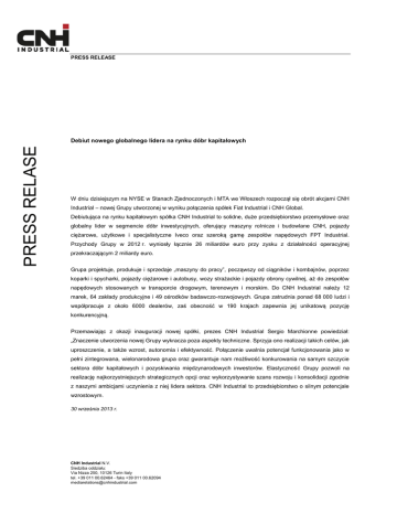 PRESS RELEASE PRESS RELASE Debiut nowego globalnego lidera na rynku dóbr kapitałowych W dniu dzisiejszym na NYSE w Stanach Zjednoczonych i MTA we Włoszech rozpoczął się obrót akcjami CNH Industrial – nowej Grupy utworzonej w wyniku połączenia spółek Fiat Industrial i CNH Global. Debiutująca na rynku kapitałowym spółka CNH Industrial to solidne, duże przedsiębiorstwo przemysłowe oraz globalny lider w segmencie dóbr inwestycyjnych, oferujący maszyny rolnicze i budowlane CNH, pojazdy ciężarowe, użytkowe i specjalistyczne Iveco oraz szeroką gamę zespołów napędowych FPT Industrial. Przychody Grupy w 2012 r. wyniosły łącznie 26 miliardów euro przy zysku z działalności operacyjnej przekraczającym 2 miliardy euro. Grupa projektuje, produkuje i sprzedaje „maszyny do pracy”, począwszy od ciągników i kombajnów, poprzez koparki i spycharki, pojazdy ciężarowe i autobusy, wozy strażackie i pojazdy obrony cywilnej, aż do zespołów napędowych stosowanych w transporcie drogowym, terenowym i morskim. Do CNH Industrial należy 12 marek, 64 zakłady produkcyjne i 49 ośrodków badawczo-rozwojowych. Grupa zatrudnia ponad 68 000 ludzi i współpracuje z około 6000 dealerów, zaś obecność w 190 krajach zapewnia jej unikatową pozycję konkurencyjną. Przemawiając z okazji inauguracji nowej spółki, prezes CNH Industrial Sergio Marchionne powiedział: „Znaczenie utworzenia nowej Grupy wykracza poza aspekty techniczne. Sprzyja ono realizacji takich celów, jak uproszczenie, a także wzrost, autonomia i efektywność. Połączenie uwalnia potencjał funkcjonowania jako w pełni zintegrowana, wielonarodowa grupa oraz gwarantuje nam możliwość konkurowania na samym szczycie sektora dóbr kapitałowych i pozyskiwania międzynarodowych inwestorów. Elastyczność Grupy pozwoli na realizację najkorzystniejszych strategicznych opcji oraz wykorzystywanie szans rozwoju i konsolidacji zgodnie z naszymi ambicjami uczynienia z niej lidera sektora. CNH Industrial to przedsiębiorstwo o silnym potencjale wzrostowym. 30 września 2013 r. CNH Industrial N.V. Siedziba oddziału: Via Nizza 250, 10126 Turin Italy tel. +39 011 00.62464 - faks +39 011 00.62094 [email protected] CNH Industrial CNH Industrial jest globalnym liderem w sektorze dóbr kapitałowych, z ugruntowanym doświadczeniem branżowym, szeroką ofertą produktów i przedstawicielstwami na całym świecie. Każda z marek należących do Grupy cieszy się międzynarodową renomą w poszczególnych sektorach: Case IH, New Holland Agriculture i Steyr – ciągniki i maszyny rolnicze; Case i New Holland – maszyny do robót ziemnych; Iveco – pojazdy użytkowe; Iveco Bus i Helieuz Bus – autobusy i autokary; Iveco Astra – pojazdy przeznaczone do eksploatacji w kamieniołomach i na placach budowy; Magirus – pojazdy pożarnicze; Iveco Defence Vehicles – pojazdy dla wojska i służb obrony cywilnej oraz FPT Industrial – silniki i układy przeniesienia napędu. Więcej informacji znajduje się na stronach korporacyjnych Grupy: www.cnhindustrial.com