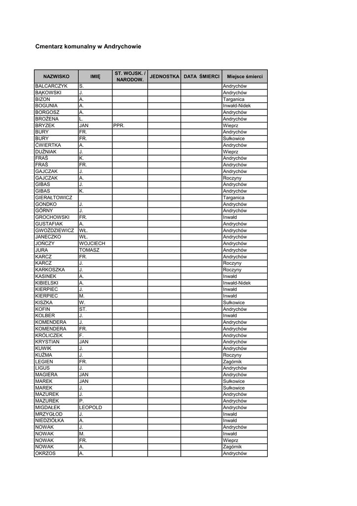Cmentarz komunalny w Andrychowie NAZWISKO BALCARCZYK BĄKOWSKI BIZON BOGUNIA BORGOSZ BROśENA BRYZEK BURY BURY ĆWIERTKA DUśNIAK FRAŚ FRAŚ GAJCZAK GAJCZAK GIBAS GIBAS GIERAŁTOWICZ GONDKO GÓRNY GROCHOWSKI GUSTAFIAK GWOŹDZIEWICZ JANECZKO JOŃCZY JURA KARCZ KARCZ KARKOSZKA KASINEK KIBIELSKI KIERPIEC KIERPIEC KISZKA KOFIN KOLBER KOMENDERA KOMENDERA KRÓLICZEK KRYSTIAN KUWIK KUŹMA LEGIEN LIGUS MAGIERA MAREK MAREK MAZUREK MAZUREK MIGDAŁEK MRZYGŁOD NIEDZIÓŁKA NOWAK NOWAK NOWAK NOWAK OKRZOS IMIĘ S. J. A. A. A. L. JAN FR. FR. A. J. K. FR. J. A. J. K. J. J. FR. A. WŁ. WŁ. WOJCIECH TOMASZ FR. J. J. A. A. J. M. W. ST. J. J. FR. F. JAN J. J. FR. J. JAN JAN J. J. P. LEOPOLD J. A. J. M. FR. A. A. ST. WOJSK. / JEDNOSTKA DATA ŚMIERCI NARODOW. PPR. Miejsce śmierci Andrychów Andrychów Targanica Inwałd-Nidek Andrychów Andrychów Wieprz Andrychów Sułkowice Andrychów Wieprz Andrychów Andrychów Andrychów Roczyny Andrychów Andrychów Targanica Andrychów Andrychów Inwałd Andrychów Andrychów Andrychów Andrychów Andrychów Andrychów Roczyny Roczyny Inwałd Inwałd-Nidek Inwałd Inwałd Sułkowice Andrychów Inwałd Andrychów Andrychów Andrychów Andrychów Andrychów Roczyny Zagórnik Andrychów Andrychów Sułkowice Sułkowice Andrychów Andrychów Andrychów Inwałd Inwałd Andrychów Inwałd Wieprz Zagórnik Andrychów NAZWISKO OKRZOS OSSOWSKI OSSOWSKI PABIŚ PAJAK PAŹDZIORA PŁONKA POLAK PRUS ROKOWSKI ROKOWSKI RUSINEK RYCHTER SMAZA SMOLEC SOBECKI STUGLIK SURMA SWAKOŃ SWAKOŃ SZLAGOR SZYMAŃSKI TALAR TYRLAK WACIĘGA WALUSIAK WALUSIAK WIERCIMAK WRÓBEL ZIELIŃSKI śYDEK śYWIOŁ IMIĘ A. W. A. FR. K. I. W. JAN J. W. J. M. FR. FR. WŁ. F. J. J. J. JAN M. J. A. W. J. J. WŁ. J. J. JAN M. JAN ST. WOJSK. / JEDNOSTKA DATA ŚMIERCI NARODOW. PODPR. Miejsce śmierci Targanica Sułkowice Sułkowice Andrychów Andrychów Andrychów Wieprz Andrychów Andrychów Andrychów Zagórnik Zagórnik Andrychów Roczyny Inwałd Głębowice Inwałd Andrychów Andrychów Andrychów Andrychów Inwałd-Nidek Andrychów Andrychów Głębowice Andrychów Andrychów Wieprz Inwałd-Nidek Andrychów Sułkowice Andrychów