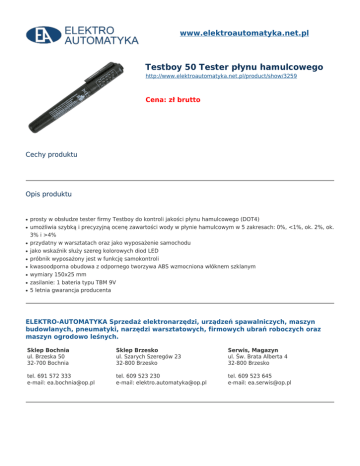 www.elektroautomatyka.net.pl Testboy 50 Tester płynu hamulcowego http://www.elektroautomatyka.net.pl/product/show/3259 Cena: zł brutto Cechy produktu Opis produktu ● ● ● ● ● ● ● ● ● prosty w obsłudze tester firmy Testboy do kontroli jakości płynu hamulcowego (DOT4) umożliwia szybką i precyzyjną ocenę zawartości wody w płynie hamulcowym w 5 zakresach: 0%, <1%, ok. 2%, ok. 3% i >4% przydatny w warsztatach oraz jako wyposażenie samochodu jako wskaźnik służy szereg kolorowych diod LED próbnik wyposażony jest w funkcję samokontroli kwasoodporna obudowa z odpornego tworzywa ABS wzmocniona włóknem szklanym wymiary 150x25 mm zasilanie: 1 bateria typu TBM 9V 5 letnia gwarancja producenta ELEKTRO-AUTOMATYKA Sprzedaż elektronarzędzi, urządzeń spawalniczych, maszyn budowlanych, pneumatyki, narzędzi warsztatowych, firmowych ubrań roboczych oraz maszyn ogrodowo leśnych. Sklep Bochnia ul. Brzeska 50 32-700 Bochnia Sklep Brzesko ul. Szarych Szeregów 23 32-800 Brzesko Serwis, Magazyn ul. Św. Brata Alberta 4 32-800 Brzesko tel. 691 572 333 e-mail: [email protected] tel. 609 523 230 e-mail: [email protected] tel. 609 523 645 e-mail: [email protected]