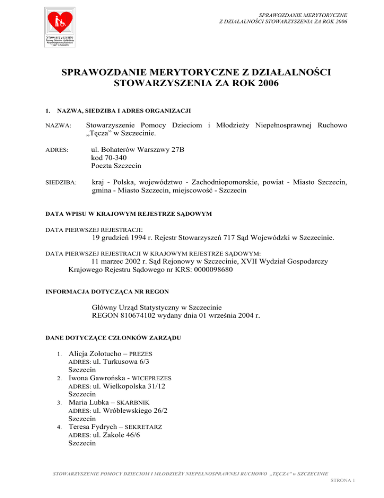 SPRAWOZDANIE MERYTORYCZNE Z DZIAŁALNOŚCI STOWARZYSZENIA ZA ROK 2006 SPRAWOZDANIE MERYTORYCZNE Z DZIAŁALNOŚCI STOWARZYSZENIA ZA ROK 2006 1. NAZWA, SIEDZIBA I ADRES ORGANIZACJI NAZWA: Stowarzyszenie Pomocy Dzieciom i MłodzieŜy Niepełnosprawnej Ruchowo „Tęcza” w Szczecinie. ADRES: ul. Bohaterów Warszawy 27B kod 70-340 Poczta Szczecin SIEDZIBA: kraj - Polska, województwo - Zachodniopomorskie, powiat - Miasto Szczecin, gmina - Miasto Szczecin, miejscowość - Szczecin DATA WPISU W KRAJOWYM REJESTRZE SĄDOWYM DATA PIERWSZEJ REJESTRACJI: 19 grudzień 1994 r. Rejestr Stowarzyszeń 717 Sąd Wojewódzki w Szczecinie. DATA PIERWSZEJ REJESTRACJI W KRAJOWYM REJESTRZE SĄDOWYM: 11 marzec 2002 r. Sąd Rejonowy w Szczecinie, XVII Wydział Gospodarczy Krajowego Rejestru Sądowego nr KRS: 0000098680 INFORMACJA DOTYCZĄCA NR REGON Główny Urząd Statystyczny w Szczecinie REGON 810674102 wydany dnia 01 września 2004 r. DANE DOTYCZĄCE CZŁONKÓW ZARZĄDU 1. Alicja Zołotucho – PREZES ADRES: ul. Turkusowa 6/3 Szczecin Iwona Gawrońska - WICEPREZES ADRES: ul. Wielkopolska 31/12 Szczecin 3. Maria Lubka – SKARBNIK ADRES: ul. Wróblewskiego 26/2 Szczecin 4. Teresa Fydrych – SEKRETARZ ADRES: ul. Zakole 46/6 Szczecin 2. STOWARZYSZENIE POMOCY DZIECIOM I MŁODZIEśY NIEPEŁNOSPRAWNEJ RUCHOWO „TĘCZA” w SZCZECINIE STRONA 1 SPRAWOZDANIE MERYTORYCZNE Z DZIAŁALNOŚCI STOWARZYSZENIA ZA ROK 2006 OKREŚLENIE CELÓW STATUTOWYCH STOWARZYSZENIA Zgodnie z § 5 rozdz. II Statutu Stowarzyszenia z dnia 17.03.2006 r. celem jego działalności jest inicjowanie i popieranie wszelkich form pomocy dla osób niepełnosprawnych i ich rodzin, a w szczególności dla dzieci i młodzieŜy niepełnosprawnej, której niepełnosprawność jest następstwem uszkodzenia Centralnego i Obwodowego Układu Nerwowego, cięŜkiej choroby, urazów i chorób genetycznych przez zapewnienie im pełni normalnego Ŝycia w warunkach umoŜliwiających rozwój oraz osiągniecie niezaleŜności społecznej. 2. ZASADY, FORMY I ZAKRES DZIAŁALNOŚCI STATUTOWEJ Cele statutowe Stowarzyszenie realizuje poprzez: • Działania na rzecz tworzenia oraz współpracę i wspieranie juŜ funkcjonujących ośrodków (placówek słuŜby zdrowia, placówek oświatowych, placówek opiekuńczych, poradni specjalistycznych). • Kompleksową rehabilitację członków Stowarzyszenie, którą realizuje poprzez - wczesną diagnozę, rehabilitację i terapię dzieci od 1 miesiąca do 7 roku Ŝycia oraz kontynuację tej rehabilitacji do 18 roku Ŝycia i powyŜej, • - psychologiczno – terapeutyczną opiekę nad rodziną, - usprawnianie psychospołeczne, - tworzenie grup aktywnej rehabilitacji, - tworzenie Warsztatów Terapii Zajęciowej, - tworzenie Zakładów Aktywności Zawodowej, - rehabilitację na płaszczyźnie: Ośrodek – Dom – Szkoła – Otoczenie – Rodzina, - rehabilitację w domu podopiecznego. Edukacje i terapię dzieci i młodzieŜy niepełnosprawnej, której zakres obejmuje: - wczesnointerwencyjne oddziaływanie edukacyjno – terapeutyczne i rehabilitacyjne, - rozwijanie, w ramach istniejący moŜliwości, zainteresowań, uzdolnień i talentów dzieci i młodzieŜy, • - indywidualne wspieranie rozwoju kaŜdego dziecka, - przygotowanie dzieci do nauki w szkole. Opiekę nad osobami niepełnosprawnymi i ich rodzinami, której zakres obejmuje: - koordynację pomocy i oddziaływań socjalno–społecznych na obszarze Stowarzyszenia, - indywidualne usługi opiekuńczo – pielęgnacyjne, STOWARZYSZENIE POMOCY DZIECIOM I MŁODZIEśY NIEPEŁNOSPRAWNEJ RUCHOWO „TĘCZA” w SZCZECINIE STRONA 2 SPRAWOZDANIE MERYTORYCZNE Z DZIAŁALNOŚCI STOWARZYSZENIA ZA ROK 2006 - prowadzenie kompleksowej opieki edukacyjnej, leczniczej i terapeutyczno – rehabilitacyjnej na terenie placówek opiekuńczych, dostosowanej do wieku osób niepełnosprawnych, ich potrzeb rozwojowych i społecznych, • tworzenie Centrum Wolontariatu i Centrum – Asystent Osobisty Osoby Niepełnosprawnej, • Świadczenie usług transportowych – przewóz osób niepełnosprawnych, • Tworzenie punktów poradnictwa społecznego, • Tworzenie zorganizowanych form wypoczynku w połączeniu z rehabilitacją (m.in. wycieczki, kolonie, obozy, zimowiska), • Tworzenie bazy sprzętu i kadr będących w wyłącznej dyspozycji Stowarzyszenia, • Systematyczne podnoszenie kwalifikacji członków Stowarzyszenia, wolontariuszy oraz pracowników zatrudnionych przez organizacje, indywidualne w stosunku do ich potrzeb i moŜliwości, • Wspieranie indywidualnych form na ujarzmiane niepełnosprawności, • Szkolenia oraz wymianę doświadczeń i informacji, • Działalność wydawniczą informacyjno – promocyjną, • Oddziaływanie na zmiany legislacyjne na obszarze lokalnym i ogólnokrajowym. W 2006 r. wśród realizowanych przez Stowarzyszenie zadań naleŜy wymienić: • opiekę terapeutyczno – rehabilitacyjną prowadzoną na terenie zawiadywanego przez Stowarzyszenie – Centrum Terapeutycznego dla Dzieci i MłodzieŜy Niepełnosprawnej, którą objęto 463 osób (dzieci i młodzieŜ niepełnosprawna a takŜe ich rodzice i opiekunowie); zakres opieki terapeutyczno – rehabilitacyjnej obejmował: - konsultacje lekarza rehabilitacji, z których skorzystało 193 pacjentów, w ramach 317 wizyt, - konsultacje lekarza ortopedy, z których skorzystało 158 pacjentów, w ramach 383 wizyt, - konsultacje lekarza neurologa – neonatologa, z których skorzystało 70 pacjentów, w ramach 94 wizyt, - konsultacje lekarza neurologa dziecięcego, z których skorzystało 79 pacjentów, w ramach 204 wizyt, - konsultacje lekarza psychiatry, z których skorzystało 19 pacjentów, w ramach 40 wizyt, - konsultacje lekarza pediatry, z których skorzystało 27 pacjentów, w ramach 33 wizyt, - terapię psychologiczną, z której skorzystało 127 osób, w ramach 610 spotkań, STOWARZYSZENIE POMOCY DZIECIOM I MŁODZIEśY NIEPEŁNOSPRAWNEJ RUCHOWO „TĘCZA” w SZCZECINIE STRONA 3 SPRAWOZDANIE MERYTOR
