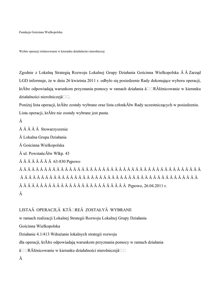 Poniżej lista operacji, ktĂłre zostały wybrane oraz lista członkĂłw Rady uczestniczących w posiedzeniu.