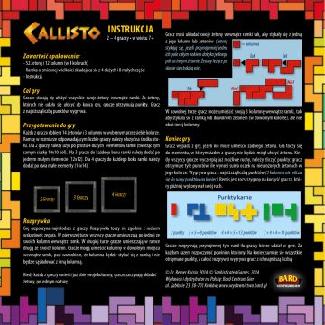INSTRUKCJA 2 – 4 graczy • w wieku 7+ Zawartość opakowania: - 52 żetony i 12 kolumn (w 4 kolorach) - Ramka o zmiennej wielkości składająca się z 4 dużych i 8 małych części - Instrukcja Gracz musi układać swoje żetony wewnątrz ramki tak, aby stykały się z jedną z jego kolumn lub żetonów (żetony stykają się, jeżeli przynajmniej jedno ich pole całym bokiem dotyka jednego z pól na innym żetonie. Żetony leżące po skosie się stykają nie). Cel gry Gracze starają się ułożyć wszystkie swoje żetony wewnątrz ramki. Za żetony, których nie udało się ułożyć do końca gry, gracze otrzymują punkty. Gracz z najniższą liczbą punktów wygrywa. Przygotowanie do gry Każdy z graczy dobiera 14 żetonów i 3 kolumny w wybranym przez siebie kolorze. Ramkę w rozmiarze odpowiadającym liczbie graczy należy ułożyć na środku stołu. Dla 2 graczy należy użyć po prostu 4 dużych elementów ramki (tworząc tym samym siatkę 10x10 pól). Dla 3 graczy do każdego boku ramki należy dodać po jednym małym elemencie (12x12). Dla 4 graczy do każdego boku ramki należy dodać po dwa małe elementy (14x14). 2 Graczy 3 Graczy 4 Graczy W dowolnej turze gracz może umieścić swoją 3 kolumnę wewnątrz ramki, tak aby stykała się z ramką lub dowolnym żetonem (w dowolnym kolorze), ale nie obok innej kolumny. Koniec gry Gracz wypada z gry, jeżeli nie może umieścić żadnego żetonu. Gra toczy się do momentu, w którym żaden z graczy nie będzie mógł ułożyć żetonu. Kiedy wszyscy gracze wyczerpią już możliwe ruchy, należy zliczyć punkty: gracz otrzymuje tyle punktów, ile wynosi suma oczek na nieułożonych żetonach w jego kolorze. Wygrywa gracz z najniższą liczbą punktów (3 kolumna nie wlicza się do sumy punktów na koniec). Remis jest rozstrzygany na korzyść gracza, który później wykonywał swój ruch. Punkty karne Rozgrywka Grę rozpoczyna najmłodszy z graczy. Rozgrywka toczy się zgodnie z ruchem wskazówek zegara. W pierwszej turze wszyscy gracze umieszczają po jednej ze swoich kolumn wewnątrz ramki. W drugiej turze gracze umieszczają w ramce drugą ze swoich kolumn. Gracze mogą umieścić kolumny w dowolnym miejscu wewnątrz ramki, pod warunkiem, że kolumna będzie stykać się z ramką i nie będzie sąsiadować z inną kolumną. Kiedy każdy z graczy umieści już obie swoje kolumny, gracze zaczynają układać żetony, po jednym na turę. 2 punkty 3 + 5 = 8 punktów 4 + 4 + 5 = 13 punktów 3 + 4 + 4 = 11 punktów Gracze rozgrywają przynajmniej tyle rund ilu graczy bierze udział w grze. Za każdym razem rozpoczynać powinien kto inny. Na koniec sumuje się wszystkie otrzymane punkty, a całość rozgrywki wygrywa gracz z ich najniższą liczbą! © Dr. Reiner Knizia, 2014, © Sophisticated Games, 2014 Wydawca i dystrybutor na Polskę: Bard Centrum Gier ul. Zabłocie 23, 30-701 Kraków, www.wydawnictwo.bard.pl