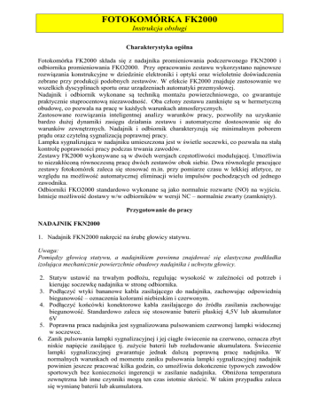 FOTOKOMÓRKA FK2000 Instrukcja obsługi Charakterystyka ogólna Fotokomórka FK2000 składa się z nadajnika promieniowania podczerwonego FKN2000 i odbiornika promieniowania FKO2000. Przy opracowaniu zestawu wykorzystano najnowsze rozwiązania konstrukcyjne w dziedzinie elektroniki i optyki oraz wieloletnie doświadczenia zebrane przy produkcji podobnych zestawów. W efekcie FK2000 znajduje zastosowanie we wszelkich dyscyplinach sportu oraz urządzeniach automatyki przemysłowej. Nadajnik i odbiornik wykonane są techniką montażu powierzchniowego, co gwarantuje praktycznie stuprocentową niezawodność. Oba człony zestawu zamknięte są w hermetyczną obudowę, co pozwala na pracę w każdych warunkach atmosferycznych. Zastosowane rozwiązania inteligentnej analizy warunków pracy, pozwoliły na uzyskanie bardzo dużej dynamiki zasięgu działania zestawu i automatyczne dostosowanie się do warunków zewnętrznych. Nadajnik i odbiornik charakteryzują się minimalnym poborem prądu oraz czytelną sygnalizacją poprawnej pracy. Lampka sygnalizująca w nadajniku umieszczona jest w świetle soczewki, co pozwala na stałą kontrolę poprawności pracy podczas trwania zawodów. Zestawy FK2000 wykonywane są w dwóch wersjach częstotliwości modulującej. Umożliwia to niezakłóconą równoczesną pracę dwóch zestawów obok siebie. Dwa równolegle pracujące zestawy fotokomórek zaleca się stosować m.in. przy pomiarze czasu w lekkiej atletyce, ze względu na możliwość automatycznej eliminacji wielu impulsów pochodzących od jednego zawodnika. Odbiorniki FKO2000 standardowo wykonane są jako normalnie rozwarte (NO) na wyjściu. Istnieje możliwość dostawy w/w odbiorników w wersji NC – normalnie zwarty (zamknięty). Przygotowanie do pracy NADAJNIK FKN2000 1. Nadajnik FKN2000 nakręcić na śrubę głowicy statywu. Uwaga: Pomiędzy głowicą statywu, a nadajnikiem powinna znajdować się elastyczna podkładka izolująca mechanicznie powierzchnie obudowy nadajnika i uchwytu głowicy. 2. Statyw ustawić na trwałym podłożu, regulując wysokość w zależności od potrzeb i kierując soczewkę nadajnika w stronę odbiornika. 3. Podłączyć wtyki bananowe kabla zasilającego do nadajnika, zachowując odpowiednią biegunowość – oznaczenia kolorami niebieskim i czerwonym. 4. Podłączyć końcówki konektorowe kabla zasilającego do źródła zasilania zachowując biegunowość. Standardowo zaleca się stosowanie baterii płaskiej 4,5V lub akumulator 6V 5. Poprawna praca nadajnika jest sygnalizowana pulsowaniem czerwonej lampki widocznej w soczewce. 6. Zanik pulsowania lampki sygnalizacyjnej i jej ciągłe świecenie na czerwono, oznacza zbyt niskie napięcie zasilające tj. zużycie baterii lub rozładowanie akumulatora. Świecenie lampki sygnalizacyjnej gwarantuje jednak dalszą poprawną pracę nadajnika. W normalnych warunkach od momentu zaniku pulsowania lampki sygnalizacyjnej nadajnik powinien jeszcze pracować kilka godzin, co umożliwia dokończenie typowych zawodów sportowych bez konieczności ingerencji w zasilanie nadajnika. Obniżona temperatura zewnętrzna lub inne czynniki mogą ten czas istotnie skrócić. W takim przypadku zaleca się wymianę baterii lub akumulatora. ODBIORNIK FKO2000 1. Odbiornik FKO2000 nakręcić na śrubę głowicy statywu. Uwaga: Pomiędzy głowicą statywu, a odbiornikiem powinna znajdować się elastyczna podkładka izolująca mechanicznie powierzchnie obudowy odbiornika i uchwytu głowicy. 2. Statyw ustawić na trwałym podłożu, na wysokości identycznej jak statyw nadajnika, tak aby nadajnik i odbiornik usytuowane były na przeciwległych końcach linii mety. 3. Podłączyć przewód zasilający zakończony wtykami bananowymi do odbiornika, zachowując odpowiednią biegunowość. Odpowiednie końcówki nasadkowe podłączyć do źródła zasilania – akumulatora 6V. 4. W przypadku współpracy fotokomórki z chronometrem należy gniazda żółte odbiornika połączyć z odpowiednią parą gniazd wejściowych chronometru. 5. Skierować soczewkę odbiornika w stronę nadajnika. Przez okres ok. 15 sekund po włączeniu zasilania następuje automatyczna analiza i uśrednianie warunków zewnętrznych pracy odbiornika (m.in. atmosferycznych) i po upływie tego czasu można dokonać ostatecznej korekty we wzajemnym ustawieniu nadajnika i odbiornika. 6. Na tylnej ściance odbiornika znajdują się dwie lampki sygnalizacyjne. Świecenie lampki czerwonej oznacza brak sygnału z nadajnika. Świecenie lampki zielonej jest potwierdzeniem odpowiedniego poziomu napięcia zasilającego odbiornik. 7. Po sprawdzeniu prawidłowego funkcjonowania współpracujących urządzeń należy skontrolować stabilność ustawienia statywów, trwałość zamocowania nadajnika i odbiornika – należy dokręcić wkręty aretujące i docisnąć łączówki i wtyki. Parametry techniczne Nadajnik FKN2000 Napięcie zasilania Pobór prądu Częstotliwość modulacji Wymiary Masa 4,5V +/- 2V 70mA 204,8kHz / opcjonalnie 153,6kHz ∅54x183mm 340g Odbiornik FKO2000 Napięcie zasilania Pobór prądu Opóźnienie zwarcia Wymiary Masa 4,7V÷14V 10/40mA <1ms ∅54x212mm 420g Zestaw FK2000 Zasięg gwarantowany Zakres temperatur pracy Masa z wyposażeniem >100m -20°C÷+50°C 4,2kg Wyposażenie standardowe: • Walizka aluminiowa transportowa • Kabel zasilający 1,5m – 2 szt • Instrukcja obsługi • Karta gwarancyjna Wyposażenie dodatkowe: • Statywy – 2 szt • Akumulator 6V – 2 szt • Ładowarka akumulatorów • Przewód połączeniowy Schemat wyprowadzeń elektrycznych FK2000 www.kess.pl