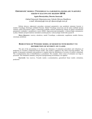 ODPORNOŚĆ MODELU TWEEDIEGO NA ZABURZENIA ROZKŁADU WARTOŚCI SZKÓD W SZACOWANIU REZERW IBNR Agata Boratyńska, Dorota Juszczak Zakład Statystyki Matematycznej, Szkoła Główna Handlowa e-mail: [email protected], [email protected] Referat dotyczy odporności procedury estymacji parametrów oraz predykcji zmiennej losowej w modelu Tweediego złożonego rozkładu Poissona. Model Tweediego stosowany jest do opisu rozkładu łącznej wartości szkód. Rozważono wpływ ε-zaburzenia rozkładu wartości pojedynczej szkody na jakość estymatorów parametrów rozkładów i predyktorów rezerw IBNR. Zaprezentowano przypadek, w którym błędy estymatorów są duże. Badanie przeprowadzono metodami symulacyjnymi, wykorzystując środowisko języka R. Słowa kluczowe: rezerwy szkodowe, model Tweediego, ε-zaburzenie, uogólnione modele liniowe, estymacja, predykcja ROBUSTNESS OF TWEEDIE MODEL OF RESERVES WITH RESPECT TO DISTRIBUTION OF SEVERITY OF CLAIMS The aim of the presentation is to discuss the robustness of estimation procedures and robustness of prediction in Tweedie's compound Poisson model. This model is applied to the claim reserving problem. The quality of parameter estimators and predictors is studied when the distribution of severity of claims is disturbed. The ε-contamination class of distributions is considered. The example, where errors of estimators are large is presented. The simulation methods, using the R programming environment, are applied. Keywords: loss reserves, Tweedie model, ε-contamination, generalized linear model, estimation, prediction 1