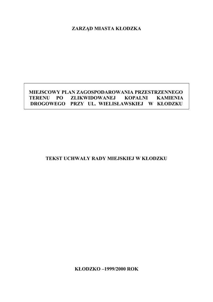 ZARZĄD MIASTA KŁODZKA MIEJSCOWY PLAN ZAGOSPODAROWANIA PRZESTRZENNEGO TERENU PO ZLIKWIDOWANEJ KOPALNI KAMIENIA DROGOWEGO PRZY UL. WIELISŁAWSKIEJ W KŁODZKU TEKST UCHWAŁY RADY MIEJSKIEJ W KŁODZKU KŁODZKO –1999/2000 ROK UCHWAŁA Nr XXXVI/221/2000 Rady Miejskiej w Kłodzku z dnia 23 listopada 2000r. w sprawie uchwalenia miejscowego planu zagospodarowania przestrzennego terenu po zlikwidowanej kopalni kamienia drogowego przy ul.Wielisławskiej w Kłodzku. Na podstawie art.18 ust.2 pkt 5 i pkt 8 ustawy z dnia 8 marca 1990 r. o samorządzie gminnym (j. t. z 1996 r. Dz.U. Nr 13 poz 74, z późniejszymi zmianami), art. 7, art. 18 ust. 2 pkt 14, art. 14, art. 26, art. 28 i art. 36 ust. 3 ustawy z dnia 7 lipca 1994 r. o zagospodarowaniu przestrzennym ( j. t. ustawy Dz. U. Nr 15 poz. 139), w związku z Uchwałą nr L / 374 / 98 Rady Miejskiej w Kłodzku z dnia 22 maja 1998 roku o przystąpieniu do sporządzenia zmiany miejscowego planu ogólnego zagospodarowania przestrzennego miasta Kłodzko dla obszaru po zlikwidowanej kopalni kamienia drogowego przy ulicy Wielisławskiej w Kłodzku. Rada Miejska w Kłodzku postanawia, co następuje : §1 Uchwala się miejscowy plan zagospodarowania przestrzennego terenu po zlikwidowanej kopalni kamienia drogowego przy ul.Wielisławskiej w Kłodzku. Rozdział I Przepisy ogólne §2 1. Uchwalony miejscowy plan zagospodarowania przestrzennego po zlikwidowanej kopalni kamienia drogowego przy ul. Wielisławskiej w Kłodzku jest obowiązującym przepisem gminnym w zakresie gospodarki przestrzennej i stanowi podstawę do ustalenia dla tego terenu warunków zabudowy i zagospodarowania. Decyzje o warunkach zabudowy i zagospodarowania terenu sprzeczne z ustaleniami planu są nieważne. 2. Dla terenu objętego niniejszym planem tracą moc ustalenia miejscowego planu ogólnego zagospodarowania przestrzennego miasta Kłodzka zatwierdzonego uchwałą Nr 34/86 Miejskiej Rady Narodowej w Kłodzku z dnia 27.03.1986 roku. §3 1. Ilekroć w dalszych przepisach uchwały jest mowa o: 1.1 uchwale – należy przez to rozumieć niniejszą uchwałę, 1.2 planie – należy przez to rozumieć miejscowy plan zagospodarowania przestrzennego terenu po zlikwidowanej kopalni kamienia drogowego przy ul. Wielisławskiej w Kłodzku, 1.3 przepisach szczególnych i odrębnych - należy przez to rozumieć odpowiednie przepisy ustaw wraz z aktami wykonawczymi, 1.4 rysunku planu - należy przez to rozumieć graficzny zapis planu przedstawiony na mapie sytuacyjno-wysokościowej w skali 1 : 1000, stanowiącej załącznik do niniejszej uchwały, 1.5 terenie - należy przez to rozumieć teren w granicach planu, ograniczony liniami rozgraniczającymi i oznaczony odpowiednimi symbolami, tak jak na rysunku planu, 1.6 przeznaczeniu podstawowym terenu - należy przez to rozumieć podstawowe funkcje, pod które przeznacza się ograniczony liniami rozgraniczającymi i oznaczony odpowiednim symbolem teren na rysunku planu, 1.7 przeznaczeniu dopuszczalnym terenu-należy przez to rozumieć funkcje, które mogą być wprowadzone na części terenu określonego w punkcie 3.6 lub na całym terenie ograniczonym liniami rozgraniczającymi, jeżeli takie jest zapotrzebowanie rynkowe lub społeczne. §4 Dla obszaru objętego miejscowym planem ustala się następujące funkcje zagospodarowania dla poszczególnych terenów: - tereny usług i handlu oznaczonej w planie symbolem UH - tereny baz, składów i hurtowni, oznaczone w planie symbolem S - tereny baz, składów i hurtowni, oraz rzemiosła nieuciążliwego i usług transportowych oznaczone w planie symbolem S / Ut - tereny usług sportu oznaczone w planie symbolem US - tereny zieleni niskiej urządzonej oznaczone w planie symbolem ZNu - tereny komunikacji oznaczone w planie symbolem KD,KP,KG. §5 Miejscowym planem zagospodarowania przestrzennego objęto teren położony przy ul. Wielisławskiej w granicach działek nr : 6, 2/2, 3/1, 3/2, 3/3, 4/2. Teren ten określa rysunek planu. §6 Integralną częścią miejscowego planu jest rysunek planu w skali 1 : 1000 stanowiący załącznik nr 1 do niniejszej uchwały Oznaczenia graficzne występujące w rysunku planu są obowiązującymi ustaleniami planu, a w szczególności: - przeznaczenie terenów, - linie rozgraniczające tereny o różnym sposobie użytkowania granice opracowania planu, zasady obsługi w zakresie infrastruktury technicznej, zasady obsługi komunikacji, zasady podziału terenu na działki budowlane, nieprzekraczalne i obowiązujące linie zabudowy, warunki i standardy kształtowania zabudowy oraz zagospodarowania terenu, zasady kształtowania zieleni. Rozdział II Przepisy szczegółowe §7 Dla obszaru objętego miejscowym planem ustala się następujące przeznaczenie podstawowe i dopuszczalne dla poszczególnych terenów i działek: 1 UH/US - teren usług, handlu i sportu 2 UH - teren usług handlu 3S - teren baz, składów i hurtowni 4 S/UT - tereny baz, składów i hurtowni oraz nieuciążliwego i usług transportowych 5 KP , 6 KP - tereny parkingów 6 ZNu - tereny zieleni niskiej urządzonej 1 KD, 2KD, 3 KD, KG - tereny komunikacji Zasady §8 zagospodarowania terenu i rzemiosła kształtowania zabudowy. 1. 1UH/US – teren usług handlu – giełda samochodowa, giełda rolno – spożywcza. Jako funkcja uzupełniająca - terenu usług sportu i rekreacji – sport wspinaczkowy ( wspinaczka skałkowa ) 1.1 Dla potrzeb giełdy wykorzystać teren po wyrobisku kamienia. 1.2 Teren należy uprzednio zrekultywować i utwardzić. 1.3 Obiekty kubaturowe obsługujące funkcje usługowo – handlową: adaptowany obiekt administracyjno – gospodarczy i budynek nowoprojektowany. 1.4 Dla budynku nowoprojektowanego obowiązującą i nieprzekraczalną linię zabudowy określa rysunek planu. 1.5 Maksymalna wysokość zabudowy dla dwóch budynków 2 kondygnacje 1.6 Dojazd do terenu giełdy od strony drogi 1 KD, ulicy dojazdowej 2 KD i w granicach działki giełdy, drogą gospodarczą KG. 1.7 Miejsca postoj