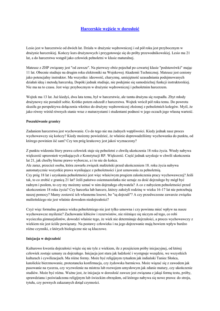 Harcerskie wejście w dorosłość Lesio jest w harcerstwie od dwóch lat. Działa w drużynie wędrowniczej i od pół roku jest przybocznym w drużynie harcerskiej. Kończy kurs drużynowych i przygotowuje się do próby przewodnikowskiej. Lesio ma 21 lat, a do harcerstwa wstąpił jako człowiek pełnoletni w klasie maturalnej. Mateusz z ZHP związany jest "od zawsze". Na pierwszy obóz pojechał po czwartej klasie "podstawówki" mając 11 lat. Obecnie studiuje na drugim roku elektroniki na Wojskowej Akademii Technicznej. Mateusz jest ceniony jako potencjalny instruktor. Ma wszystko: ideowość, charyzmę, umiejętność uzasadniania podejmowanych działań ideą i metodą harcerską. Dopóki jednak studiuje, nie podejmie się samodzielnej funkcji instruktorskiej. Nie ma na to czasu. Jest więc przybocznym w drużynie wędrowniczej i pełnoletnim harcerzem. Wojtek ma 13 lat. Już kiedyś, dwa lata temu, był w harcerstwie, ale tamta drużyna się rozpadła. Zbyt młody drużynowy nie poradził sobie. Krótko potem odszedł z harcerstwa. Wojtek wrócił pół roku temu. Do powrotu skusiła go perspektywa dołączenia wkrótce do drużyny wędrowniczej złożonej z pełnoletnich kolegów. Myśl, że jako równy wśród równych stanie wraz z maturzystami i studentami podnosi w jego oczach jego własną wartość. Poszukiwanie granicy Zadaniem harcerstwa jest wychowanie. Co do tego nie ma żadnych wątpliwości. Kiedy jednak nasz proces wychowawczy się kończy? Kiedy możemy powiedzieć, że właśnie doprowadziliśmy wychowanka do punktu, od którego powinien iść sam? Czy ten próg krańcowy jest jakoś wyznaczony? Z punktu widzenia litery prawa człowiek staje się pełnoletni z chwilą ukończenia 18 roku życia. Wtedy nabywa większość uprawnień wynikających z Konstytucji RP. Większość. Część jednak uzyskuje w chwili ukończenia lat 21, jak choćby bierne prawo wyborcze, a i to nie do końca. Ale zaraz, przecież osoba, która zawarła związek małżeński przed ukończeniem 18. roku życia nabywa automatycznie wszystkie prawa wynikające z pełnoletności i jest uznawania za pełnoletnią. Czy próg 18 lat i uzyskania pełnoletności jest więc właściwym progiem zakończenia pracy wychowawczej? Jeśli tak, to co zrobić z granicą 21 lat? Jeśli państwo osiemnastolatka nie uznaje za dość dojrzałego by mógł być radnym i posłem, to czy my możemy uznać w nim dojrzałego obywatela? A co z nabyciem pełnoletności przed ukończeniem 18 roku życia? Czy harcerka lub harcerz, którzy założyli rodzinę w wieku 16-17 lat nie potrzebują naszej pomocy? Mamy zostawić ich własnemu losowi, bo "są dojrzali"? A czy przedwczesne zawarcie związku małżeńskiego nie jest właśnie dowodem niedojrzałości? Czyż więc formalna granica wieku pełnoletniego nie jest tylko umowna i czy powinna mieć wpływ na nasze wychowawcze myślenie? Zachowanie kibiców i rezerwistów, nie różniące się niczym od tego, co robi wycieczka gimnazjalistów, dowodzi właśnie tego, że wiek nie determinuje dojrzałości, a proces wychowawczy z wiekiem nie jest ściśle powiązany. Na postawy człowieka i na jego dojrzewanie mają bowiem wpływ bardzo różne czynniki, z których biologiczne nie są kluczowe. Inicjacja w dojrzałość Kulturowo kwestia dojrzałości wiąże się nie tyle z wiekiem, ile z przejściem próby inicjacyjnej, od której człowiek zostaje uznany za dojrzałego. Inicjacja jest stara jak ludzkość i występuje wszędzie, we wszystkich kulturach i cywilizacjach. Ma różne formy. Może być religijnym rytuałem jak indiański Taniec Słońca, katolickie bierzmowanie, protestancka konfirmacja, czy żydowska barmicwa. Może wiązać się z zawodem jak pasowanie na rycerza, czy wyzwolenie na mistrza lub rozwojem umysłowym jak zdanie matury, czy ukończenie studiów. Może być różna. Ważne jest, że inicjacja w dorosłość zawsze jest związana z jakąś formą testu, próby, sprawdzianu i poświadczona religijnym lub świeckim obrzędem, od którego nabywa się nowe prawa: do stroju, tytułu, czy pewnych zakazanych dotąd czynności. Harcerz w swoim rozwoju takich progów ma kilka. Pierwszym jest obietnica zuchowa dająca mu prawo noszenia munduru takiego jaki ma "duży druh". Drugi stanowi, oczywiście, Przyrzeczenie Harcerskie, od którego harcerz upodabnia się coraz bardziej do swojego ideału, stając się stopniowo prawie jak drużynowy. Kolejny próg, to naramiennik wędrowniczy pozwalający czuć się elitą elit, wybrańcem. I wreszcie... No właśnie, nie ma tego "wreszcie". Nie ma ostatniego progu, stanowiącego harcerską maturę, podsumowującego drogę harcerza i stanowiącego nasz firmowy znak jakości. Takim progiem zamykającym proces wychowawczy mogłaby być próba Harcerza Rzeczypospolitej i patrząc na regulaminy tego stopnia można dojść do wniosku, że miał on być taką właśnie inicjacją w dorosłość. Niestety, nie jest. Dlaczego? Prawdopodobnie dlatego, że do stopni autorzy podeszli źle. Zamiast zacząć od wskazania "modelu docelowego" opisując go wymaganiami Harcerza Rzeczypospolitej, a potem w regulaminach kolejnych stopni określać etapy dojścia, dopasowywano wymagania stopni do z góry określonych poziomów wiekowych. W efekcie mamy to, co mamy. Przyjęcie Harcerza Rzeczypospolitej za próg końcowy harcerskiego procesu wychowawczego pozwoliłoby nie tylko precyzyjnie opisać całość oddziaływań pedagogicznych w ZHP, ale także rozwiązałoby kwestię pełnoletnich harcerzy. Przyczajony problem, ukryty skarb Nie ulega wątpliwości, że członkowie ZHP, którzy ukończyli 18 lat, a nie są instruktorami, stanowią swoisty problem. Z jednej strony są bardzo ważnym rezerwuarem kadry instruktorskiej. To spośród nich werbuje się kandydatów na drużynowych, a po reformie szkolnej proces ten będzie narastał choćby dlatego, że do matury wędrownik nie ma czasu na podejmowanie poważnych i samodzielnych funkcj