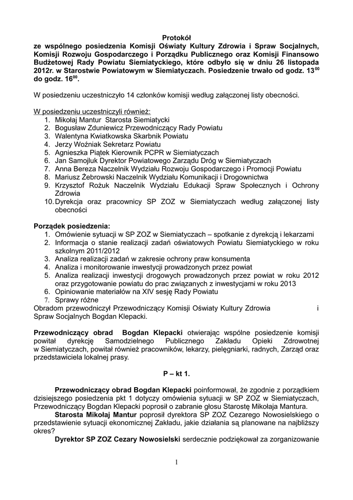 Protokół ze wspólnego posiedzenia Komisji Oświaty Kultury Zdrowia i Spraw Socjalnych, Komisji Rozwoju Gospodarczego i Porządku Publicznego oraz Komisji Finansowo Budżetowej Rady Powiatu Siemiatyckiego, które odbyło się w dniu 26 listopada 2012r. w Starostwie Powiatowym w Siemiatyczach. Posiedzenie trwało od godz. 13 00 do godz. 1600. W posiedzeniu uczestniczyło 14 członków komisji według załączonej listy obecności. W posiedzeniu uczestniczyli również: 1. Mikołaj Mantur Starosta Siemiatycki 2. Bogusław Zduniewicz Przewodniczący Rady Powiatu 3. Walentyna Kwiatkowska Skarbnik Powiatu 4. Jerzy Woźniak Sekretarz Powiatu 5. Agnieszka Piątek Kierownik PCPR w Siemiatyczach 6. Jan Samojluk Dyrektor Powiatowego Zarządu Dróg w Siemiatyczach 7. Anna Bereza Naczelnik Wydziału Rozwoju Gospodarczego i Promocji Powiatu 8. Mariusz Żebrowski Naczelnik Wydziału Komunikacji i Drogownictwa 9. Krzysztof Rożuk Naczelnik Wydziału Edukacji Spraw Społecznych i Ochrony Zdrowia 10. Dyrekcja oraz pracownicy SP ZOZ w Siemiatyczach według załączonej listy obecności Porządek posiedzenia: 1. Omówienie sytuacji w SP ZOZ w Siemiatyczach – spotkanie z dyrekcją i lekarzami 2. Informacja o stanie realizacji zadań oświatowych Powiatu Siemiatyckiego w roku szkolnym 2011/2012 3. Analiza realizacji zadań w zakresie ochrony praw konsumenta 4. Analiza i monitorowanie inwestycji prowadzonych przez powiat 5. Analiza realizacji inwestycji drogowych prowadzonych przez powiat w roku 2012 oraz przygotowanie powiatu do prac związanych z inwestycjami w roku 2013 6. Opiniowanie materiałów na XIV sesję Rady Powiatu 7. Sprawy różne Obradom przewodniczył Przewodniczący Komisji Oświaty Kultury Zdrowia i Spraw Socjalnych Bogdan Klepacki. Przewodniczący obrad Bogdan Klepacki otwierając wspólne posiedzenie komisji powitał dyrekcję Samodzielnego Publicznego Zakładu Opieki Zdrowotnej w Siemiatyczach, powitał również pracowników, lekarzy, pielęgniarki, radnych, Zarząd oraz przedstawiciela lokalnej prasy. P – kt 1. Przewodniczący obrad Bogdan Klepacki poinformował, że zgodnie z porządkiem dzisiejszego posiedzenia pkt 1 dotyczy omówienia sytuacji w SP ZOZ w Siemiatyczach, Przewodniczący Bogdan Klepacki poprosił o zabranie głosu Starostę Mikołaja Mantura. Starosta Mikołaj Mantur poprosił dyrektora SP ZOZ Cezarego Nowosielskiego o przedstawienie sytuacji ekonomicznej Zakładu, jakie działania są planowane na najbliższy okres? Dyrektor SP ZOZ Cezary Nowosielski serdecznie podziękował za zorganizowanie 1 spotkania w tym gronie. Szpital w Siemiatyczach jest jednym z największych pracodawców na terenie Powiatu Siemiatyckiego, w chwili obecnej zatrudnia 243 osoby na umowę o pracę, 81 osób na umowy cywilnoprawne, 3 pracowników na umowy zlecenie, 4 pracowników na umowy o dzieło i 27 stażystów z Urzędu Pracy. Po 10 miesiącach funkcjonowania w 2012 roku strata na koniec października wynosi 514 tys. zł., można powiedzieć, że ta strata nie jest wysoka ponieważ w listopadzie dostaliśmy wzrost finansowania na szpital w kwocie 317 tys. zł. co zostało pomniejszone o niewykonania w sumie 254 tys. zł. Szacujemy że na koniec 2012 roku strata zamknie się kwotą 432 tys. zł. nie uwzględniając ewentualnych ugód, które na pewno będą oraz nie jest tu uwzględniona kwota amortyzacji. Najprawdopodobniej w 2012 roku organ założycielski nie będzie musiał dopłacać do SP ZOZ w Siemiatyczach, co przewiduje ustawa o działalności leczniczej. Finansowo, na papierze nie wygląda to źle natomiast nie ma co ukrywać że mamy należności z lat ubiegłych, które się za nami ciągną i powodują, że czasami dochodzi do braku płynności finansowej. Działania, jakie podjęliśmy w 2012 roku miały na celu pokazanie Narodowemu Funduszowi Zdrowia, który jest płatnikiem, że szpital w Siemiatyczach nie jest tylko szpitalem działającym zachowawczo. Przełożyło się to na wzrost kontraktów.Te pieniądze są to pieniądze, które powinniśmy przeznaczać na bieżącą działalność i to robimy, jest to leczenie pacjentów, zakup leków, zakup podstawowego, jednorazowego sprzętu medycznego , są to wynagrodzenia pracowników. Niestety, borykamy się z takimi sprawami jak remonty. W związku z nakazami sanepidu przygotowane zostały plany remontowe. Dyrektor Cezary Nowosielski poinformował, że chciałby, aby pracownicy odpowiedzialni za te zagadnienia przedstawili informacje w tej sprawie. Do końca 2012 roku mamy obowiązek wykonania dwóch remontów: na oddziale wewnętrznym i na oddziale chirurgicznym - są to nakazy sanepidu. Wykonaliśmy programy funkcjonalno użytkowe, które zakładają wyremontowanie tych oddziałów, dostosowanie ich do najnowszych wymogów oraz podniesienie komfortu leczenia pacjentów. Te dwa remonty – mamy kosztorys na te remonty – jest to 1.800 tys. zł. brutto . Wiemy, że najprawdopodobniej w wyniku przetargu kwoty te będą trochę niższe. Dyrektor Cezary Nowosielski poinformował, że wspólnie ze swoim zastępcą panem dr Prochowiczem był w szpitalu w Siedlcach, gdzie koszt remontu dwóch takich samych oddziałów zamknął się w kwocie około 1 mln zł. Następna rzecz, którą musimy zrobić jest to tomograf komputerowy. Jesteśmy jednym z nielicznych powiatów w okolicy, który nie posiada tomografu komputerowego w związku z tym przystąpiliśmy do realizacji planu uruchomienia tomografii komputerowej. W chwili obecnej wydajemy od 7 do 10 tys. zł. miesięcznie na transport oraz tomografie zewnętrzne natomiast zakup tomografu to jest miesięczny koszt około 27 tys. zł. - jest to rata miesięczna za tomograf wraz z finansowaniem. Przeprowadziliśmy rozmowy z Narodowym Funduszem Zdrowia i jest szansa, aby w II kwartale przyszłego roku uzyskać kontrakt na tomografię komputerową, byłby to kontrakt najprawdopodobniej zbliżony do kontraktów, które mają powiaty ościenne czyli około 20 tys. zł. Dyrektor Cezary 