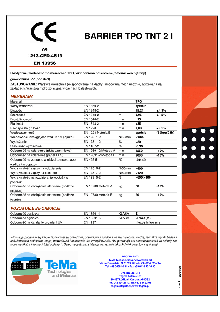 BARRIER TPO TNT 2 I 09 1213-CPD-4513 EN 13956 Elastyczna, wodoodporna membrana TPO, wzmocniona poliestrem (materiał wewnętrzny) geowłóknina PP (podkład) ZASTOSOWANIE: Warstwa wierzchnia (eksponowana) na dachy, mocowana mechanicznie, zgrzewana na zakładach. Warstwa hydroizolacyjna w dachach balastowych. MEMBRANA Materiał Wady widoczne Długość Szerokość Prostoliniowość Płaskość Rzeczywista grubość Wodoszczelność Właściwości rozciągające wzdłuż / w poprzek Wydłużenie Stabilność wymiarowa Odporność na uderzenie (płyta aluminiowa) Odporność na uderzenie (panel EPS) Odporność na zginanie w niskiej temperaturze wzdłuż / w poprzek Wytrzymałość złączy na oddzieranie Wytrzymałość złączy na ścinanie Wytrzymałość na rozdzieranie wzdłuż / w poprzek Odporność na obciążenia statyczne (podłoże miękkie) Odporność na obciążenia statyczne (podłoże N/50mm TPO spełnia 15,21 3,05 <15 <35 1,88 spełnia >1800 EN 12311-2 EN 1107-2 EN 12691-2 Metoda A EN 12691-2 Metoda B EN 495-5 % % mm mm °C >30 -0,35 1250 2000 -40/-40 EN 12316-2 EN 12317-2 EN 12310-2 N/50mm N/50mm N >400 >1200 >600/>800 EN 12730 Metoda A kg 20 -10% EN 12730 Metoda B kg 20 -10% EN 13501-1 EN 13501-5 EN 1297 KLASA KLASA E B roof (t1) niezdefiniowany EN 1850-2 EN 1848-2 EN 1848-2 EN 1848-2 EN 1848-2 EN 1928 EN 1928 Metoda B EN 12311-2 m m mm mm mm +/- 1% +/- 5% +/- 5% (60kpa/24h) -10% -10% twarde) POZOSTAŁE INFORMACJE Odporność ogniowa Odporność ogniowa Odporność na działanie promieni UV DYSTRYBUTOR: Tegola Polonia Ltd 90-437 Łódź, al. Kościuszki 80/82 tel. 042 636 24 42, fax 042 637 32 05 [email protected], www.tegola.pl rev.4 PRODUCENT: TeMa Technologies and Materials srl Via dell'Industria, 21 31029 Vittorio V.to (TV), Włochy Tel. +39.0438.50.31 - Fax +39.0438.50.34.60 22/01/09 Informacje podane w tej karcie technicznej są prawdziwe, prawidłowe i zgodne z naszą najlepszą wiedzą, jednakże wyniki badań i doświadczenia praktyczne mogą spowodować konieczność ich zweryfikowania. Ani gwarancja ani odpowiedzialność za szkody nie mogą wynikać z informacji tutaj podanych. Dalej, nie jest naszą intencją naruszanie jakichkolwiek patentów czy licencji.