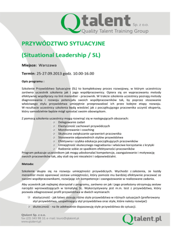PRZYWÓDZTWO SYTUACYJNE (Situational Leadership / SL) Miejsce: Warszawa Termin: 25-27.09.2013 godz. 10.00-16.00 Opis programu : Szkolenie Przywództwo Sytuacyjne (SL) to kompleksowy proces rozwojowy, w którym uczestniczy zarówno uczestnik szkolenia jak i jego współpracownicy. Opiera się on wypracowaniu metody efektywnej współpracy na linii menedżer - pracownik. W trakcie szkolenia uczestnicy poznają metody diagnozowania i rozwoju potencjału swoich współpracowników tak, by poprzez stosowanie właściwego stylu przywództwa umiejętnie przeprowadzać ich przez kolejne etapy rozwoju. W rezultacie uczestnicy szkolenia będą wiedzieć jak z początkującego pracownika uczynić eksperta, który samodzielnie będzie mógł sprostać swoim obowiązkom. Z pomocą szkolenia uczestnicy mogą rozwinąć się w następujących obszarach: Delegowanie zadań Elastyczność zachowań przywódczych Monitorowanie i coaching Skuteczne zwiększanie uprawnień pracownika Stosowanie odpowiednich stylów przywództwa Efektywna i szybka edukacja początkujących pracowników Umiejętność skutecznego nagradzania i właściwe korzystanie z krytyki Radzenie sobie ze spadkiem efektywności pracowników Program pokazuje uczestnikom jak mogą udoskonalać kompetencje, zaangażowanie i motywację swoich pracowników tak, aby stali się oni niezależni i odpowiedzialni. Metoda: Szkolenie skupia się na rozwoju umiejętności przywódczych. Wychodzi z założenia, że każdy menedżer może opanować zestaw umiejętności, który pomoże mu bardziej efektywnie pracować ze swoimi współpracownikami, rozwijając ich kompetencje i zaangażowanie w realizowane zadania. Aby uczestnik jak najlepiej skorzystał z programu, zarówno on jak i jego przełożony otrzymują zestaw narzędzi wprowadzających w tematykę SL. Wykorzystywany jest m.in. test z przywództwa, który pozwala zdiagnozować profil przywództwa w dwóch wymiarach: elastyczność - jak łatwo stosuję różne style przywództwa w różnych sytuacjach (preferowany styl przywództwa, uzupełniający styl przywództwa oraz style, które należy rozwijać) skuteczność - na ile adekwatnie dopasowuję style przywództwa do sytuacji. Wyniki testu są analizowane podczas warsztatu, będąc podstawą do działań poprawiających elastyczność i skuteczność. Na podstawie analizy wyników testu uczestnik jest w stanie odpowiedzieć sobie na następujące pytania: Czy i jak często używam różnych stylów przywództwa? Czy moje podejście do pracowników jest zróżnicowane w zależności od etapu ich rozwoju? Czy używam odpowiedniego stylu przywództwa w celu rozwoju moich pracowników? Czy potrzebuję zmienić swój styl przywództwa? Jeśli tak to, w jaki sposób? Program szkolenia: Model „Situational Leadership” został pierwotnie opracowany przez Kenneth’a Blancharda, niekwestionowany autorytet w dziedzinie zarządzania, m.in. współautora książki „Jednominutowy Menedżer”, a następnie twórczo rozwijany przez wielu innych trenerów, doradców i coachów pracujących z biznesem. SL został, jak dotychczas, sprawdzony przez ponad milion menedżerów na całym świecie. Pierwszy dzień warsztatu 1. Wprowadzenie Cele i program warsztatu. „The Future” – jak przewodzić we współczesnym biznesie? Mapa Wpływu – narzędzie łączące umiejętności SL z celami firmy, działu, uczestnika szkolenia. Podstawowe założenia i wartości Przywództwa Sytuacyjnego Podstawowe obszary kompetencji przywódcy sytuacyjnego. 2. Diagnoza – pierwszy obszar kompetencji przywódcy sytuacyjnego Definiowanie etapu rozwoju pracownika – poziomu kompetencji i zaangażowania w osiągnięcie konkretnego celu, realizację zadania. Silne strony i potrzeby pracowników na różnych etapach rozwoju. 5 pytań diagnostycznych i dwie decyzje – narzędzie diagnozy etapu rozwoju. Praktyczne ćwiczenie - diagnozowanie etapu rozwoju pracownika z wykorzystaniem narzędzi. 3. Elastyczność – drugi obszar kompetencji przywódcy sytuacyjnego Określenie dwóch podstawowych typów działań przywódczych: „Zachowania Instruujące” oraz „Zachowania Wspierające”. Zdefiniowanie i charakterystyka czterech podstawowych stylów przywództwa oraz ich zastosowanie. Przywództwo Sytuacyjne jako coaching. Odwołany lot – praktyczne ćwiczenie czterech stylów przywództwa z wykorzystaniem narzędzi wspierających (zwroty typowe dla poszczególnych stylów, charakterystyka czterech stylów i etapów rozwoju). Dopasowanie czy niedopasowanie – ćwiczenie grupowe Drugi dzień warsztatu 4. Praktyczne ćwiczenie SL Rozpoznawanie stylów przywództwa. Różnice między stylami. Co łączy wszystkie style? Style skrajne S1 i S4 – co je różni? Style o wysokim poziomie wspierania S2 i S3 – co je różni? Cykl rozwoju i cykl regresji – jak postępować? Analizy przypadków i rozegranie scenek z wykorzystaniem arkusza „Współpraca dla wyników”. 5. Test mierzący zachowania lidera w konkretnych sytuacjach zarządczych – elastyczność i skuteczność stylu przywództwa Analiza testu. Elastyczność stylu przywództwa – podstawowy styl przywództwa, uzupełniający styl przywództwa oraz style, które należy rozwijać. Skuteczność stylu przywództwa – na ile adekwatnie dopasowujesz style przywództwa do sytuacji. Twój plan działania. 6. Sytuacyjny symulator – rozwój umiejętności diagnozowania etapu rozwoju i elastycznego wyboru stylu przywództwa – praca grupowa Trzeci dzień warsztatu 7. Współpraca dla wyników - trzeci obszar kompetencji przywódcy sytuacyjnego, czyli jak SL wdrożyć w firmie, swoim zespole, we współpracy ze swym szefem. Rozmowa „jeden na jeden” – sposób na otwartą komunikację, budowę zaufania i coaching pracowników. Rozmowa „jeden na jeden” z wykorzystaniem arkusza z notesu wdrożeniowego. „Współpraca dla wyników” - jak w praktyce wdrożyć SL - uzgadniać styl przywództwa ze swoimi wsp