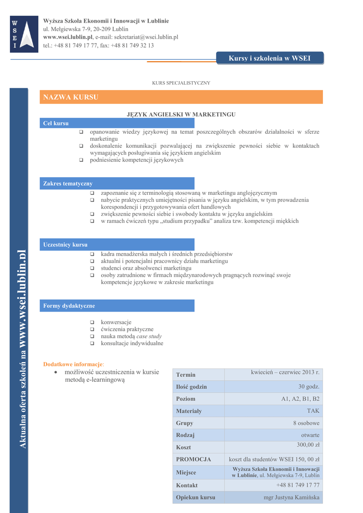 Wyższa Szkoła Ekonomii i Innowacji w Lublinie ul. Mełgiewska 7-9, 20-209 Lublin www.wsei.lublin.pl, e-mail: [email protected] tel.: +48 81 749 17 77, fax: +48 81 749 32 13 Kursy i szkolenia w WSEI KURS SPECJALISTYCZNY NAZWA KURSU JĘZYK ANGIELSKI W MARKETINGU Cel kursu opanowanie wiedzy językowej na temat poszczególnych obszarów działalności w sferze marketingu doskonalenie komunikacji pozwalającej na zwiększenie pewności siebie w kontaktach wymagających posługiwania się językiem angielskim podniesienie kompetencji językowych Zakres tematyczny zapoznanie się z terminologią stosowaną w marketingu anglojęzycznym nabycie praktycznych umiejętności pisania w języku angielskim, w tym prowadzenia korespondencji i przygotowywania ofert handlowych zwiększenie pewności siebie i swobody kontaktu w języku angielskim w ramach ćwiczeń typu „studium przypadku” analiza tzw. kompetencji miękkich Aktualna oferta szkoleń na www.wsei.lublin.pl Uczestnicy kursu kadra menadżerska małych i średnich przedsiębiorstw aktualni i potencjalni pracownicy działu marketingu studenci oraz absolwenci marketingu osoby zatrudnione w firmach międzynarodowych pragnących rozwinąć swoje kompetencje językowe w zakresie marketingu Formy dydaktyczne konwersacje ćwiczenia praktyczne nauka metodą case study konsultacje indywidualne Dodatkowe informacje: możliwość uczestniczenia w kursie metodą e-learningową Termin Ilość godzin Poziom Materiały kwiecień – czerwiec 2013 r. 30 godz. A1, A2, B1, B2 TAK Grupy 8 osobowe Rodzaj otwarte Koszt PROMOCJA 300,00 zł koszt dla studentów WSEI 150, 00 zł Miejsce Wyższa Szkoła Ekonomii i Innowacji w Lublinie, ul. Mełgiewska 7-9, Lublin Kontakt +48 81 749 17 77 Opiekun kursu mgr Justyna Kamińska Wyższa Szkoła Ekonomii i Innowacji w Lublinie ul. Mełgiewska 7-9, 20-209 Lublin www.wsei.lublin.pl, e-mail: [email protected] tel.: +48 81 749 17 77, fax: +48 81 749 32 13 Aktualna oferta szkoleń na www.wsei.lublin.pl Kursy i szkolenia w WSEI