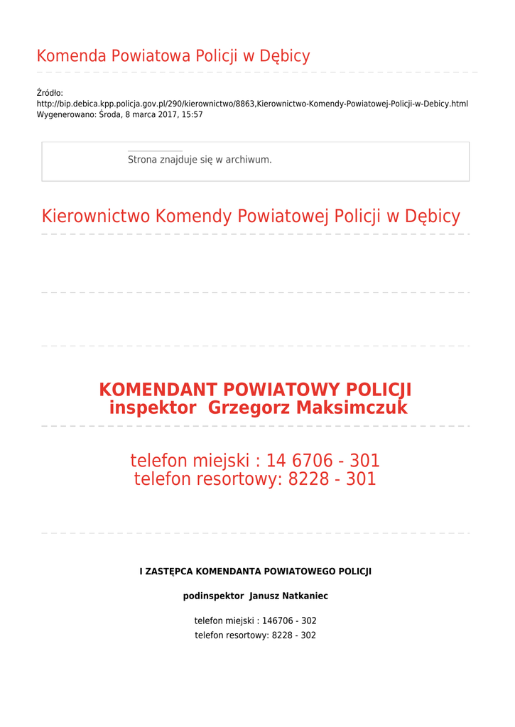 Komenda Powiatowa Policji w Dębicy Źródło: http://bip.debica.kpp.policja.gov.pl/290/kierownictwo/8863,Kierownictwo-Komendy-Powiatowej-Policji-w-Debicy.html Wygenerowano: Środa, 8 marca 2017, 15:57 Strona znajduje się w archiwum. Kierownictwo Komendy Powiatowej Policji w Dębicy KOMENDANT POWIATOWY POLICJI inspektor Grzegorz Maksimczuk telefon miejski : 14 6706 - 301 telefon resortowy: 8228 - 301 I ZASTĘPCA KOMENDANTA POWIATOWEGO POLICJI podinspektor Janusz Natkaniec telefon miejski : 146706 - 302 telefon resortowy: 8228 - 302 p.o. ZASTĘPCA KOMENDANTA POWIATOWEGO POLICJI kom. Andrzej Dragan telefon miejski: 146706 - 303 telefon resortowy: 8228 - 303 Metryczka Data publikacji 26.11.2009 Data modyfikacji 17.06.2016 Rejestr zmian Podmiot udostępniający informację: Biuletyn Informacji Publicznej Osoba wytwarzająca/odpowiadająca za informację: asp.szt. Wenancjusz Matysek Osoba udostępniająca informację: Uzupelnij dane redaktora Komenda Powiatowa Policji w Dębicy Osoba modyfikująca informację: Jacek Bator