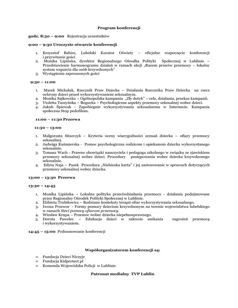 Program konferencji godz. 8:30 – 9:00 Rejestracja uczestników 9:00 – 9:30 Uroczyste otwarcie konferencji 1. Krzysztof Babisz, Lubelski Kurator Oświaty – oficjalne rozpoczęcie konferencji i przywitanie gości 2. Monika Lipińska, dyrektor Regionalnego Ośrodka Polityki Społecznej w Lublinie – Przedstawienie harmonogramu działań w ramach akcji „Razem przeciw przemocy – lokalny system wsparcia dla osób krzywdzonych” 3. Wystąpienia zaproszonych gości 9:30 – 11:00 1. Marek Michalak, Rzecznik Praw Dziecka – Działania Rzecznika Praw Dziecka na rzecz ochrony dzieci przed wykorzystywaniem seksualnym. 2. Monika Sajkowska – Ogólnopolska kampania „Zły dotyk” – cele, działania, przekaz kampanii. 3. Violetta Tuszyńska – Bogucka – Psychologiczne aspekty przemocy seksualnej wobec dzieci. 4. Jakub Śpiewak - Zapobiegnie wykorzystywaniu seksualnemu w Internecie. Kampania społeczna Stop pedofilom. 11:00 – 11:30 Przerwa 11:30 – 13:00 1. Małgorzata Sitarczyk – Kryteria oceny wiarygodności zeznań dziecka – ofiary przemocy seksualnej. 2. Jadwiga Kuśmierska - Pomoc psychologiczna rodzicom i opiekunom dziecka wykorzystanego seksualnie. 3. Tomasz Wach - Prawne obowiązki nauczyciela i pedagoga szkolnego w związku ze zjawiskiem przemocy seksualnej wobec dzieci. Procedury postępowania wobec dziecka krzywdzonego seksualnie. 4. Edyta Naja – Pasek Procedura „Niebieska karta” i jej zastosowanie w sprawach dotyczących przemocy seksualnej wobec dziecka. 13:00 – 13:30 Przerwa 13:30 – 14:45 1. Monika Lipińska – Lokalna polityka przeciwdziałania przemocy - działania podejmowane przez Regionalny Ośrodek Polityki Społecznej w Lublinie. 2. Elżbieta Trubiłowicz – Rodzinne konteksty terapii ofiar wykorzystywania seksualnego. 3. Iwona Przewor - Formy pomocy dzieciom krzywdzonym na terenie województwa lubelskiego w ramach Sieci pomocy ofiarom przemocy. 4. Wiesław Krupa – Przemoc wobec dziecka niepełnosprawnego. 5. Dorota Pawelec – Edukacja dzieci w zakresie unikania zagrożeń przemocą i wykorzystywaniem. 14:45 – 15:00 Podsumowanie konferencji Współorganizatorem konferencji są: • • • Fundacja Dzieci Niczyje Fundacja Kidprotect.pl Komenda Wojewódzka Policji w Lublinie Patronat medialny TVP Lublin