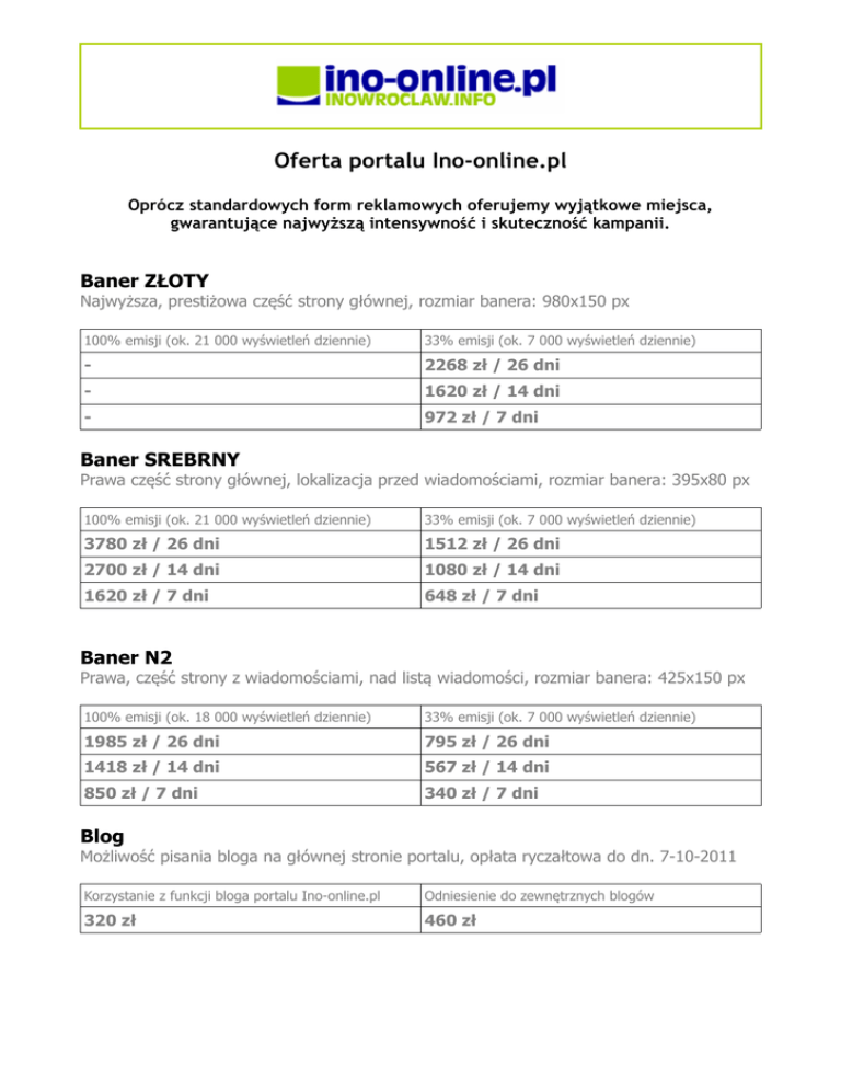 Oferta portalu Ino-online.pl Oprócz standardowych form reklamowych oferujemy wyjątkowe miejsca, gwarantujące najwyższą intensywność i skuteczność kampanii. Baner ZŁOTY Najwyższa, prestiżowa część strony głównej, rozmiar banera: 980x150 px 100% emisji (ok. 21 000 wyświetleń dziennie) 33% emisji (ok. 7 000 wyświetleń dziennie) - 2268 zł / 26 dni - 1620 zł / 14 dni - 972 zł / 7 dni Baner SREBRNY Prawa część strony głównej, lokalizacja przed wiadomościami, rozmiar banera: 395x80 px 100% emisji (ok. 21 000 wyświetleń dziennie) 33% emisji (ok. 7 000 wyświetleń dziennie) 3780 zł / 26 dni 1512 zł / 26 dni 2700 zł / 14 dni 1080 zł / 14 dni 1620 zł / 7 dni 648 zł / 7 dni Baner N2 Prawa, część strony z wiadomościami, nad listą wiadomości, rozmiar banera: 425x150 px 100% emisji (ok. 18 000 wyświetleń dziennie) 33% emisji (ok. 7 000 wyświetleń dziennie) 1985 zł / 26 dni 795 zł / 26 dni 1418 zł / 14 dni 567 zł / 14 dni 850 zł / 7 dni 340 zł / 7 dni Blog Możliwość pisania bloga na głównej stronie portalu, opłata ryczałtowa do dn. 7-10-2011 Korzystanie z funkcji bloga portalu Ino-online.pl Odniesienie do zewnętrznych blogów 320 zł 460 zł Formy standardowe: MEGA BUTTON Rozmiar banera: 280x120 px, lokalizacja: prawa, górna część strony głównej 14 dni 30 dni 60 dni 90 dni 180 dni 1000 emisji/dzień 165 zł 330 zł 660 zł 941 zł 1 683 zł 1500 emisji/dzień 248 zł 495 zł 990 zł 1 411 zł 2 525 zł 2000 emisji/dzień 330 zł 660 zł 1 320 zł 1 881 zł 3 366 zł 3000 emisji/dzień 495 zł 990 zł 1 980 zł 2 822 zł 5 049 zł MINI BUTTON Rozmiar banera: 100x100 px, lokalizacja: lewa, górna część strony głównej stała emisja ok. 20000 emisji/dzień 14 dni 30 dni 60 dni 90 dni 180 dni 308 zł 660 zł 1 320 zł 1 880 zł 3 360 zł Podane ceny netto (+23% Vat) Ino-online Media Kontakt: 0 504 106 149 [email protected], Inowrocław, ul. Św. Mikołaja 25