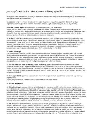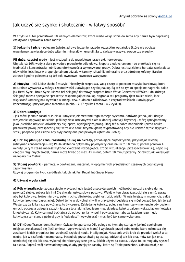 Artykuł pobrano ze strony eioba.pl Jak uczyć się szybko i skutecznie - w łatwy sposób? W artykule autor przedstawia 10 ważnych elementów, które warto wziąć sobie do serca aby nauka była naprawdę efektywna i sprawiała Tobie radość. 1) Jedzenie i picie - polecam świeże, zdrowe jedzenie, przede wszystkim wegańskie (które nie obciąża organizmu), zawierające dużo witamin, minerałów i energii. Są to świeże warzywa, owoce czy orzechy. Pij dużo, czystej wody – jest niezbędna do prawidłowej pracy ukł. nerwowego. Ubytek już 10% wody z ciała powoduje przewlekłe bóle głowy, kłopoty z oddychaniem – co przekłada się na trudności z koncentracją i obniżoną efektywnością wykonywanej pracy. Dobra jest też zielona herbata zawierająca niewielkie ilości lecz w proporcjonalnym udziale witaminy, składniki mineralne oraz odrobinę kofeiny. Bardzo zdrowe i godne polecenia są też soki owocowe i owocowo-warzywne. 2) Muzyka - jeśli lubisz słuchać muzyki (niektórych rozprasza, wolą ciszę) to polecam muzykę barokową, która naturalnie wytwarza w mózgu częstotliwości ułatwiające szybką naukę. Są też na rynku specjalne nagrania, takie jak Hemi Sync i Brain Sync. Można też ściągnąć darmowy program Brain Wave Generator (BWGen), do którego ściągnąć można specjalne "presenty" wspomagające naukę. Nagrania te i programy (jest takich wiele, lecz większość komercyjna) wywołują w mózgu tzw. dudnienia różnicowe, o częstotliwościach ułatwiających koncentrację i przyswajanie materiału (alpha – 7-17 cykli/s i theta – 4-7 cykli/s). 3) Dobra kondycja - jak mówi jedna z zasad NLP, ciało i umysł są elementami tego samego systemu. Zarówno jedno, jak i drugie wzajemnie wpływają na siebie. Jeśli będziesz utrzymywał ciało w dobrej kondycji fizycznej – mózg (przyjmowany jako „siedziba umysłu” odwdzięczy się lepszą, wydajniejszą pracą. Dbaj też o dobre natlenienie (przed nauką przewietrz pokuj, przespaceruj się; w trakcie nauki trzymaj głowę wyprostowaną aby nie uciskać tętnic szyjnych stosuj podpórki pod książki aby były nachylone pod pewnym kątem do Ciebie). 4) Ucz się planując czas, rozkładaj naukę na okresy, pozwalające najefektywniej przyswajać wiedzę (utrzymać koncentrację) - wg Paula McKenna optymalny pojedynczy czas nauki to 18 minut, potem przerwa 4 minuty (w tym czasie możesz wykonać ćwiczenia rozciągające, zrobić wizualizację, przespacerować się, napić się czegoś). Wg innych źródeł, nauka może trwać do max. 45 minut, potem 10 minut przerwy. Sprawdź jaki okres jest najlepszy dla Ciebie! 5) Stosuj powtórki - pamiętaj o powtarzaniu materiału w optymalnych przedziałach czasowych (wg krzywej zapominania). Używaj programów typu card-flash, takich jak Full Recall lub Super Memo. 6) Używaj wyobraźni! a) Rób wizualizacje- zobacz siebie w sytuacji gdy jesteś u szczytu swoich możliwości, poczuj z siebie dumę, pewność siebie, zobacz jak inni Cię chwalą, usłysz słowa podziwu. Wejdź w ten obraz (zasocjuj się z nim), spraw aby był kolorowy, trójwymiarowy, pełen ruchu, dźwięków, głębi, ostrości, wielki! W najsilniejszym momencie, załóż kotwice (zrób neuroasocjację). Dzięki temu w dowolnej chwili w przyszłości będziesz się mógł poczuć tak, jak teraz! Wystarczy że kilka razy powtórzysz to ćwiczenie. Zakładanie kotwicy, polega na tym - że w momencie gdy poziom emocji, odczucia osiągają szczyt - łączysz to z jakimś bodźcem - np. składasz kciuk z palcem wskazującym (kotwica kinestetyczna). Kotwica musi być łatwa do odtworzenia i w pełni powtarzalna - aby za każdym razem gdy kotwiczysz ten stan, a później gdy ją "odpalasz" (wywołujesz) - musi być tak samo wykonana. b) DTI (Deep Trance Identification)- ćwiczenie oparte na DTI, polega na tym aby stanąć w jakimś spokojnym miejscu, zrelaksować się (jeśli umiesz – wprowadź się w trans) i wyobrazić przed sobą osobę która odznacza się zasobami jakich pragniesz (np. zdolność szybkiej nauki, inteligencja). Następnie zrób krok do przodu i wejdź w tą osobę, jak w skafander kosmonauty. Poczuj się przez chwilę tą osobą, oddychaj tak jak ona, mów tak jak ona, uśmiechaj się tak jak ona, wykonuj charakterystyczne gesty, jakich używa ta osoba, usłysz to, co mogłaby słyszeć ta osoba. Poproś swój nieświadomy umysł, aby przejął te zasoby, które są Tobie potrzebne, zainstalował je na głębokim poziomie, dzięki czemu w każdej chwili w przyszłości będziesz mógł z nich skorzystać. Podziękuj też osobie w którą wszedłeś, za to że podzieliła się z Tobą tymi zasobami. Teraz wykonaj krok do tyłu wracając do poprzedniej pozycji. Daj czas swojemu umysłowi aby dokończył instalować te nowe zasoby, które od teraz też będziesz posiadać. Zakończ ćwiczenie, wracając do pełnej świadomości ze wspaniałym humorem i nowymi zasobami :) 7) Wzmacniaj swoją motywację - dzięki temu łatwiej i skuteczniej będziesz się uczył. Pamiętaj o kiju i marchewce (kara i nagroda - co stanie się, gdy tego nie zrobisz, a co zyskasz jeśli to zrobisz), stosuj przede wszystkim to, co działa na Ciebie lepiej. 8) Używaj map myśli - to naturalny sposób w jaki pracuje twój mózg (asocjacje), wzmaga kreatywność, nie stwarza limitów tak jak linearne notatki. Przykładową mapę myśli (opisującą te techniki) znajdziesz tutaj: Mapy Myśli 9) Trzymaj informacje w kilku systemach reprezentacji (V – wzrokowym, A – słuchowym i K – Kinestetycznym) - stosuj wizualizacje (twórz obrazy), słuchaj dźwięków, dotykaj, smakuj, wąchaj - kojarz nowe informacje z jak największą ilością zmysłów. Dzięki temu, łatwiej i szybciej wydobędziesz informacje gdy będziesz ich potrzebował. 10) Sporządzaj drzewa wiedzy - metoda polega na tym, że czytając np. książkę - z każdego rozdziału robisz kartkę z kilkoma, kilkunastoma punktami stresz
