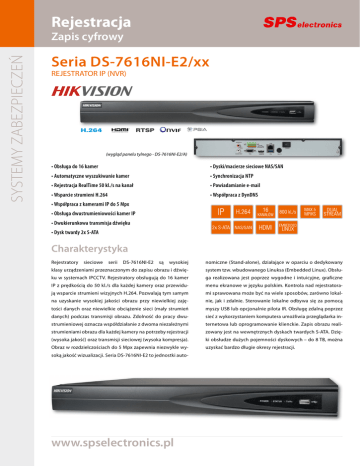 Rejestracja SYSTEMY ZABEZPIECZEŃ Zapis cyfrowy Seria DS-7616NI-E2/xx REJESTRATOR IP (NVR) H.264 RTSP (wygląd panelu tylnego - DS-7616NI-E2/A) • Obsługa do 16 kamer • Dyski/macierze sieciowe NAS/SAN • Automatyczne wyszukiwanie kamer • Synchronizacja NTP • Rejestracja RealTime 50 kl./s na kanał • Powiadamianie e-mail • Wsparcie strumieni H.264 • Współpraca z DynDNS • Współpraca z kamerami IP do 5 Mpx • Obsługa dwustrumieniowości kamer IP • Dwukierunkowa transmisja dźwięku • Dysk twardy 2x S-ATA Charakterystyka wysokiej nomiczne (Stand-alone), działające w oparciu o dedykowany klasy urządzeniami przeznaczonym do zapisu obrazu i dźwię- system tzw. wbudowanego Linuksa (Embedded Linux). Obsłu- ku w systemach IPCCTV. Rejestratory obsługują do 16 kamer ga realizowana jest poprzez wygodne i intuicyjne, graficzne IP z prędkością do 50 kl./s dla każdej kamery oraz przewidu- menu ekranowe w języku polskim. Kontrola nad rejestratora- ją wsparcie strumieni wizyjnych H.264. Pozwalają tym samym mi sprawowana może być na wiele sposobów, zarówno lokal- na uzyskanie wysokiej jakości obrazu przy niewielkiej zaję- nie, jak i zdalnie. Sterowanie lokalne odbywa się za pomocą tości danych oraz niewielkie obciążenie sieci (mały strumień myszy USB lub opcjonalnie pilota IR. Obsługę zdalną poprzez danych) podczas transmisji obrazu. Zdolność do pracy dwu- sieć z wykorzystaniem komputera umożliwia przeglądarka in- strumieniowej oznacza współdziałanie z dwoma niezależnymi ternetowa lub oprogramowanie klienckie. Zapis obrazu reali- strumieniami obrazu dla każdej kamery na potrzeby rejestracji zowany jest na wewnętrznych dyskach twardych S-ATA. Dzię- (wysoka jakość) oraz transmisji sieciowej (wysoka kompresja). ki obsłudze dużych pojemności dyskowych – do 8 TB, można Obraz w rozdzielczościach do 5 Mpx zapewnia niezwykle wy- uzyskać bardzo długie okresy rejestracji. Rejestratory sieciowe serii DS-7616NI-E2 są soką jakość wizualizacji. Seria DS-7616NI-E2 to jednostki auto- www.spselectronics.pl DANE TECHNICZNE Maks. liczba obsługiwanych kamer DS-7616NI-E2/A DS-7616NI-E2/8N Maks. prędkość rejestracji 800 kl./s, (50 kl./s na kanał) Maks. rozdzielczość rejestracji z kamer IP 5 Mpx Pasmo wejściowe 100 Mb/s Pasmo wyjściowe 80 Mb/s Interfejsy komunikacyjne DS-7616NI-E2/8P/A 16 kamer IP (strumienie wizyjne i dźwiękowe), wsparcie dwustrumieniowości wizji kamer (DualStream), dwukierunkowa transmisja dźwięku Ethernet 1 Gb/s (RJ-45), 2x USB Ethernet 1 Gb/s (RJ-45), 8x Ethernet 100 Mb/s (RJ-45), 2x USB Wyjścia wizyjne główne Ethernet 1 Gb/s (RJ-45), 8x PoE (af/at) Ethernet 100 Mb/s (RJ-45), 2x USB HDMI, VGA Wejście dźwiękowe 1x Audio (RCA); 1 kΩ/2 Vpp (+ wejścia kamer IP) Wyjścia dźwiękowe 1x Audio (RCA), 600 Ω/liniowe (+ wyjścia kamer IP) Wejścia alarmowe 4 (+ wejścia kamer IP) (wejścia kamer IP) 4 (+ wejścia kamer IP) Wyjście alarmowe 1 (+ wyjścia kamer IP) (wyjścia kamer IP) 1 (+ wyjścia kamer IP) Obsługiwane sieci LAN/MAN/WAN/Internet Protokoły sieciowe TCP, UDP, RTP, DHCP, DDNS, SMTP, NTP, PPPoE, SADP, SNMP, NFS, iSCSI, UPnP, IPv6, RTSP ONVIF, PSIA, CGI System operacyjny Embedded Linux Rejestracja Tryby rejestracji Monitorowanie zdarzeń Akcje zdarzeniowe Data/czas Inne funkcje/ustawienia Obsługa lokalna Obsługa i konfiguracja poprzez sieć IP Oprogramowanie współpracujące (freeware) Zasilanie Pobór mocy Temp./wilgotność pracy Wymiary (szer. x wys. x gł.) Waga Rejestracja obrazu/dźwięku, udostępnianie obrazu/dźwięku na żywo oraz nagrań użytkownikom zdalnym, monitorowanie zdarzeń i ich rejestracja w dzienniku, wykonywanie akcji zdarzeniowych, powiadamianie użytkowników zdalnych o zdarzeniach, sterowanie kamerami obrotowymi, sterowanie urządzeniami wykonawczymi Dysk twardy 2 x S-ATA o pojemności do 8 TB, NAS (NFS), SAN (iSCSI) Ręczna, harmonogram; Ciągła, z detekcją ruchu (z zapisem przed i po detekcji), alarmowa (z zapisem przed- i poalarmowym); Liniowa (do zapełnienia), cykliczna (nadpisywanie); Funkcja zabezpieczania wybranych nagrań usunięciem oraz dysków przed nadpisaniem. Alarm, detekcja ruchu, sabotaż, awaria rejestracji, awaria dysku, zapełnienie dysku, awaria sieci IP, konflikt adresów IP, próba nieuprawnionego logowania Uruchomienie rejestracji, sygnalizacja dźwiękowa, wysłanie komunikatu e-mail, powiadomienie centrum monitorowania, wysterowanie wyjścia alarmowego, wysterowanie kamery obrotowej Ręcznie (automatyczne strefy czasowe), synchronizacja z komputerem, NTP Indywidualnie konfigurowalne uprawnienia użytkowników. Maskowanie fragmentów obrazu z kamer. Kopiowanie/ładowanie ustawień rejestratora. Wbudowany serwer WWW (WebServer). Mysz USB, opcjonalnie pilot IR Komputer: przeglądarka internetowa, oprogramowanie klienckie Urządzenia mobilne (telefon komórkowy, smartfon, tablet): mobilna aplikacja kliencka iVMS-4200 (Windows i MacOS) – oprogramowanie klienckie (obsługa 256 rejestratorów), funkcjonalność: konfiguracja rejestratorów, sterowanie pracą, podgląd obrazu „na żywo”, odtwarzanie nagrań, archiwizacja nagrań; nadzorowanie stanu/zdarzeń rejestratorów, wykonywanie akcji zdarzeniowych, sterowanie kamerami obrotowymi, urządzeniami wykonawczymi; webVMS – przeglądarka internetowa Internet Explorer, Mozilla Firefox, Google Chrome, Apple Safari (obsługa 1 rejestratora), funkcjonalność zbliżona do iVMS.; iVMS-4500 – aplikacja kliencka (obsługa 16 rejestratorów) na urządzenia mobilne (telefon komórkowy, smartfon, tablet): podgląd „na żywo” (platformy: iPhone, Android); StreamServer – serwer strumieni; IPServer – serwer DDNS; VSPlayer – odtwarzacz nagrań archiwalnych; Local Playback – odtwarzacz nagrań z dysków twardych; Format Converter – konwerter formatu wideo; IP Finder – lokalizator urządzeń w sieci; DiskCalculator – kalkulator dysków/czasu rejestracji; API/SDK – narzędzia programistyc