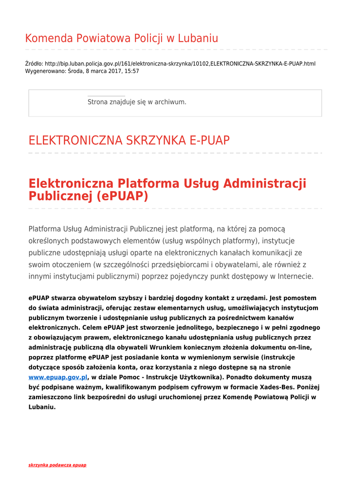 Komenda Powiatowa Policji w Lubaniu Źródło: http://bip.luban.policja.gov.pl/161/elektroniczna-skrzynka/10102,ELEKTRONICZNA-SKRZYNKA-E-PUAP.html Wygenerowano: Środa, 8 marca 2017, 15:57 Strona znajduje się w archiwum. ELEKTRONICZNA SKRZYNKA E-PUAP Elektroniczna Platforma Usług Administracji Publicznej (ePUAP) Platforma Usług Administracji Publicznej jest platformą, na której za pomocą określonych podstawowych elementów (usług wspólnych platformy), instytucje publiczne udostępniają usługi oparte na elektronicznych kanałach komunikacji ze swoim otoczeniem (w szczególności przedsiębiorcami i obywatelami, ale również z innymi instytucjami publicznymi) poprzez pojedynczy punkt dostępowy w Internecie. ePUAP stwarza obywatelom szybszy i bardziej dogodny kontakt z urzędami. Jest pomostem do świata administracji, oferując zestaw elementarnych usług, umożliwiających instytucjom publicznym tworzenie i udostępnianie usług publicznych za pośrednictwem kanałów elektronicznych. Celem ePUAP jest stworzenie jednolitego, bezpiecznego i w pełni zgodnego z obowiązującym prawem, elektronicznego kanału udostępniania usług publicznych przez administrację publiczną dla obywateli Wrunkiem koniecznym złożenia dokumentu on-line, poprzez platformę ePUAP jest posiadanie konta w wymienionym serwisie (instrukcje dotyczące sposób założenia konta, oraz korzystania z niego dostępne są na stronie www.epuap.gov.pl, w dziale Pomoc - Instrukcje Użytkownika). Ponadto dokumenty muszą być podpisane ważnym, kwalifikowanym podpisem cyfrowym w formacie Xades-Bes. Poniżej zamieszczono link bezpośredni do usługi uruchomionej przez Komendę Powiatową Policji w Lubaniu. skrzynka podawcza epuap Metryczka Data publikacji 10.05.2010 Rejestr zmian Podmiot udostępniający informację: Biuletyn Informacji Publicznej Osoba wytwarzająca/odpowiadająca za informację: Justyna Bujakiewicz-Rodzeń Osoba udostępniająca informację: Anna Włoszczyk Wydział Prewencji i RD Osoba modyfikująca informację: