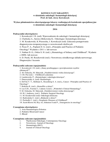 KONSULTANT KRAJOWY w dziedzinie onkologii i hematologii dziecięcej Prof. dr hab. Jerzy Kowalczyk Wykaz piśmiennictwa obowiązującego lekarzy realizujących kształcenie specjalizacyjne w dziedzinie onkologii i hematologii dziecięcej 2016 Podręczniki obowiązkowe 1. Kowalczyk J. R. (red): Wprowadzenie do onkologii i hematologii dziecięcej 2. Chybicka A., Sawicz-Birkowska K.: Onkologia i hematologia dziecięca 3. M. Krzakowski, K.Warzocha, J. Kowalczyk (red): Zalecenia postępowania diagnostyczno-terapeutycznego w nowotworach złośliwych 4. Pizzo P. A., Poplack D. G. (red.) „Principles and Practice of Pediatric Oncology" Wydanie z 2011 r. lub nowsze 5. Nathan D. G., Orkin S. H. (red.) „Hematology of Infancy and Childhood". Wydanie z 2009r. lub nowsze 6. D. Perek, M. Roszkowski (red.): Nowotwory ośrodkowego układu nerwowego. Diagnostyka i leczenie Podręczniki zalecane (opcjonalnie) 1. Kowalczyk J. R. (red.) „Stany przebiegające z powiększeniem węzłów chłonnych"". 2. M. Ochocka, M. Matysiak „Niedokrwistości wieku dziecięcego". 3. CH. Pui (red.) – Childhood Leukemias 4. Lanzkowsky P. „Hematologia i onkologia dziecięca". 5. Dmoszyńska A. (red): Hematologia 6. DeVita V. T., Hellman S., Rosenberg S. A. (red.)„ Cancer : Principles and Practice of Oncology". 7. Rokicka R. (red.) „Hemofilie u dzieci". 8. Lee G.R., Foerster J., Lukens J.(red.): „Wintrobe's Clinical Hematology". 9. M. Ochocka, M. Matysiak „Niedokrwistości wieku dziecięcego". 10. R.J. Andrassy, (red.): Pediatric Surgical Oncology 11. M. Krzakowski (red): Onkologia kliniczna 12. Radwańska U. (red.) „Białaczki u dzieci". 13. Pochedly C. (red.) „Neoplastic Diseases of Childhood". 14. Scott-Brown M, Roy AJ, Johnston S and P „ Emergencies in oncology” Czasopisma obowiązkowe 1. Acta Haematologica Polonica 2. Pediatric Blood and Cancer 3. Blood Czasopisma zalecane (opcjonalnie) 1. 2. 3. 4. Wpółczesna Onkologia. Contemporary Oncology Nowotwory. Journal of Oncology Hematologia (IHiT) Journal of Clinical Oncology 5. 6. 7. 8. 9. 10. Leukemia Bone Marrow Transplantation Biology of Blood and Marrow Transplantation Journal of Pediatric Hematology and Oncology Pediatria Polska Journal of Neurooncology Edukacyjne strony internetowe: www.hematoonkologia.pl www.pthit.pl www.siope.eu www.hematology.org www.ehaweb.org www.esh.org www.ebmt.org
