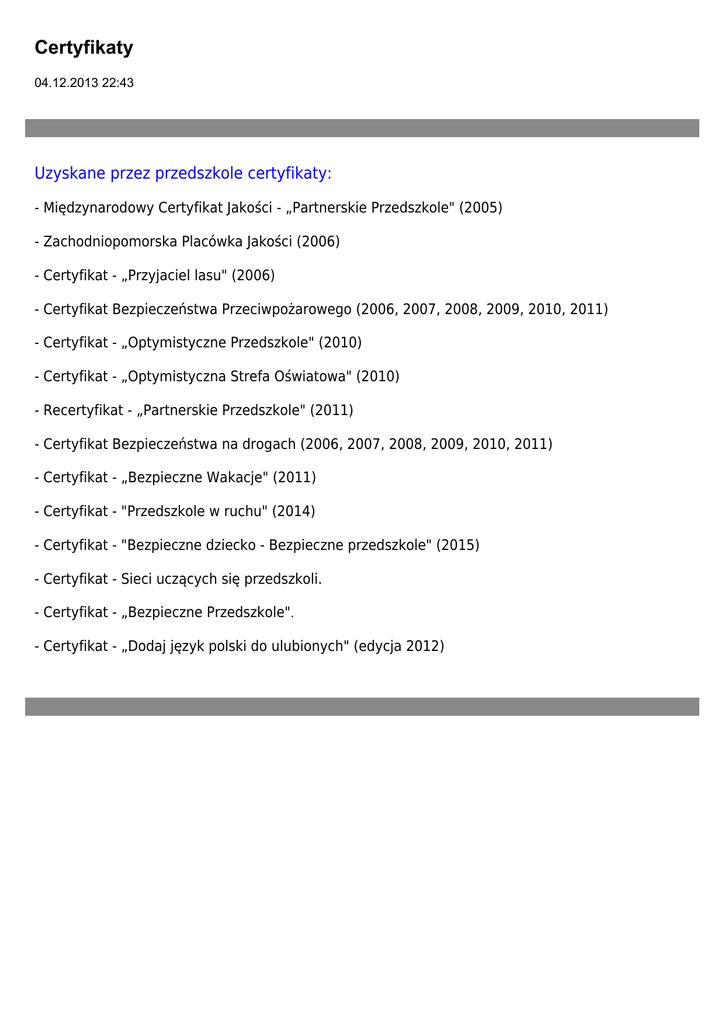 Certyfikaty 04.12.2013 22:43 Uzyskane przez przedszkole certyfikaty: - Międzynarodowy Certyfikat Jakości - „Partnerskie Przedszkole" (2005) - Zachodniopomorska Placówka Jakości (2006) - Certyfikat - „Przyjaciel lasu" (2006) - Certyfikat Bezpieczeństwa Przeciwpożarowego (2006, 2007, 2008, 2009, 2010, 2011) - Certyfikat - „Optymistyczne Przedszkole" (2010) - Certyfikat - „Optymistyczna Strefa Oświatowa" (2010) - Recertyfikat - „Partnerskie Przedszkole" (2011) - Certyfikat Bezpieczeństwa na drogach (2006, 2007, 2008, 2009, 2010, 2011) - Certyfikat - „Bezpieczne Wakacje" (2011) - Certyfikat - "Przedszkole w ruchu" (2014) - Certyfikat - "Bezpieczne dziecko - Bezpieczne przedszkole" (2015) - Certyfikat - Sieci uczących się przedszkoli. - Certyfikat - „Bezpieczne Przedszkole". - Certyfikat - „Dodaj język polski do ulubionych" (edycja 2012)