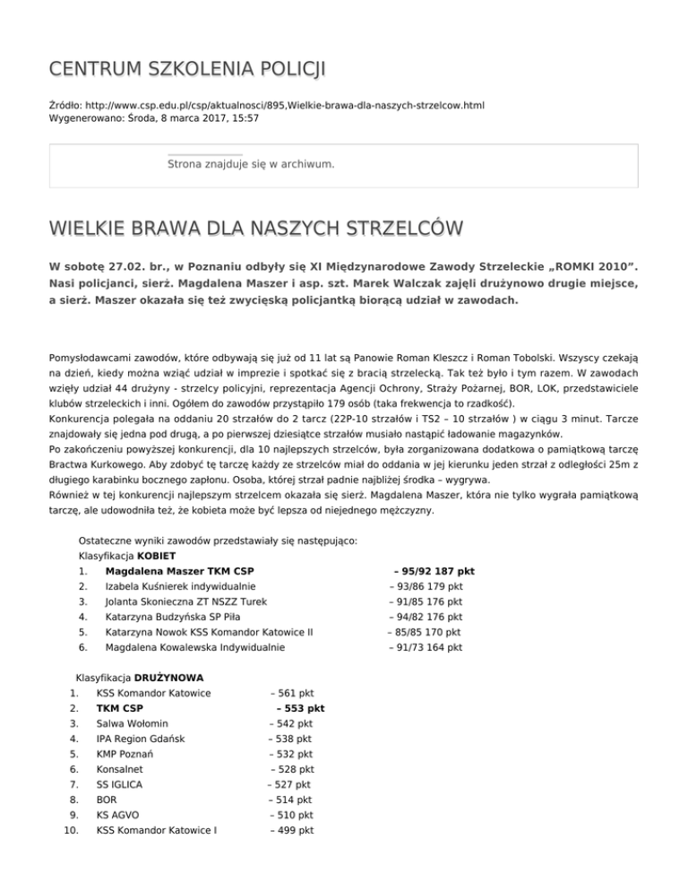 CENTRUM SZKOLENIA POLICJI Źródło: http://www.csp.edu.pl/csp/aktualnosci/895,Wielkie-brawa-dla-naszych-strzelcow.html Wygenerowano: Środa, 8 marca 2017, 15:57 Strona znajduje się w archiwum. WIELKIE BRAWA DLA NASZYCH STRZELCÓW W sobotę 27.02. br., w Poznaniu odbyły się XI Międzynarodowe Zawody Strzeleckie „ROMKI 2010”. Nasi policjanci, sierż. Magdalena Maszer i asp. szt. Marek Walczak zajęli drużynowo drugie miejsce, a sierż. Maszer okazała się też zwycięską policjantką biorącą udział w zawodach. Pomysłodawcami zawodów, które odbywają się już od 11 lat są Panowie Roman Kleszcz i Roman Tobolski. Wszyscy czekają na dzień, kiedy można wziąć udział w imprezie i spotkać się z bracią strzelecką. Tak też było i tym razem. W zawodach wzięły udział 44 drużyny - strzelcy policyjni, reprezentacja Agencji Ochrony, Straży Pożarnej, BOR, LOK, przedstawiciele klubów strzeleckich i inni. Ogółem do zawodów przystąpiło 179 osób (taka frekwencja to rzadkość). Konkurencja polegała na oddaniu 20 strzałów do 2 tarcz (22P-10 strzałów i TS2 – 10 strzałów ) w ciągu 3 minut. Tarcze znajdowały się jedna pod drugą, a po pierwszej dziesiątce strzałów musiało nastąpić ładowanie magazynków. Po zakończeniu powyższej konkurencji, dla 10 najlepszych strzelców, była zorganizowana dodatkowa o pamiątkową tarczę Bractwa Kurkowego. Aby zdobyć tę tarczę każdy ze strzelców miał do oddania w jej kierunku jeden strzał z odległości 25m z długiego karabinku bocznego zapłonu. Osoba, której strzał padnie najbliżej środka – wygrywa. Również w tej konkurencji najlepszym strzelcem okazała się sierż. Magdalena Maszer, która nie tylko wygrała pamiątkową tarczę, ale udowodniła też, że kobieta może być lepsza od niejednego mężczyzny. Ostateczne wyniki zawodów przedstawiały się następująco: Klasyfikacja KOBIET 1. Magdalena Maszer TKM CSP – 95/92 187 pkt 2. Izabela Kuśnierek indywidualnie – 93/86 179 pkt 3. Jolanta Skonieczna ZT NSZZ Turek – 91/85 176 pkt 4. Katarzyna Budzyńska SP Piła – 94/82 176 pkt 5. Katarzyna Nowok KSS Komandor Katowice II – 85/85 170 pkt 6. Magdalena Kowalewska Indywidualnie – 91/73 164 pkt Klasyfikacja DRUŻYNOWA 1. KSS Komandor Katowice 2. TKM CSP 3. Salwa Wołomin – 542 pkt 4. IPA Region Gdańsk – 538 pkt 5. KMP Poznań – 532 pkt 6. Konsalnet – 528 pkt 7. SS IGLICA – 527 pkt 8. BOR – 514 pkt 9. KS AGVO – 510 pkt KSS Komandor Katowice I – 499 pkt 10. – 561 pkt – 553 pkt Serdecznie gratulujemy! Hanna Grochowska Foto – W. Maszer Ocena: 0/5 (0) Tweetnij