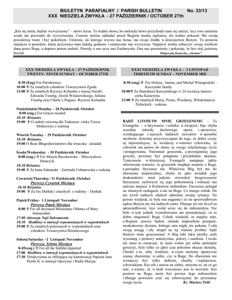 BIULETYN PARAFIALNY / PARISH BULLETIN No. 33/13 XXX NIEDZIELA ZWYKŁA - 27 PAŹDZIERNIK / OCTOBER 27th „Kto się uniża, będzie wywyższony” – mówi Jezus. To trudne słowa, bo niekiedy łatwo przychodzi nam się uniżyć, lecz owo uniżenie wcale nie prowadzi do wywyższenia. Czasem można zakładać przed Bogiem maskę nędzarza, ale trudno pokazać Mu swoją prawdziwą twarz i być pokornym. Uniżenie, do którego wzywa nas Jezus, ma swoje źródło w dziecięctwie Bożym. To postawa stanięcia w prawdzie, która przywraca nam ludzką godność i ostatecznie nas wywyższa. Najpierw trzeba zobaczyć swoją wielkość daną przez Boga, a dopiero potem małość. Prawdy o nas uczy nas Eucharystia. Ona nas przemienia i pokazuje, że bez niej jesteśmy bezrad. Małgorzata Konarska, „Oremus”. XXX NIEDZIELA ZWYKŁA – 27 PAŹDZIERNIK TWENTY- NINTH SUNDAY – OCTOBER 27TH 8:30 (Eng) For Parishioners 10:00 Za zmarłych członków Towarzystwa Zgoda 12:00 Za zmarłych Rycerzy Kolumba z naszej Parafii; Edwarda Twaróg, Józefa Wiśniowskiego, Juliana Twaróg oraz Charle’s Paqueo- Rycerze Kolumba Poniedziałek/Monday – 28 Październik /October 8:00 (eng.) For Graces needed 18:30 Różaniec 19:00 O radość wieczną dla Tadeusza- córka Teresa Miśkiewicz z rodziną Wtorek/Tuesday – 29 Październik /October 18:30 Różaniec 19:00 O Boże Błogosławieństwo dla wnuczka - dziadek Środa/Wednesday - 30 Październik /October 8:00 (eng.) For Maryla Buczkowska – Mieczysława Demrych 18:30 Różaniec 19:00 Za brata Edmunda – Gertruda Urbanowska z rodziną Czwartek/Thursday- 31 Październik /October Pierwszy Czwartek Miesiąca 18:30 Różaniec 19:00 Za Joe Durhak i zmarłych z rodziny – Durhak Piątek/Friday- 1 Listopad/ November Pierwszy Piątek Miesiąca 8:00 For all deceased Missionary Oblates of Mary Immaculate 17:00 Adoracja Najś Sakramentu 18:30 Modlitwy w intencji wspomnianych w wypominkach 19:00 Za zmarłych polecanych w wypominkach oraz członków Towarzystwa Różańcowego Sobota/Saturday –2 Listopad/ November Pierwsza Sobota Miesiąca 8:45(eng.) For all the faithful departed 17:00 Modlitwy w intencji wspomnianych w wypominkach 17:30 Dziękczynna za zbliżającą się kanonizację Papieża Jana Pawła II, w intencji Ojczyzny i Radia Maryja XXXI NIEDZIELA ZWYKŁA – 3 LISTOPAD THIRTIETH SUNDAY – NOVEMBER 3RD 8:30 (eng) For Helena , Janina, and Michal Winogrodzki – Kaczynski family 10:00 Za Stanisława Kaszyńskiego w 24 rocznicę śmierci córka Katarzyna 12:00 Za zmarłych Marię, Piotra, Wiesławę, Włodzimierza Dybickich – rodzina BĄDŹ LITOŚCIW MNIE GRZESZNEMU - Ta Ewangelia – o faryzeuszu i celniku w świątyni, bije chyba wszelkie rekordy duchowego oporu i sprzeciwu, wynikającego z naszych ludzkich nawyków w sposobie myślenia. Jesteśmy przyzwyczajeni do tego, że dobre czyny są najważniejsze, że świadczą o wartości człowieka, że człowiek ma prawo do dumy ze swego szlachetnego życia i postępowania. Natomiast grzesznik, a przynajmniej jego grzechy, powinny być potępione i przykładnie ukarane. Tymczasem w dzisiejszej Ewangelii następuje jakby odwrócenie wartości: to grzesznik znajduje uznanie u Boga, a porządny faryzeusz nie. Właściwie Bóg był mu do zbawienia niepotrzebny, chyba że jako świadek jego doskonałości: miał jedynie stwierdzić bezgrzeszność faryzeusza, zachwycić się jego pobożnością i wskazać mu należne miejsce w Królestwie niebieskim. Faryzeusz polegał na własnych zasługach, a nie na Bogu. Co innego celnik. On nie żywił żadnych złudzeń odnośnie swojej sytuacji. Na pewno wiedział, że była ona naganna i że na sprawiedliwym sądzie Bożym nie ma żadnych szans. Dlatego też nie liczył na sprawiedliwość, lecz wolał uciec się do miłosierdzia. Nie było w tym jednak wyrachowania ani premedytacji, za to dobra znajomość Boga. Celnik wiedział, że między nim, a Bogiem zawsze będzie istniała nieprzebyta przepaść, nieskończony dystans, którego sam nigdy nie pokona. I całą swoją uwagę i siły skupił na tej właśnie prośbie: bądź litościw mnie grzesznemu! A Bóg lubi takie prośby, jeśli wyrastają z postawy autentyzmu, pokory i zaufania. I wcale nie musi to oznaczać, że teraz wolno już sobie spokojnie grzeszyć, byle tylko co jakiś czas pokornie okazać skruchę. Chodzi o to, żeby wiedzieć, w czym możemy upatrywać szansę zbawienia: w sobie, czy w Bogu. Do zbawienia nie wystarczy być tylko dobrym, choćby i najlepszym, człowiekiem. Kto ufa i stawia na siebie, otrzyma to, na co go stać, a wiemy, że w skali wieczności jest to niewiele. Kto postawi na Boga, może być pewien Jego miłosierdzia i dlatego powinien czuć się zobowiązany do przemiany swego życia. Ks. Mariusz Pohl OGŁOSZENIA PARIAFIALNE UROCZYSTOŚĆ WSZYSTKICH ŚWIĘTYCH – Modlitwy za zmarłych i listopadowe wypominki za tych, których kochaliśmy za życia i którym obiecaliśmy modlitwę, będą odczytywane przed Mszą św. (z wyjątkiem Mszy Niedzielnych). Kopertki na wypominki wyłożone są w kościele. Proszę o wyraźne wypisywanie nazwisk – najlepiej drukowane. MODLITWY ZA ZMARŁYCH - Gardens of Gethsemani - w niedzielę 3 XI o godz. 14:30 – 15800; 32nd Ave., Surrey, - Mountain View - w niedzielę, 3 XI o godz. 15:00; 41st Ave. & Fraser - Ocean View - sobota, 2 XI o godz. 14:00; 4000 Imperial, Burnaby - Doroczna Msza Św. za zmarłych biskupów, kapłanów, zakonników i siostry zakonne – Vancouver, w czwartek, 7 XI o godz. 12:10 - w Katedrze Św. Różańca DAR ODPUSTU ZUPEŁNEGO - Nawiedzając z modlitwą kościół lub kaplicę w uroczystość Wszystkich Świętych oraz w Dniu Zadusznym, możemy pod zwykłymi warunkami uzyskać odpust zupełny, czyli całkowite darowanie kar dla dusz w czyśćcu cierpiących. Ponadto wypełniając określone warunki, możemy uzyskać odpust zupełny od 1 do 8 listopada za pobożne (czyli modlitewne) nawiedzenie cmentarza. Odpust zupełny możemy u